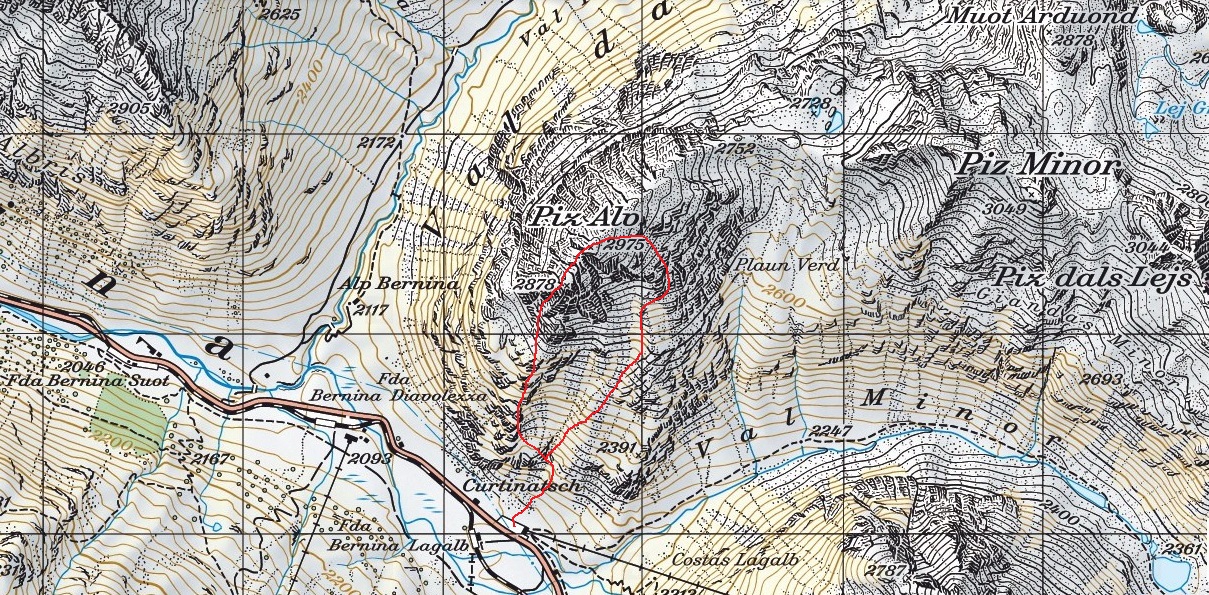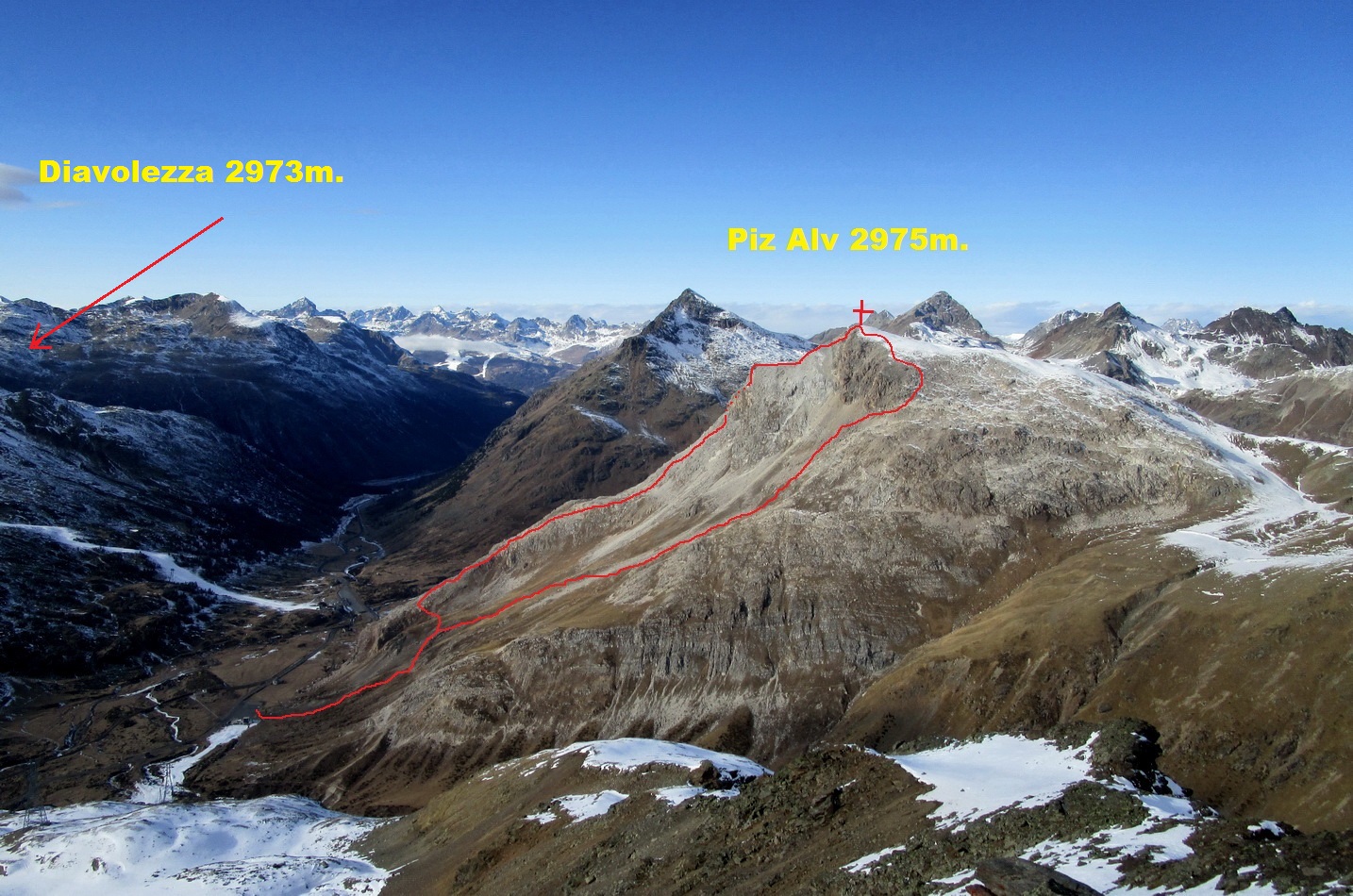 December roku 2015 sa zapíše ako veľmi suchý a na snehovú pokrývku lakomý mesiac. Po tréningu na zjazdovke na vrch Lagalb oproti Diavolezze neďaleko passo Bernina mi padol zrak na neďaleký kopec. Volá sa Piz Alv, vysoký je len tesne pod tri tisícky. Vedel som už dávnejšie, že je to taký Engadinský endemit. Nejakou geologickou náhodou je totiž celý z vápenca, rovnakého ako v Dolomitoch. Okolité hory zase o vápenci moc nepočuli...
