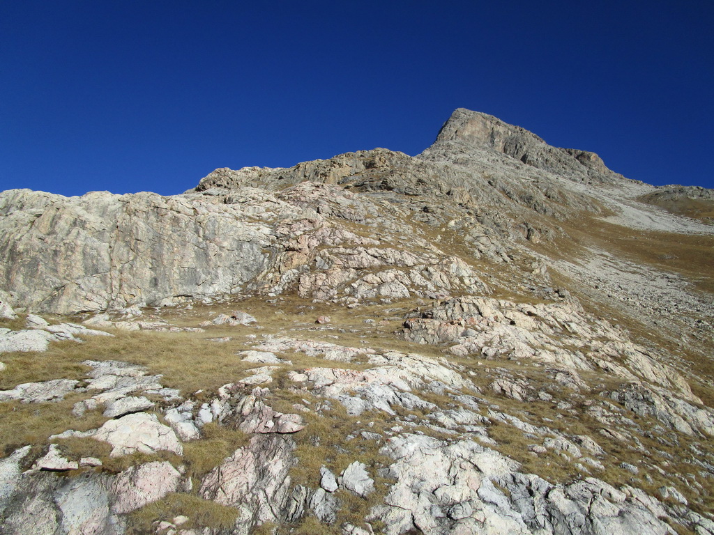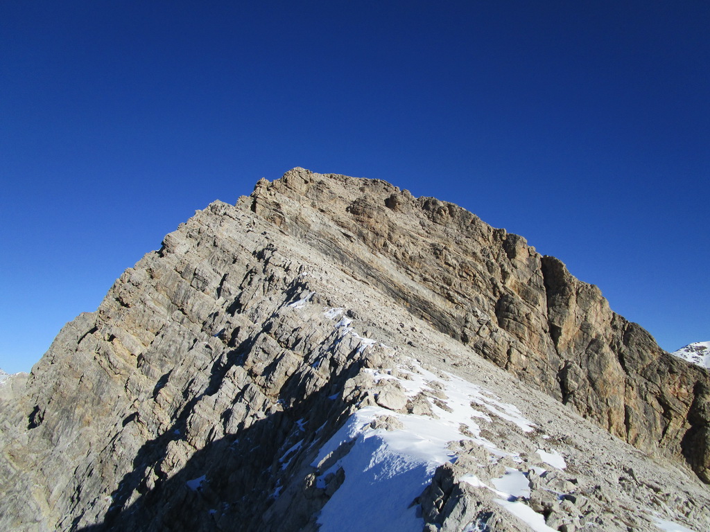 Otáčam sa a pokračujem na vrchol krásnym vzdušným hrebeňom. Prechádzam po naklonenej vápencovej platni. Výhľady na všetky strany. Berninské Alpy ako na dlani. Na druhú stranu Val de Fain a za kopčekmi dole je už Livigno. Desiatky kopcov na ktorých som ešte nebol... Celá Pizzeria ako vravieval Giorgio...