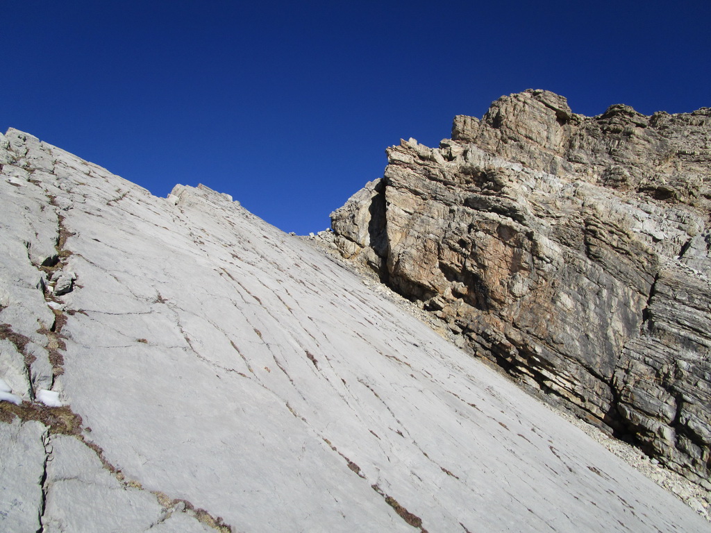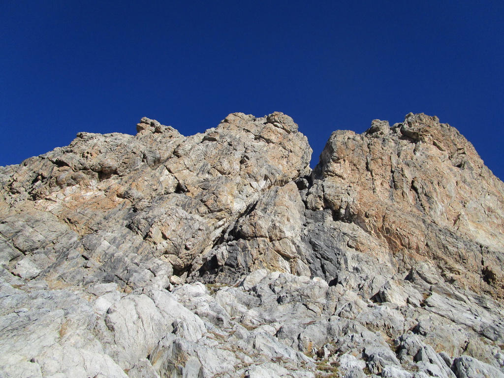 Preliezajúc občas nejakú stienku pokračujem po hrebeni blížiac sa k vrcholovej stene. Vidím výrazný zárez, mohlo by to ísť...