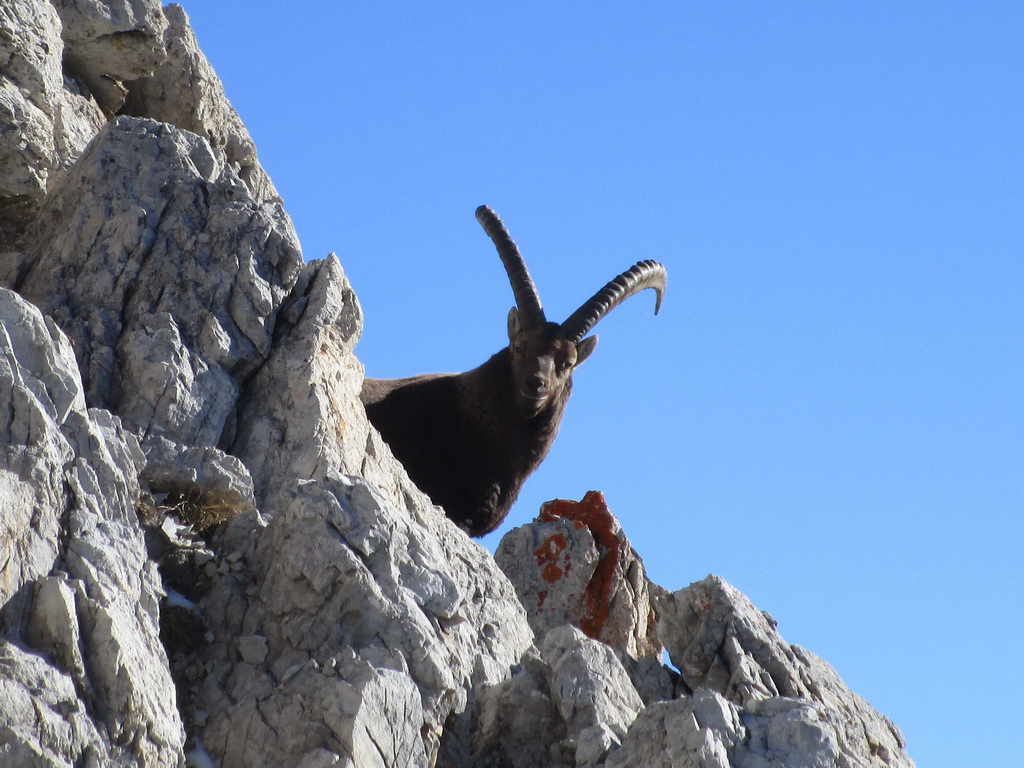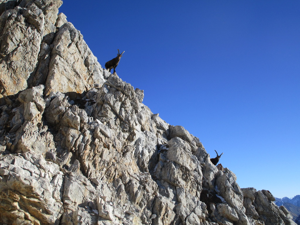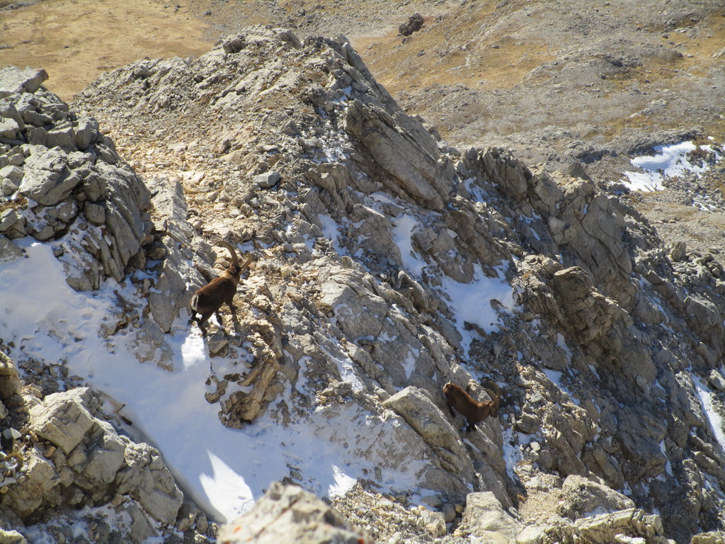 Vpravo vykukuje druhý, nechajú sa pekne vyfotiť zblízka. Obchádzam ich a keď som kúsok nad nimi tak začnú na moje veľké prekvapenie zostupovať žľabom ktorým som práve vyliezol. Nechápem, buď poznajú nejakú skratku alebo... Neverím, že šli dole tak ako som ja liezol hore...