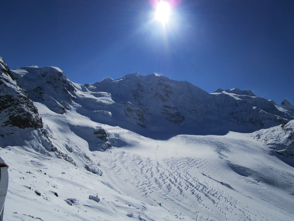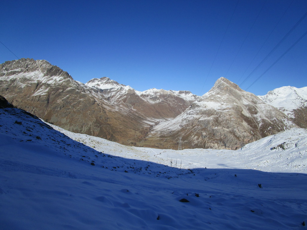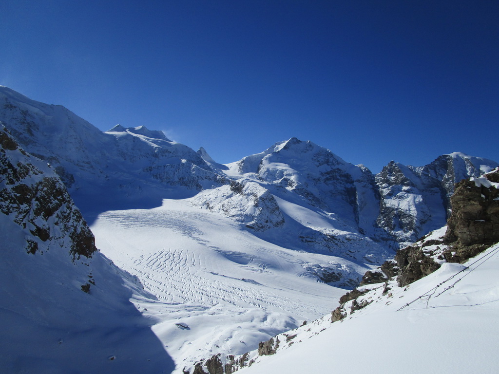 Idem aj ja. O chvíľu už šlapem svoje prvé metre. Čím vyššie som snehu pribúda. V hornej časti strediska ja pustená jedna krátka zjazdovka. Je tu len jedna sedačka. Pre pretekárov a rôzne kurzy stačí. V sobotu je tu plno. Vychutnávam si výhľady na Berninské Alpy. Ľadovec dostal v lete riadne na frak, v zime to na ňom bude zaujímavé... Klasická túra na Piz Palú, ktovie ako to s ňou dopadne. Pre vodcov to bude určite problém, je to ich najobľúbenejšia túra...