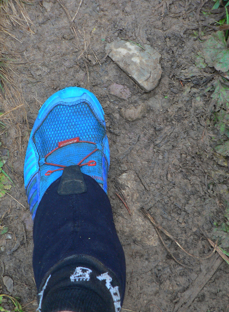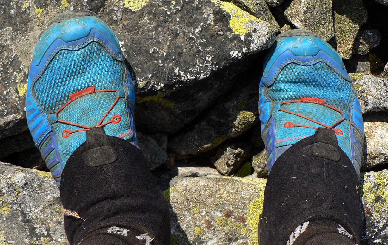 Medzitým mi na nohách pristáli aj Feline Ultra (Vnenky vďaka!). To sú mašiny také pohodlné ako papučky, že som ich neváhal vziať hneď (po troch dňoch chodenia po meste) na 200-kilometrovú ultraprechádzku :-))) Sú masívnejšie, so širšou (=ešte stabilnejšou) a nie takou agresívnou podrážkou. Teda dobré skôr na rýchlu turistiku a ultra na skalách. Alebo na dlhé šialenosti, nohy ako v bavlnke!