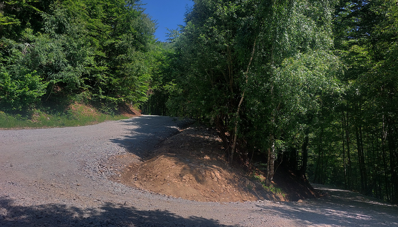 A ozaj: nie, že nový povrch, ale komplet opravená cesta, aj s novými odbočkami k chatám. Samozrejme ako je na Slovensku zvykom, len po rampu na hranici so šútovským chotárom, čiže nejaké dva kiláky. Ďalej po Zajacovú rozbitá klasika. Takto v lese – nebola by lepšia šotolina, keď už? Vo svete to funguje. Inak pozor! Autá tam už aj tak nesmú, len po nové parkoviská dole pri kempe (platené).