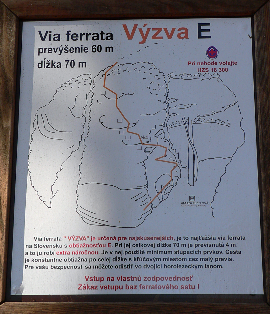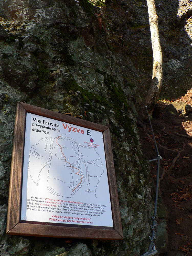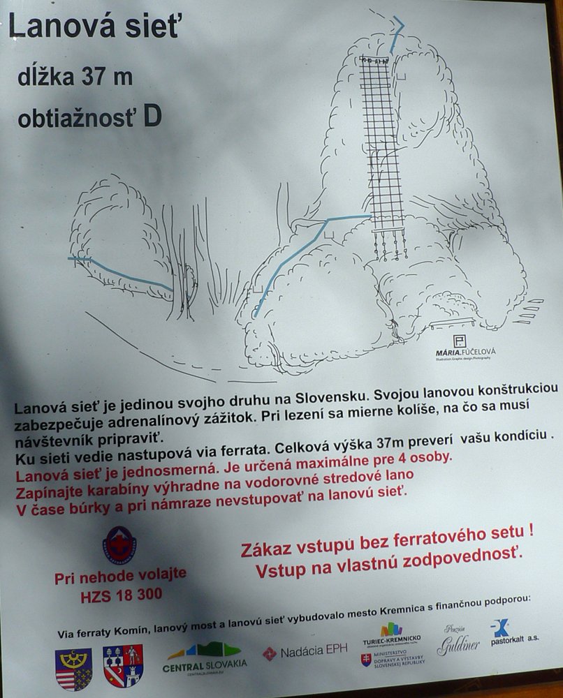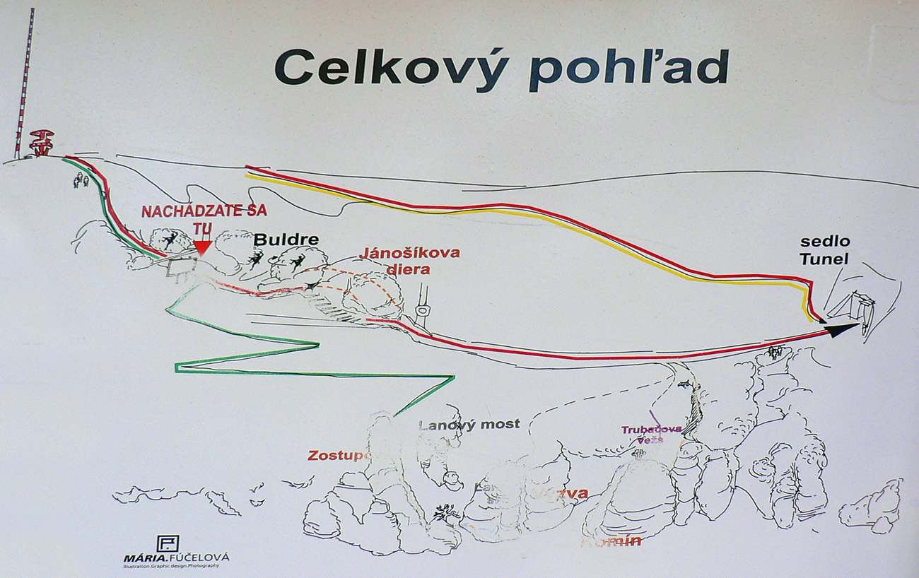 Srandovný je taký dáky politický podtón: Most a Sieť ako najznámejšie tunajšie pojmy :-) Ale je tu aj jedna skutočná Výzva – najťažšia ferrata na Slovensku s reálnou obtiažnosťou E. Najkrajší je ale jednoznačne Komín – pohodový, len miestami asi nič moc pre klaustrofobikov. V ňom je viac možností, kade stúpať: na začiatku po kolmom Rebríku alebo jednoduchším Jaskyniarskym variantom. Potom sa dá odbočiť na vzdušnú Trubačovu vežu s vrcholovým krížom a z nej ujsť „na pevninu“ ďalším adrenalínovým mostom. V závere Komína je ešte možné vyskúšať krátky, ale náročnejší Kominársky variant. Samotný zostup z hrebeňa k Sieti, Výzve a do Komína je poriadne strmý, takže je zaistený samostatnou ferratou (A, B) s Tibetským mostom na jej konci. Priamo na hrebeni je ešte cvičná ferratka Jánošíkova diera a komu by bolo teplo, aj neoznačená (zatiaľ?), ale zaistená puklina plná snehu. Hej, aj po dlhom lete je ho tam ešte dosť! K tomu lavičky a infotabule, všetko ako má byť.
