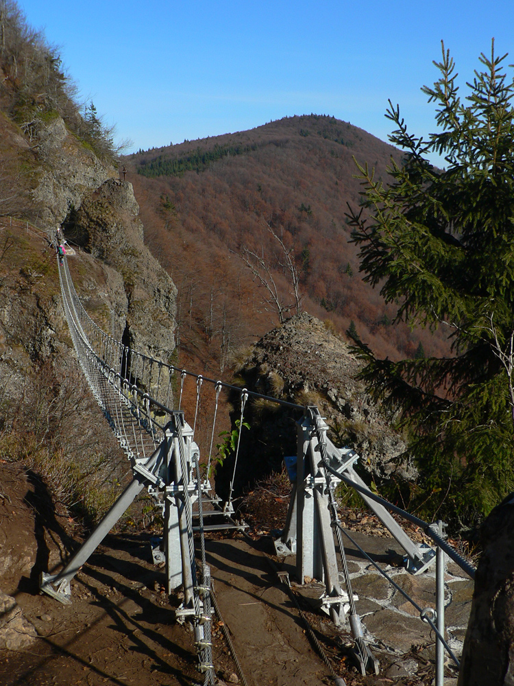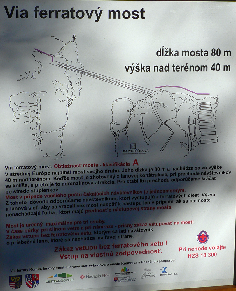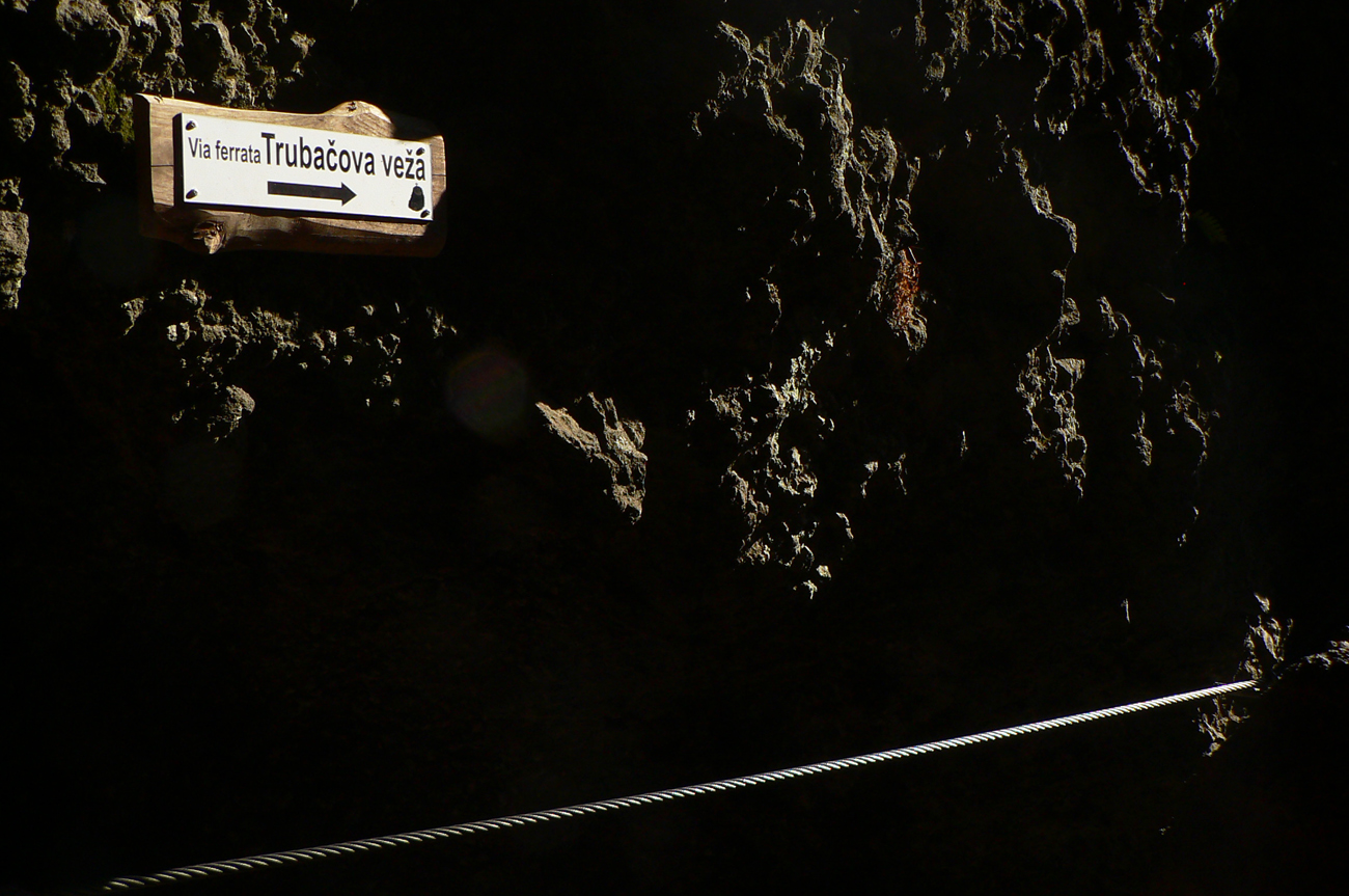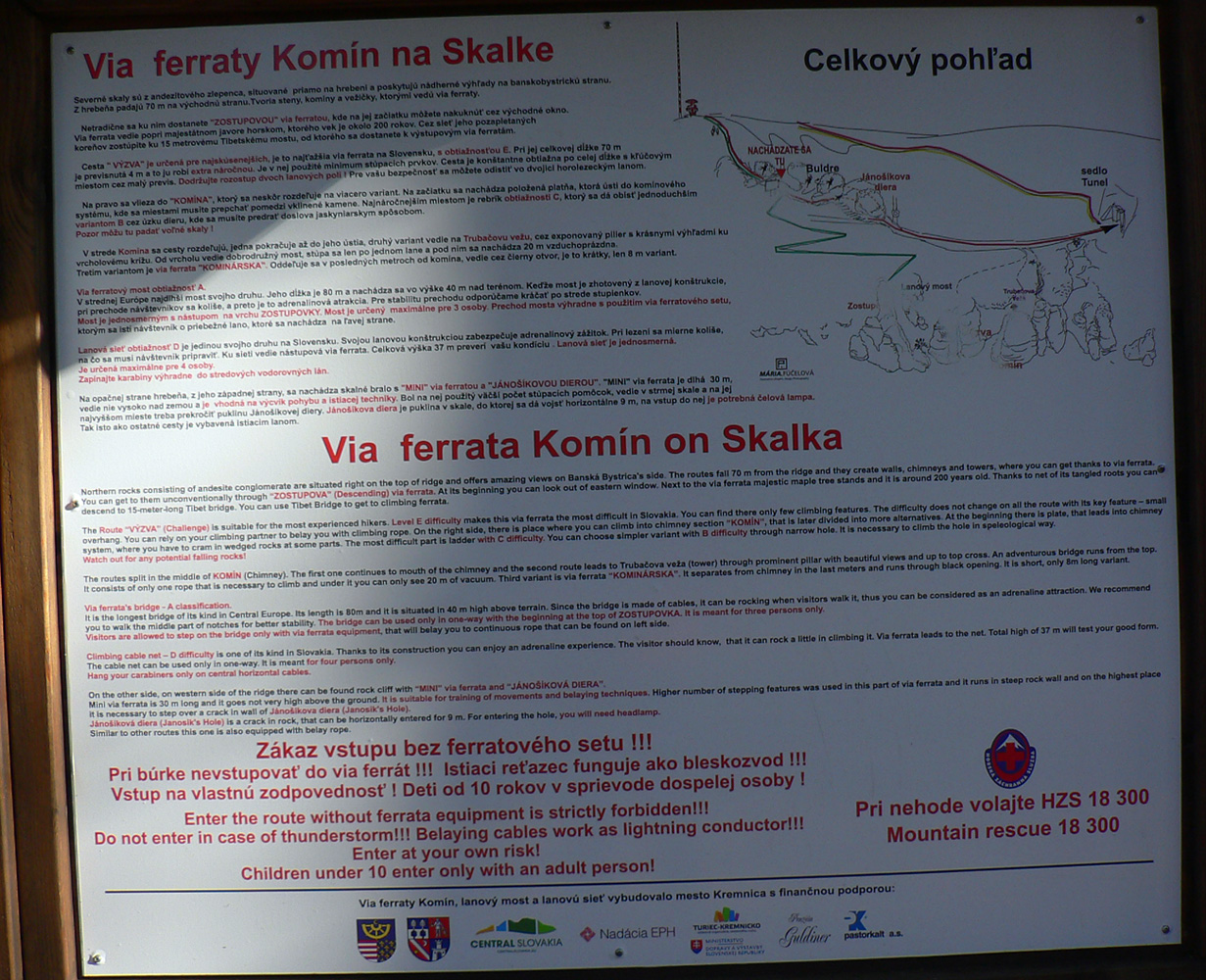 Srandovný je taký dáky politický podtón: Most a Sieť ako najznámejšie tunajšie pojmy :-) Ale je tu aj jedna skutočná Výzva – najťažšia ferrata na Slovensku s reálnou obtiažnosťou E. Najkrajší je ale jednoznačne Komín – pohodový, len miestami asi nič moc pre klaustrofobikov. V ňom je viac možností, kade stúpať: na začiatku po kolmom Rebríku alebo jednoduchším Jaskyniarskym variantom. Potom sa dá odbočiť na vzdušnú Trubačovu vežu s vrcholovým krížom a z nej ujsť „na pevninu“ ďalším adrenalínovým mostom. V závere Komína je ešte možné vyskúšať krátky, ale náročnejší Kominársky variant. Samotný zostup z hrebeňa k Sieti, Výzve a do Komína je poriadne strmý, takže je zaistený samostatnou ferratou (A, B) s Tibetským mostom na jej konci. Priamo na hrebeni je ešte cvičná ferratka Jánošíkova diera a komu by bolo teplo, aj neoznačená (zatiaľ?), ale zaistená puklina plná snehu. Hej, aj po dlhom lete je ho tam ešte dosť! K tomu lavičky a infotabule, všetko ako má byť.