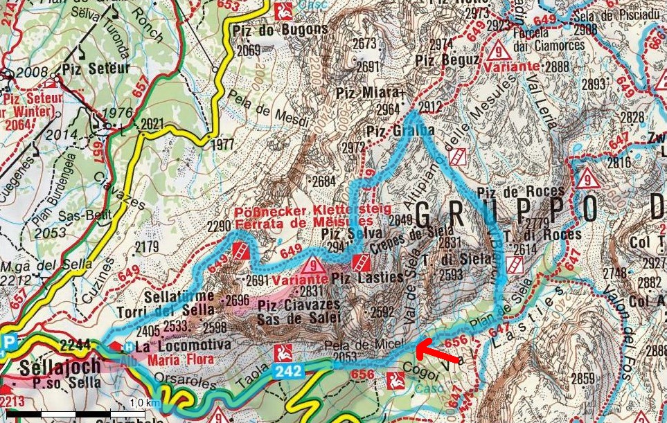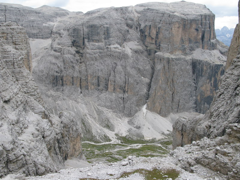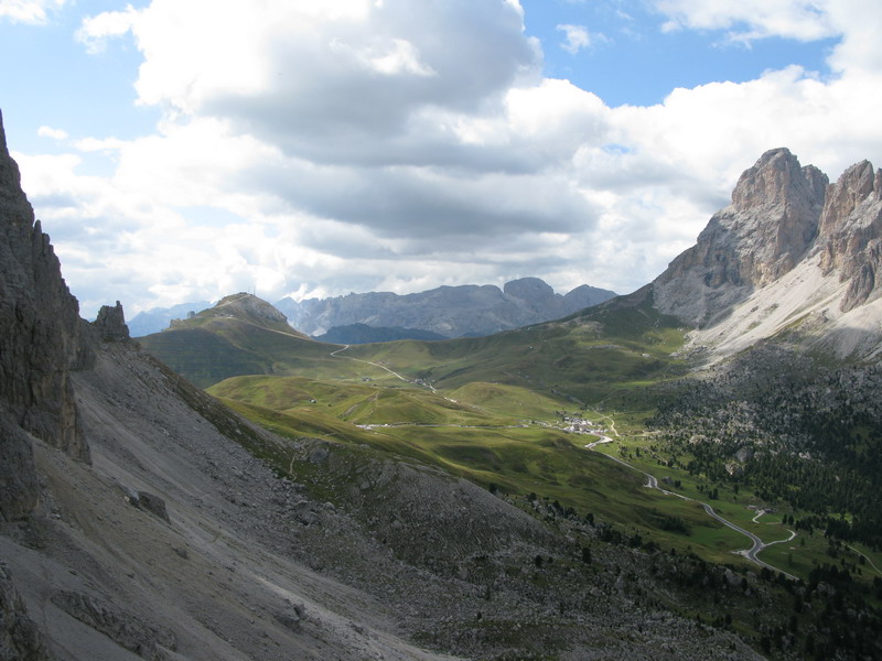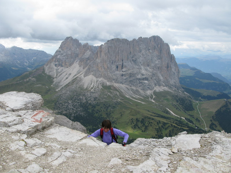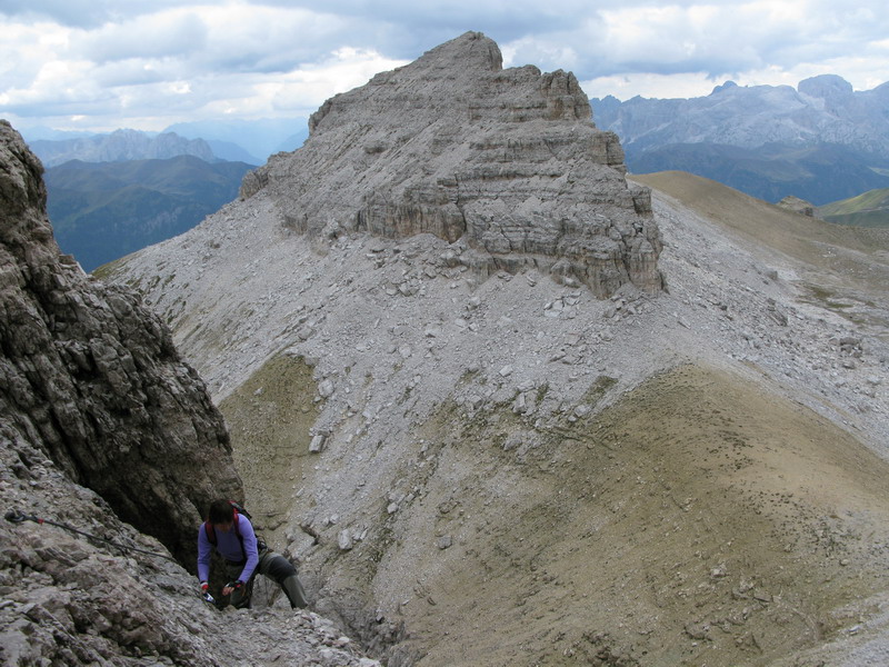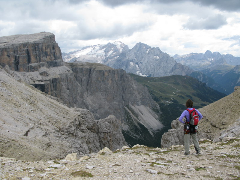 Na vrchole na nás čakajú výhľady na všetky strany. Piz Boé, Marmolada, Sass Pordoi, Langkofel ... Dolomity sú svojimi výhľadmi povestné. Čaká nás zostup a s ním aj dilema, či ísť dlhšou a jednoduchšou cestou, alebo skúsiť zostup cez dolinu bez značkovaného chodníka. Na mape je chodníček vyznačený len prerušovanými červenými bodkami - to znamená, že trasa nie je v teréne vyznačená a vyžaduje už nejaké skúsenosti.