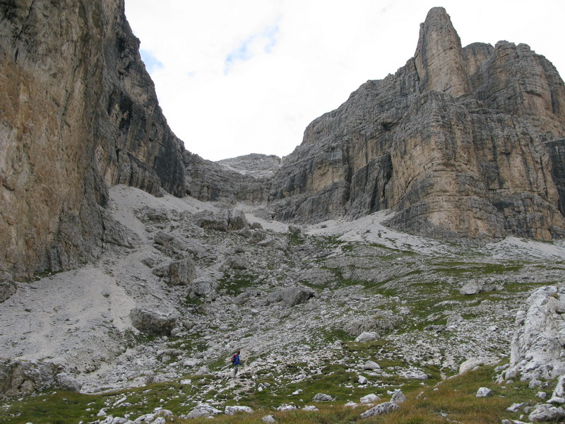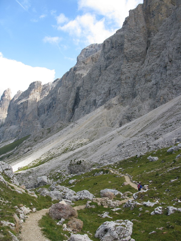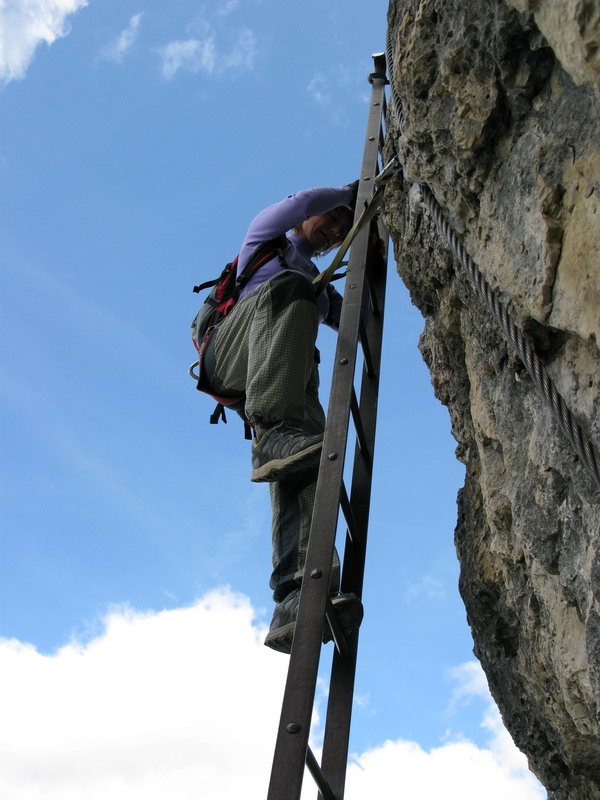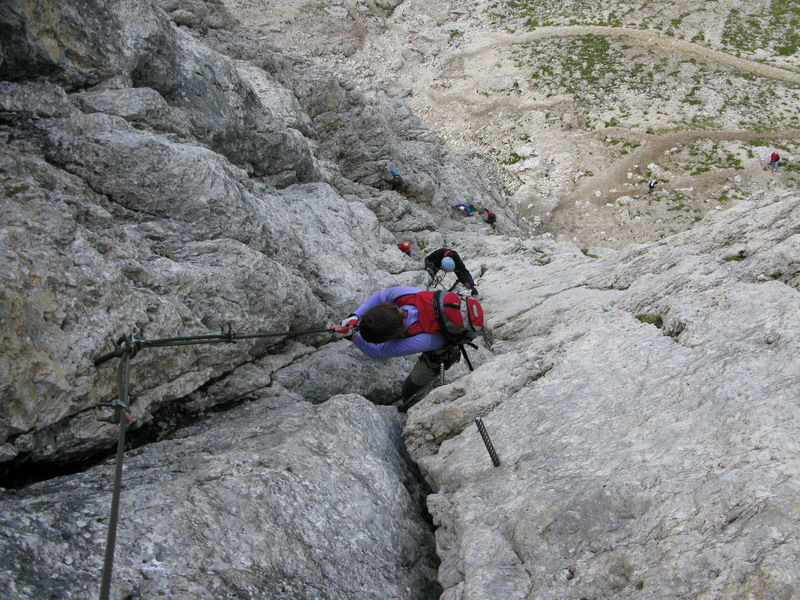 Zo sedla sa pekným chodníčkom dostaneme pod stenu. Táto oblasť je aj vyhľadávaným lezeckým terénom, takže stretnúť lezcov ne je nič nezvyčajné. Pri nástupe stretávame skupinku Nemcov, ktorí si nacvičujú zlaňovanie. Sú dosť prekvapení, keď nás vidia nastupovať do ferraty bez prilieb - jednoducho sa nám nechcelo. Až sa cítime previnilo. Nemecká pedantnosť je povestná.