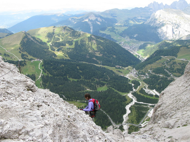 Po preleze skalným oknom pokračujeme pekným komínom a stenou až k výlezu zo steny. Tu sa ferrata mení na turistický chodníček a vychádzame serpentínami na náhornú plošinu - jedno z poschodí "Torty". Zábava však nekončí a ferrata pokračuje výšvihom na vrchol Piz Selva 2941m. Počas výstupu obdivujeme skalné vežičky a skané okienka. Skala je tu ako ementál.