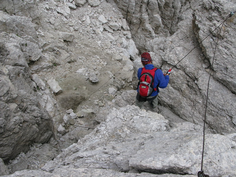 V ďiaľke vdíme nemecký párik ako stojí na križovatke a z ďiaľky nás pozoruje. Nevedia sa rozhodnúť. Času do zotmenia už nie je zase tak veľa a prípadný návrat na značkovaný chodník by nepotešíl. Prichádzame k skalnému prahu a s potešením zisťujeme, že je zaistený oceľovými lanami. Na toto pedantní Nemci zvyknutí nie sú a tak si to tá dvojka musela šupnúť naokolo. Aj toto je taliansky kolorit: zaistený úsek na neznačkovanom chodníku.