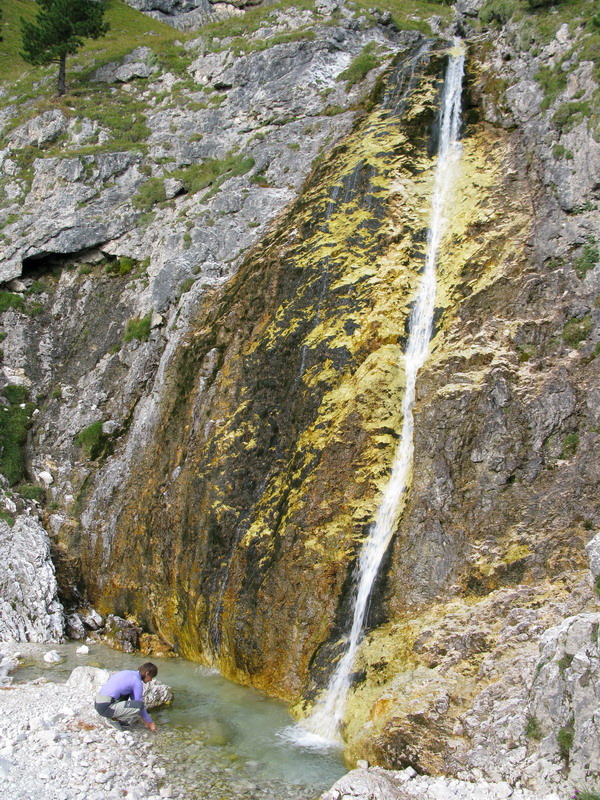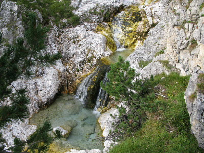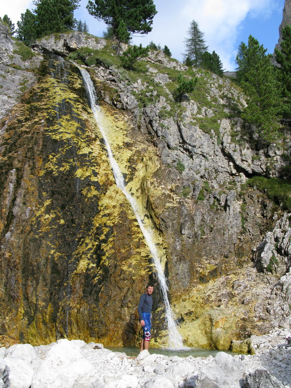 Schádzame spokojní do doliny Val Lasties. Spravili sme správne rozhodnutie a to len umocnilo pekný zážitok. Ako odmena na záver nám dobre padne občerstvenie pod vodopádom. Obdivujeme tu naozaj krásny prírodný výtvor - sústavu skalných obrích hrncov. A na záver ešte sa nám takmer pod nohy pripletú vypasené svište. Ako už tradične, bývajú priamo na chodníku.