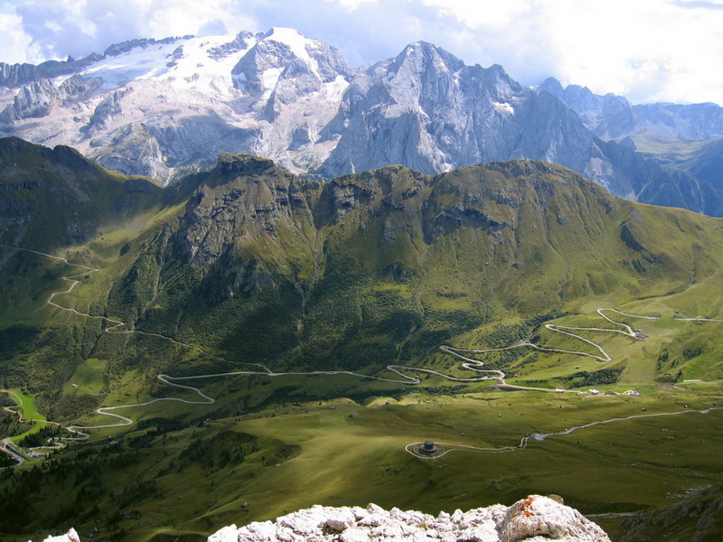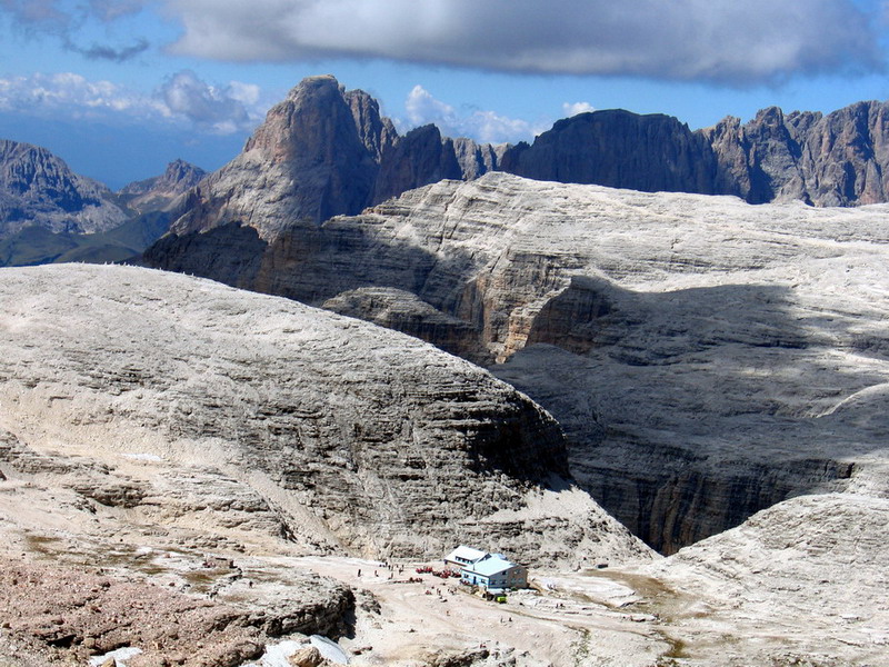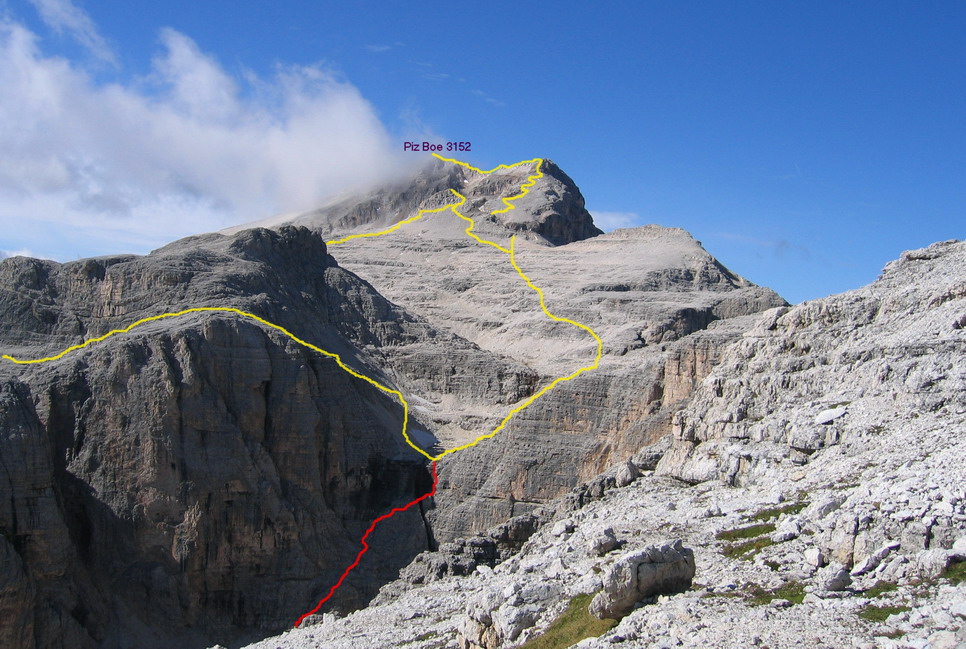 Tak som sa vydal na Piz Boé okľukou, ako sa hovorí: "Síce dlhšie, ale o to krajšie". Vychutnal som si výhľady a začal sa pomaly driapať hore. Chodník vedie cez predvrchol, kde sa prvý raz prehupnem cez tritisíc metrov. Odtiaľto som pokračoval vzdušným hrebeňom (Cresta stretta) až na vrchol. Počasie mi prialo, a ako hovoria Poliaci : "Widoky zajebiste". Na vrchole som sa musel predierať cez tlačenicu, prešiel som okolo chaty Capana Fassa a išiel som hneď ďalej. Až obďaleč vrchola som sa usalašil na kameni a vytiahol nejaké občerstvenie. Odhadujem, že tam bola taká dobrá stovka ľudí.