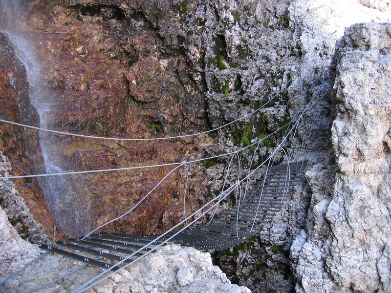 Traverzujem popri stene a hľadám začiatok ferraty, zrazu začujem hlasy vysoko nado mnou. Zakloním hlavu a zbadám ľudí na vysutom mostíku. Vytasím foťák rýchlosťou pištolníka divokého západu a "cvak". Stihol som to. Čakám, či ešte niekto nepôjde, ale nič sa už nedeje. Prichádzam pod nástup, začína to teda pekne do kopca. Využijem, že som tu sám a vytiahnem statív. chce to niekoľko pokusov, kým som spokojný a tak ku asi 100 fotkám z tohto dňa konečne aj nejaká "v pohybe"