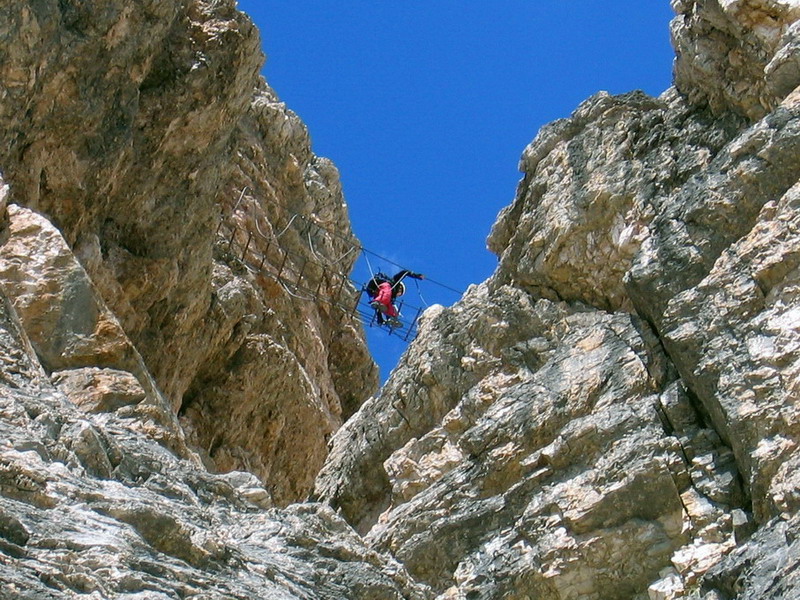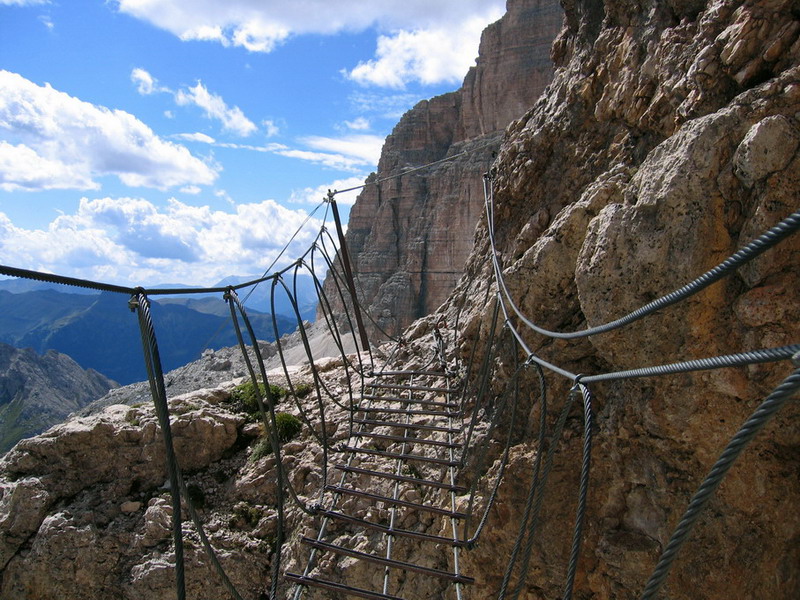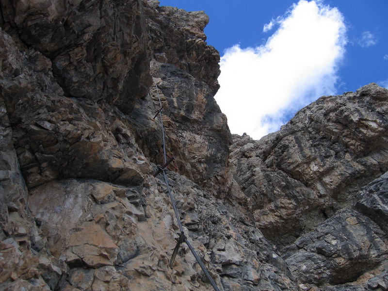 Ferrata Vallon nie je veľmi dlhá a ťažká, ale neoplatí sa ju podceňovať. V hornej časti je železný mostík, ktorým som sa dostal pod kľúčové miesto - asi 20 metrovú kolmú stienku. Sedačku som mal stále na sebe a tak som neváhal a zapol sa do oceľového lana. Po výleze z ferraty som stál na prahu ľadovcovej dolinky. Boli tu ešte zvyšky snehu. Tu som urobil orientačnú chybu, značenie tu zďaleka nedosahuje úroveň Tatier, ale zato je tu značná sloboda pohybu. Mapy tiež nedosahujú úroveň našich (Harmatanec). Mám Tabacco aj Kompas a môžem odporučiť jedine Tabacco, tá je aspoň v dobrej mierke 1:25000.
