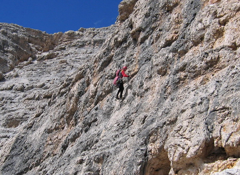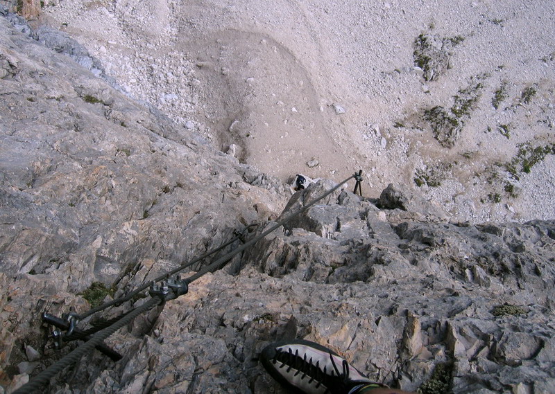 V závere ferraty nechcem veriť svojim očiam: dvaja lezci, ktorí práve doliezli nejakú lezeckú cestu v smere na Sass Pordoi, začínajú zostupovať dole. Na chrbte majú lano, a na sebe ešte sedačky s celou výstrojou. Škoda, že ich neuvidím zostupovať dole, na tom najťažšom úseku. Na nohách majú už topánky, lezečky sa im hojdajú naboku. Jedno mi však neujde: obaja majú originálny set na ferraty a poctivo sa zapínajú oboma karabínami. Nabudúce si už vezmem aj ja dve...