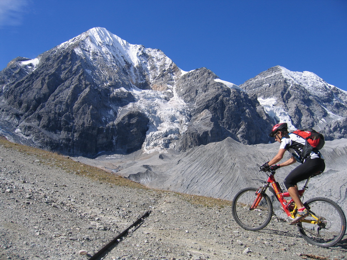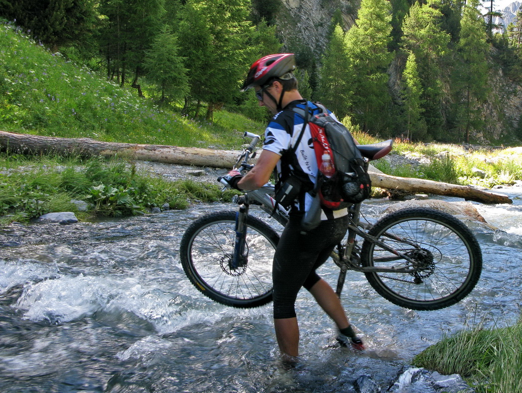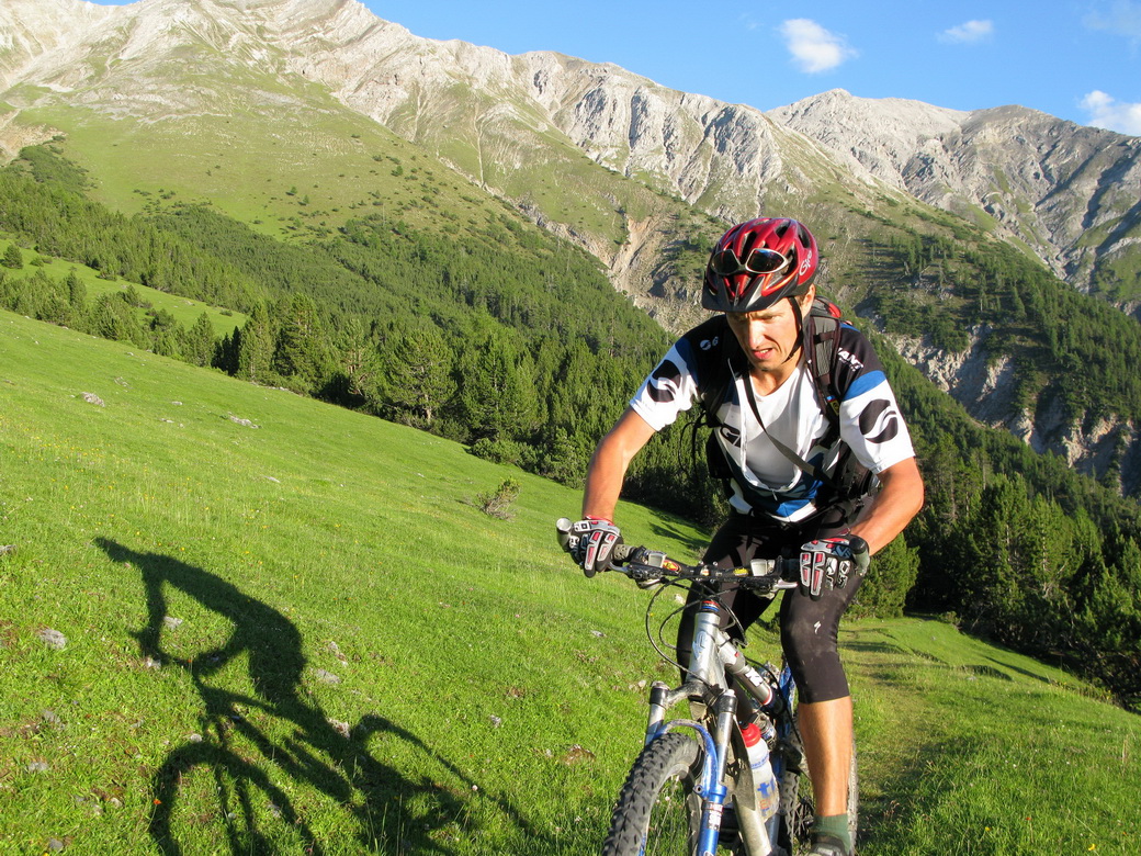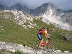 Nie som však nijako nadšený, že musím fotiť stále len seba a preto využívam každú možnosť odfoťiť aj niekoho iného. Tejto fotke sa nemec Rainer veľmi potešil, keď som mu ju poslal v plnej kvalite. Stretli sme sa večer vo Val Mora, mali sme spoločnú cestu, tak sme išli ďalej spolu. V závere stúpania sme sa vynorili z tieňa a ja som začal cítiť šancu na dobrú fotku. Šliapol som do pedálov, trochu som mu ušiel, rýchlo som vytiahol foťák a cvak. S tepom okolo 180 som ho rýchlo vyfotil. Muselo to vyjsť na prvý pokus, večer o ôsmej sme už mali obaja dosť a na nejaké pózovanie veru nebol čas.