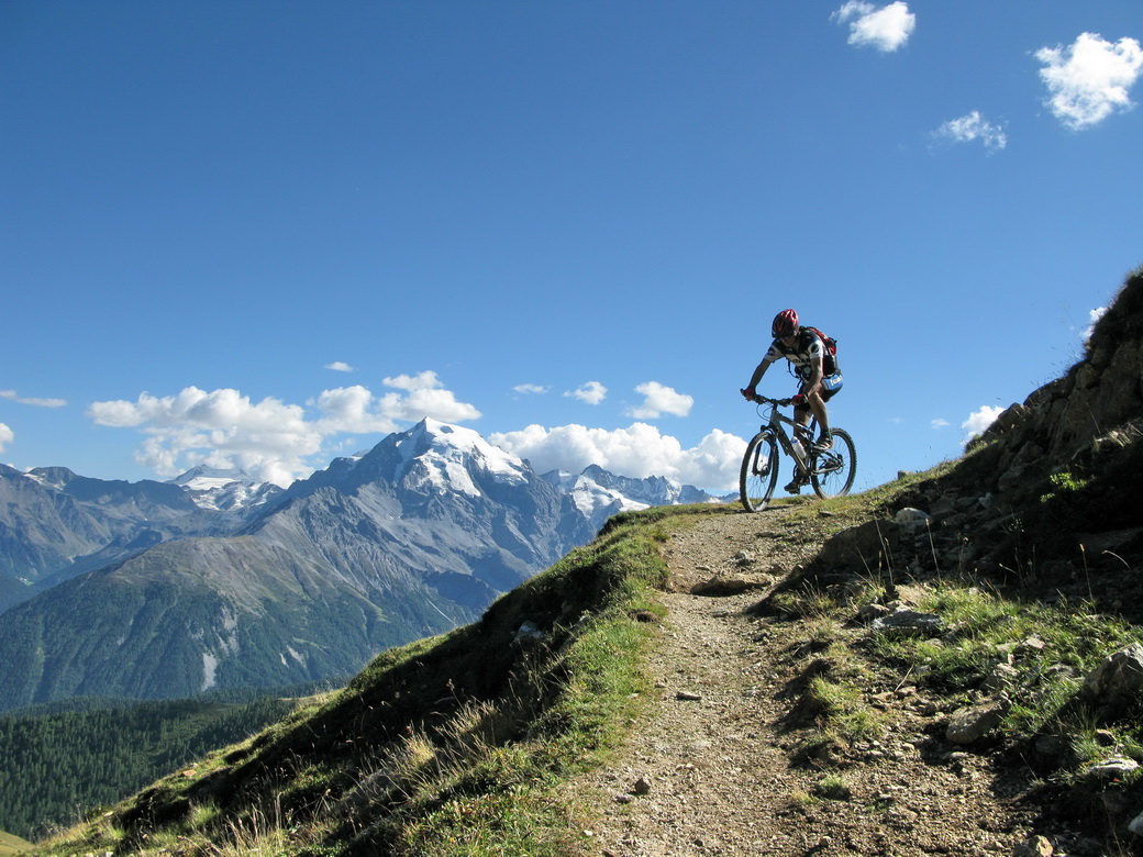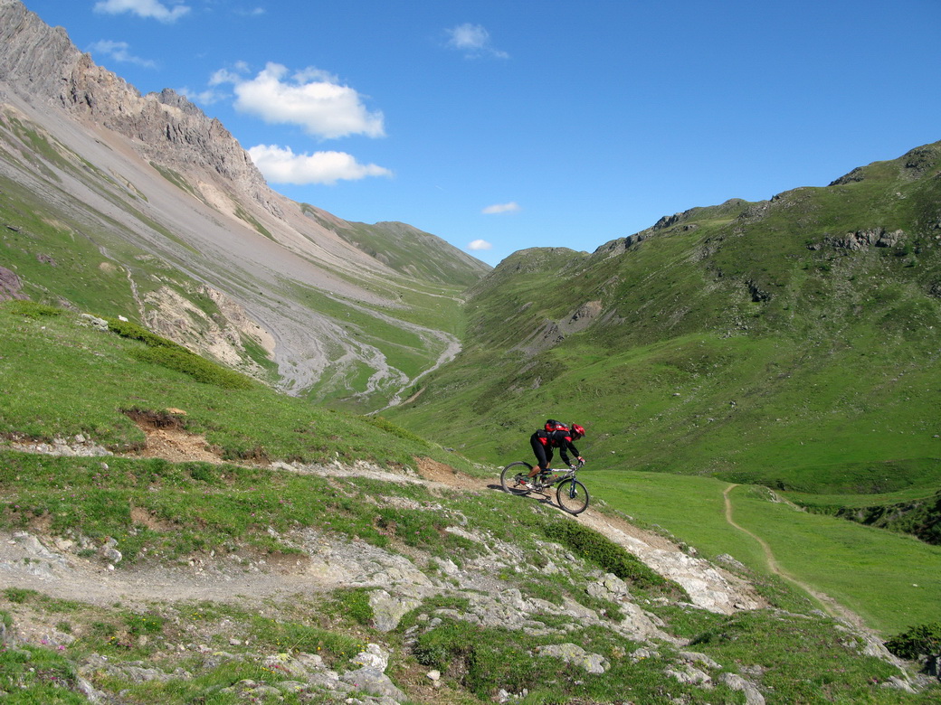 Postupne som sa odvažoval na stále náročnejšie kúsky. Chcel som, aby bol na fotke popri peknej panoráme aj pohyb, pokiaľ možno čo najextrémnejší. Tento kúsok sa mi podaril vo Val Trela neďaleko Livigna. Túto fotku cvakol ten, čo sa tam dolu spúšťa na bicykli. Podarila sa na druhý pokus. Žiadna iná fotografia (z tých čo som v ten deň urobil) neodráža presnejšie tie úžasné pocity z jazdy po supertrailoch.
