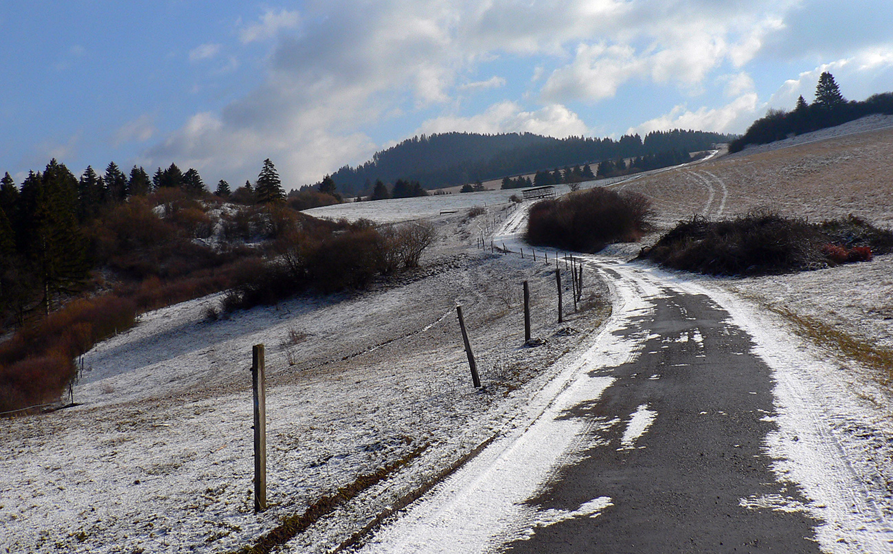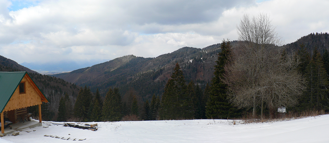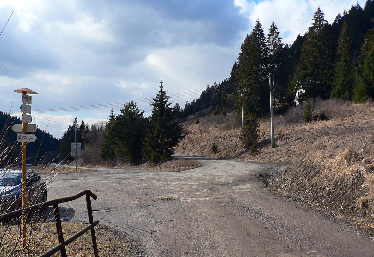 Z Kečky po vlastných stopách nazad na zvážnicu a na križovatke vymieňam modrú turistickú za cykloznačku. Zároveň aj zmrznutý podklad za čoraz blatnatejší, ako klesám do doliny a ráno prechádza do dňa. Ale onedlho už čistím dezén v pribúdajúcom snehu, lebo sa preklápam do protiľahlého, severného svahu a popri potoku stúpam pod Ostredok. Aj tu je cesta použiteľná, ale keď sa otočí okolo chaty na lúke a po chvíli skončí na okraji lesa, brodiť sa ďalej hore lúkami, to už sa mi nechce.