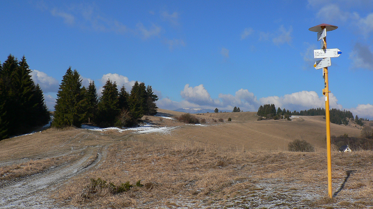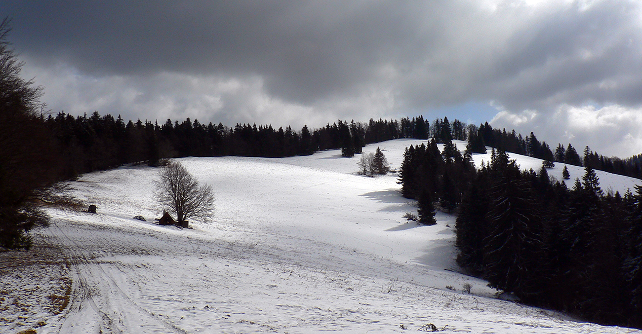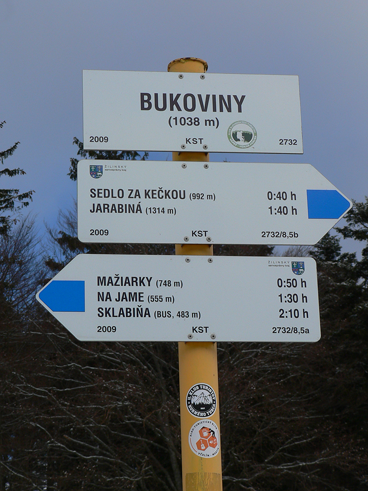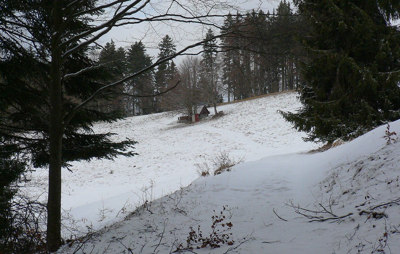 Z Kečky po vlastných stopách nazad na zvážnicu a na križovatke vymieňam modrú turistickú za cykloznačku. Zároveň aj zmrznutý podklad za čoraz blatnatejší, ako klesám do doliny a ráno prechádza do dňa. Ale onedlho už čistím dezén v pribúdajúcom snehu, lebo sa preklápam do protiľahlého, severného svahu a popri potoku stúpam pod Ostredok. Aj tu je cesta použiteľná, ale keď sa otočí okolo chaty na lúke a po chvíli skončí na okraji lesa, brodiť sa ďalej hore lúkami, to už sa mi nechce.