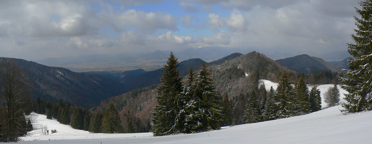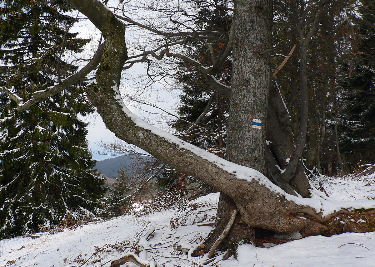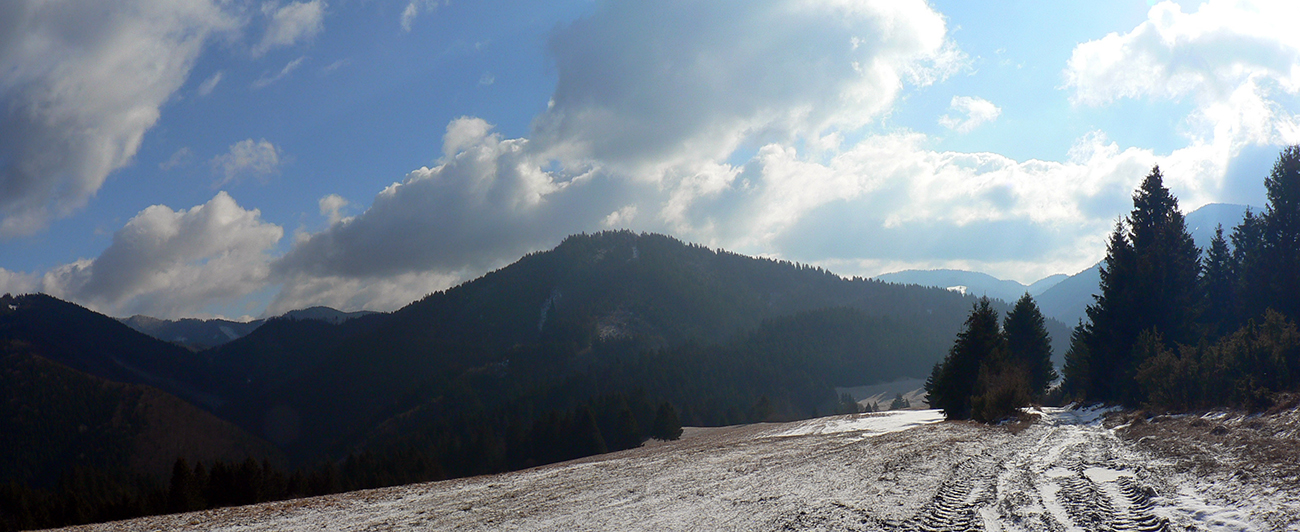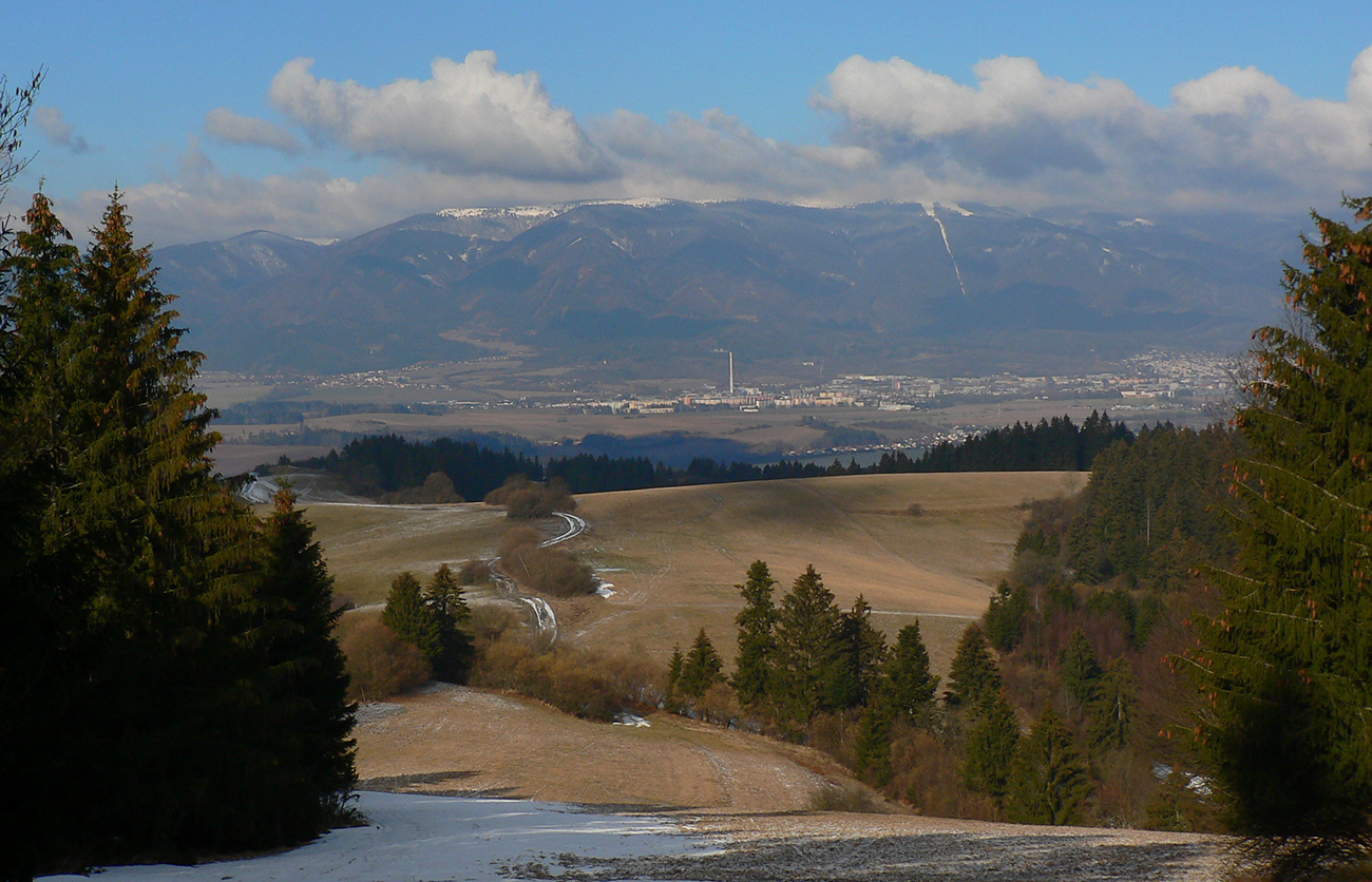 Úvod je tu slušne do kopca, cestou sa otvárajú výhľady na kotlinu, len sa treba za nimi obzerať. Vpredu pichá do očí nízke ranné slnko, krajina iskrivá, pocukrovaná. Na Mažiarkach už pod nohami mäkšie. Cestou ešte dávam pár krátkych odbočiek za lepšími výhľadmi, potom už ponor do lesa a traverzová lesná cesta, lemovaná pokrútenými bučiskami. To už som na modrej značke smerom na veľkofatranský hrebeň, ale až tam zájsť nemienim. Otáčam to na Kečke, keď si ešte predtým dávam ďalšiu odbočku na zarastený vrcholček Tisové, lebo vidím chodníček. S výškou pribúda sneh, miestami sa na lúkach mimo cesty aj zaborím, ale väčšinou ma ten betón dobre nesie. Sprava na moje kroky dozerá Lysec: