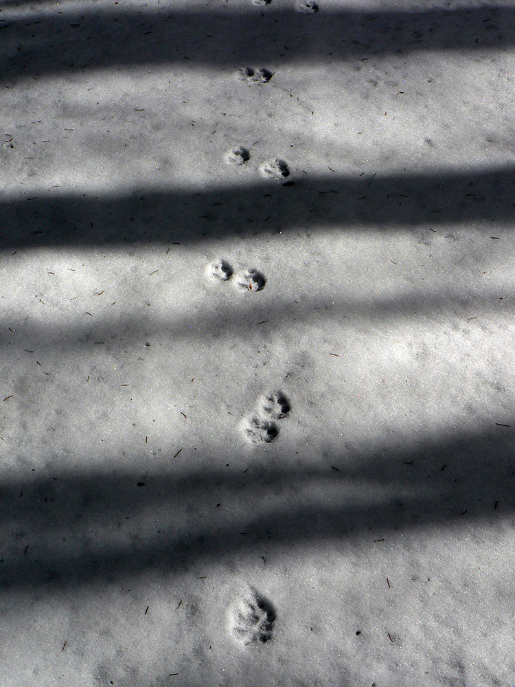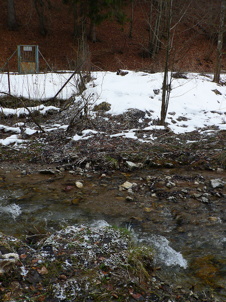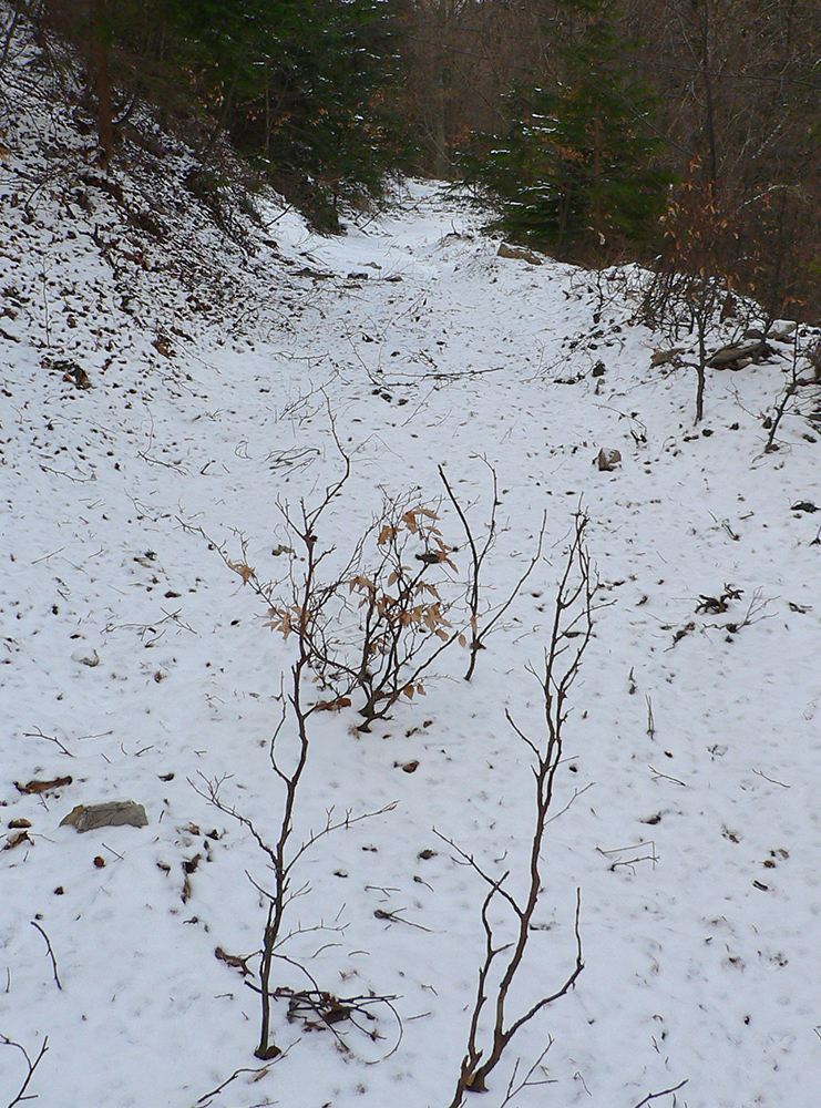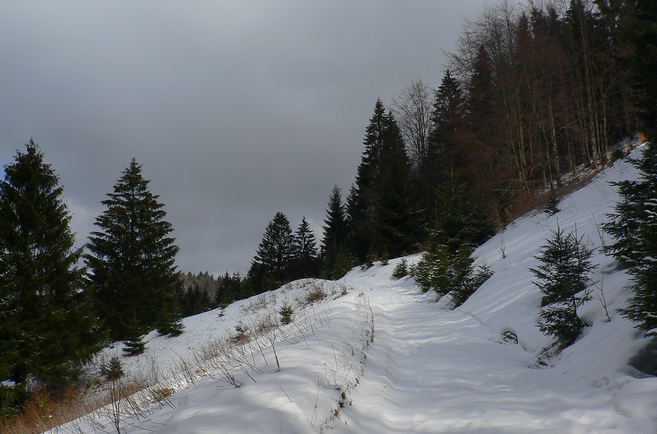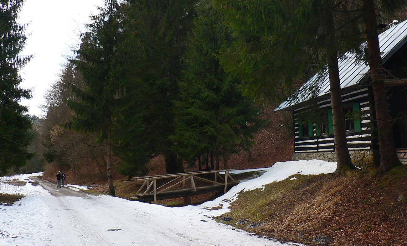 Tak zas nazad po vlastných stopách, na začiatok s panorámou skoro celej Jasenskej doliny. Nezbieham až dole na jej dno, odbočujem doľava – severným traverzom Lysca vedie stará, momentálne nepoužívaná zvážnica. V lete asi poriadne zarastená, v zime poriadne zapadaná, ale teraz taká znesiteľná. Zamrznuté lístie našuchorené mrazom, tak je na došľap mäkkučká. Najskôr trochu do kopca, potom dlho z kopca, aj zopár preliezok, prudká zákruta na záver a už len dilema, kade a ako preskočiť potok.
