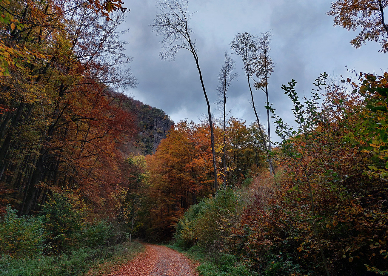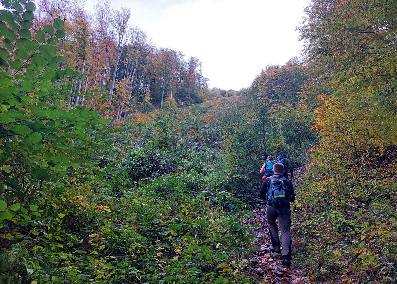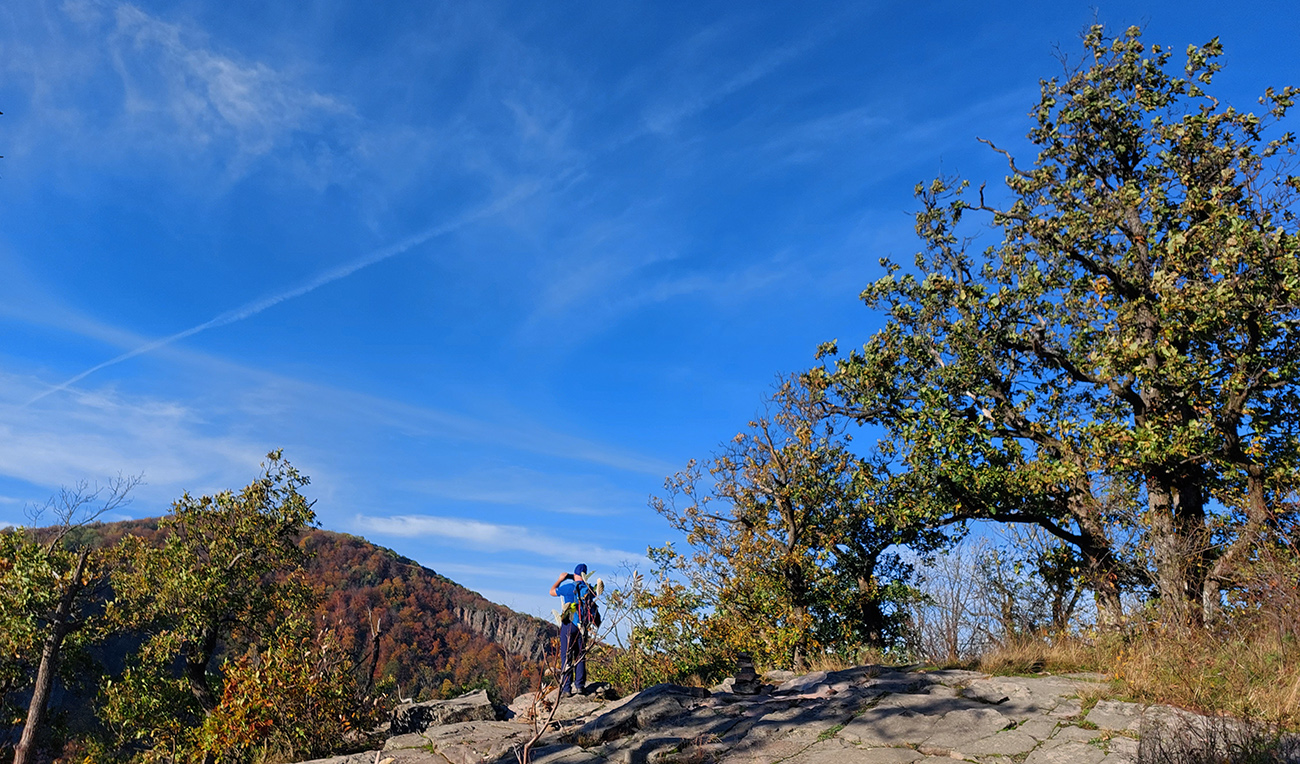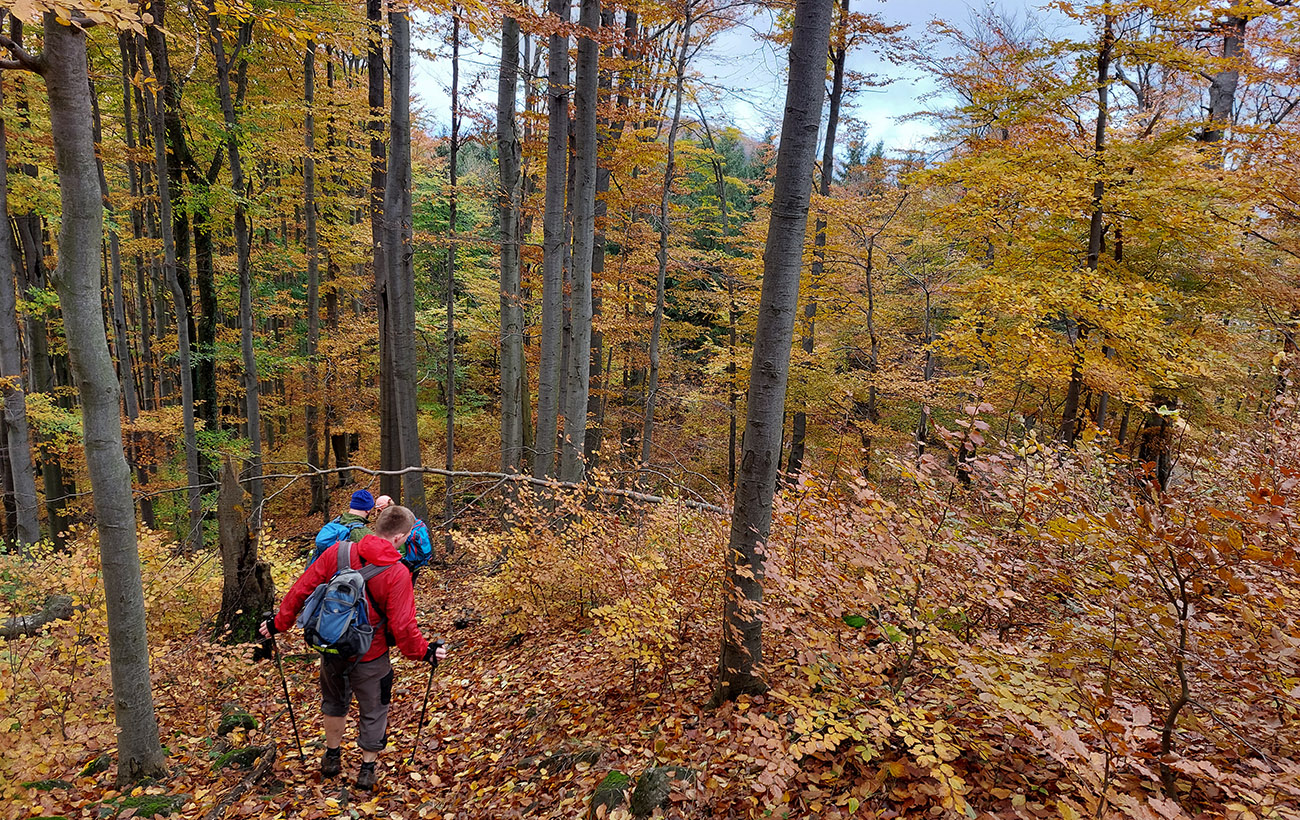 Jednoduchý, asi dvadsaťkilometrový okruh, niečo cez osem hodín s častým posedávaním a vychutnávaním. Pohodová prechádzka po plnofarebných októbrových lesoch pohoria Vtáčnik, po jeho západných svahoch, v podstate okolo Bystričianskej doliny, po chodníkoch a cestách, kde aj nedlho po daždi už to nečvachtá vďaka poréznemu, sopečnému podložiu.