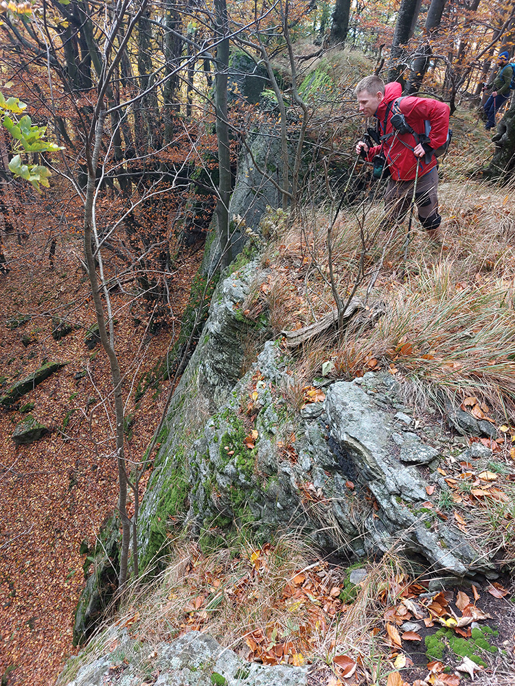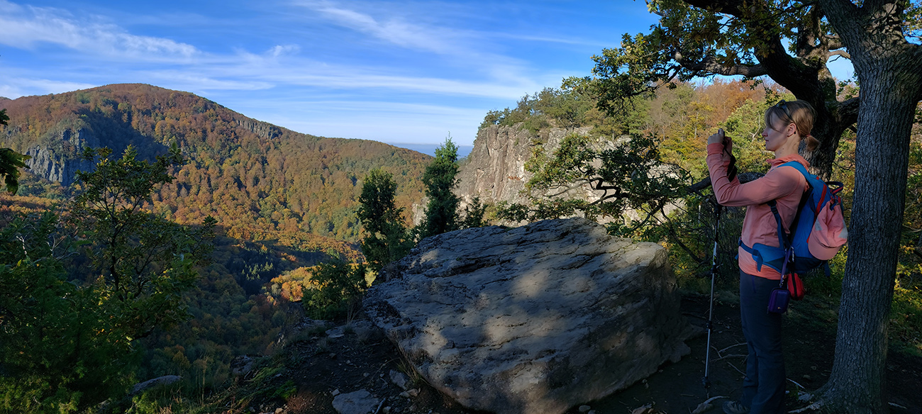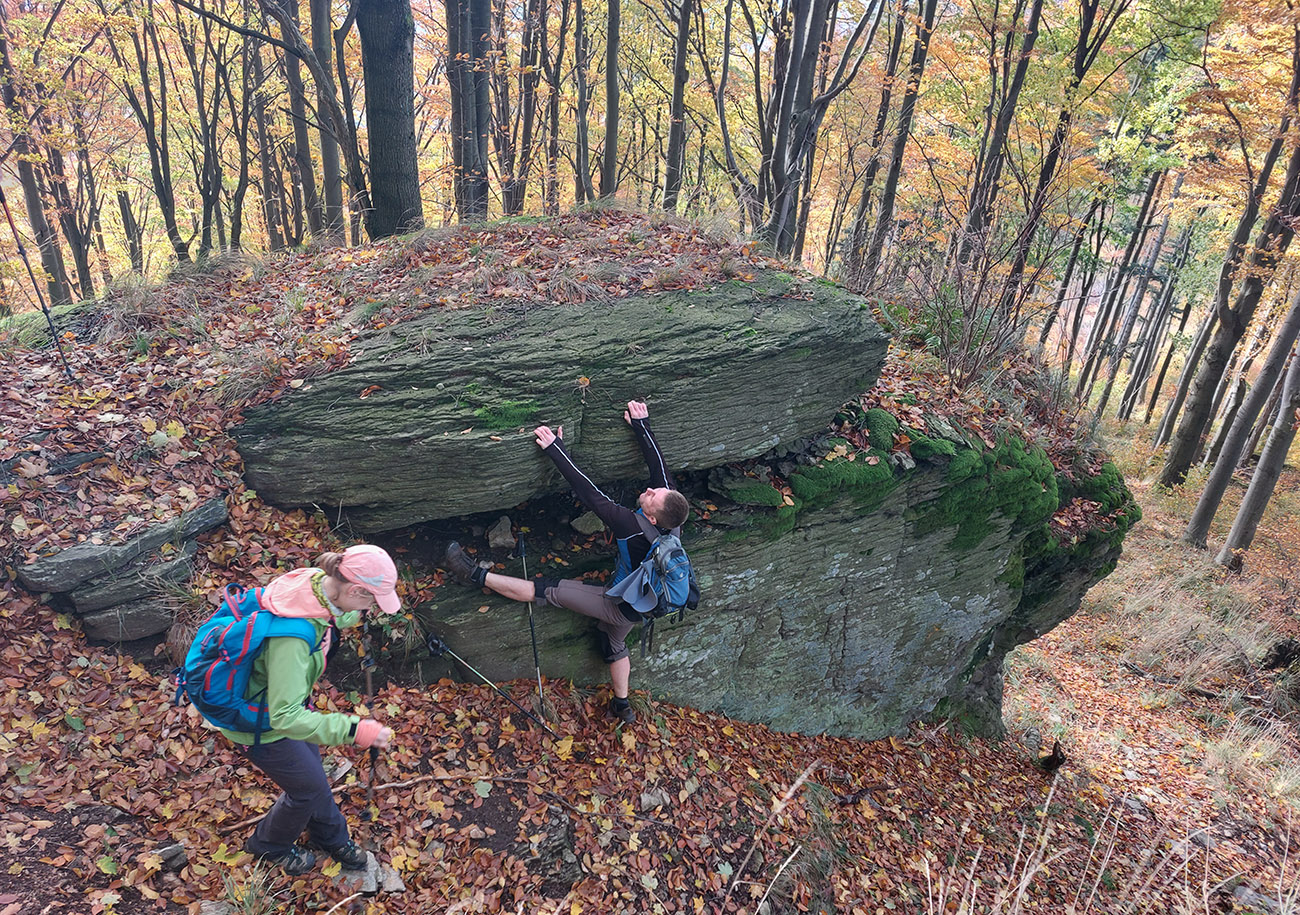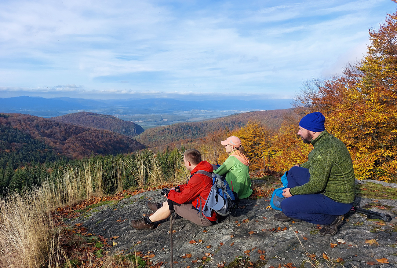 Zo Zadnej lúky bola v pláne ešte krátka, strmá, ale nutná, lebo veeeľmi pekná zachádzka na Buchlov. Farebný les s machom obrastenými balvanmi pod bralami, rebríky v úzkej štrbine medzi skalnými vežami pri ceste na vrchol, parádne panorámy v diaľkach a medové farby lesa pod nohami, to sa samozrejme nedalo obísť.
