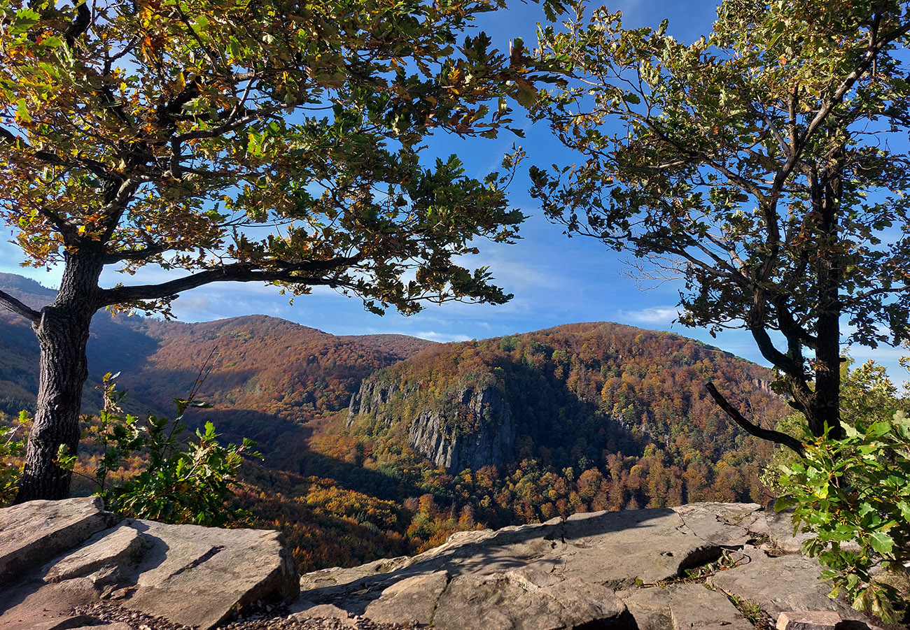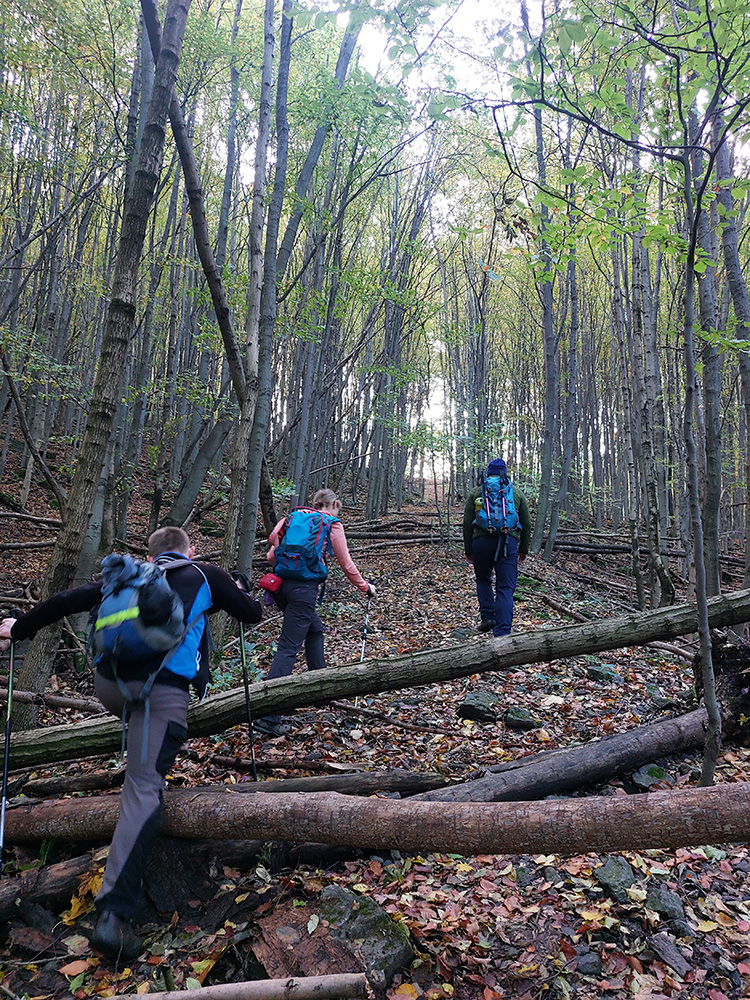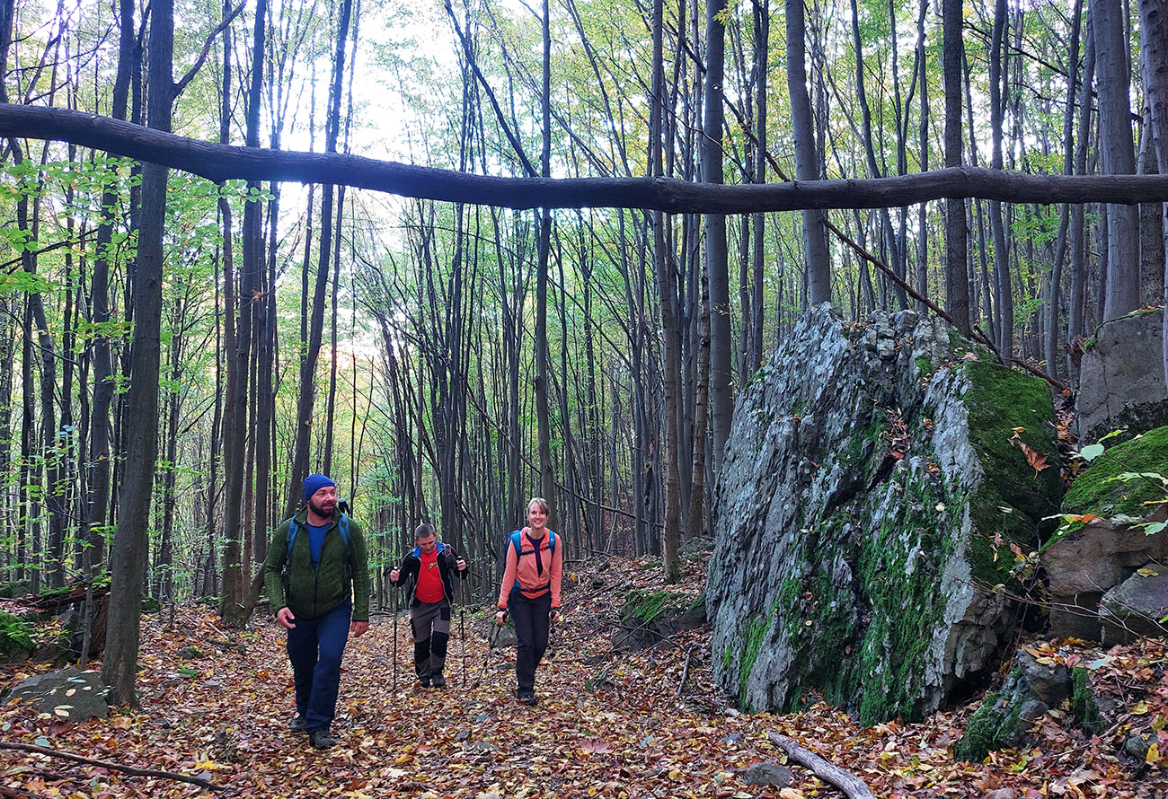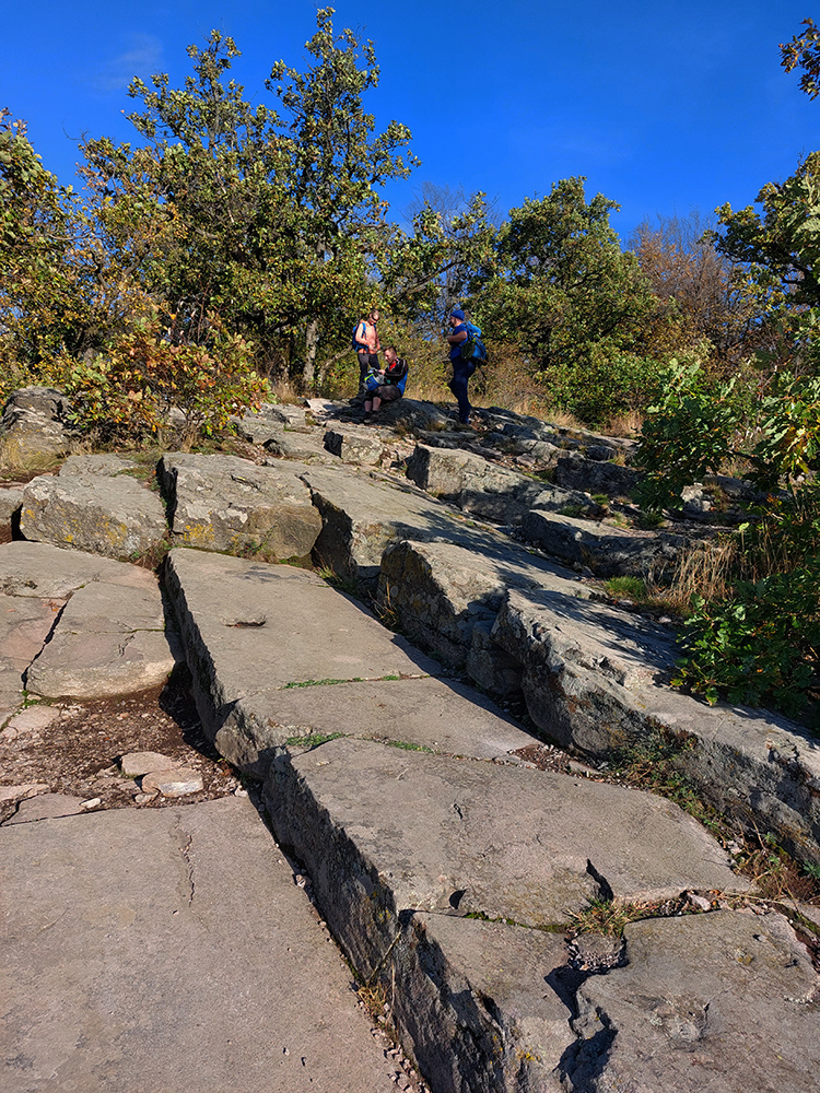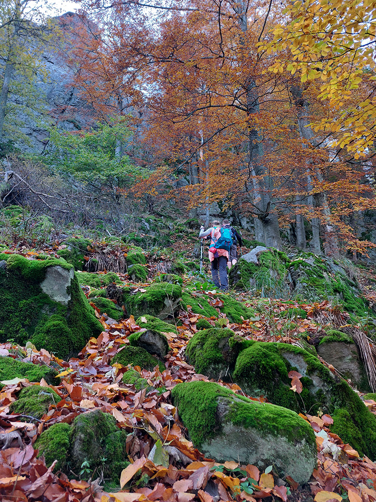 Zo Zadnej lúky bola v pláne ešte krátka, strmá, ale nutná, lebo veeeľmi pekná zachádzka na Buchlov. Farebný les s machom obrastenými balvanmi pod bralami, rebríky v úzkej štrbine medzi skalnými vežami pri ceste na vrchol, parádne panorámy v diaľkach a medové farby lesa pod nohami, to sa samozrejme nedalo obísť.