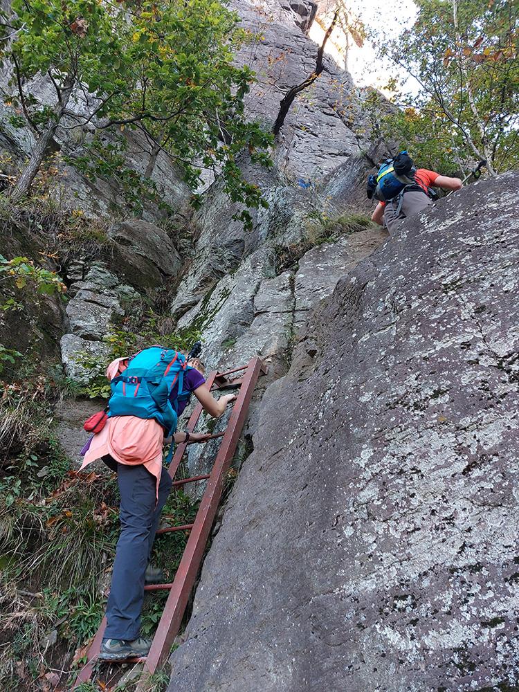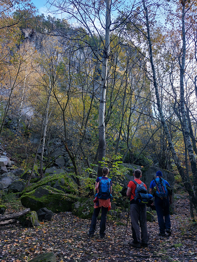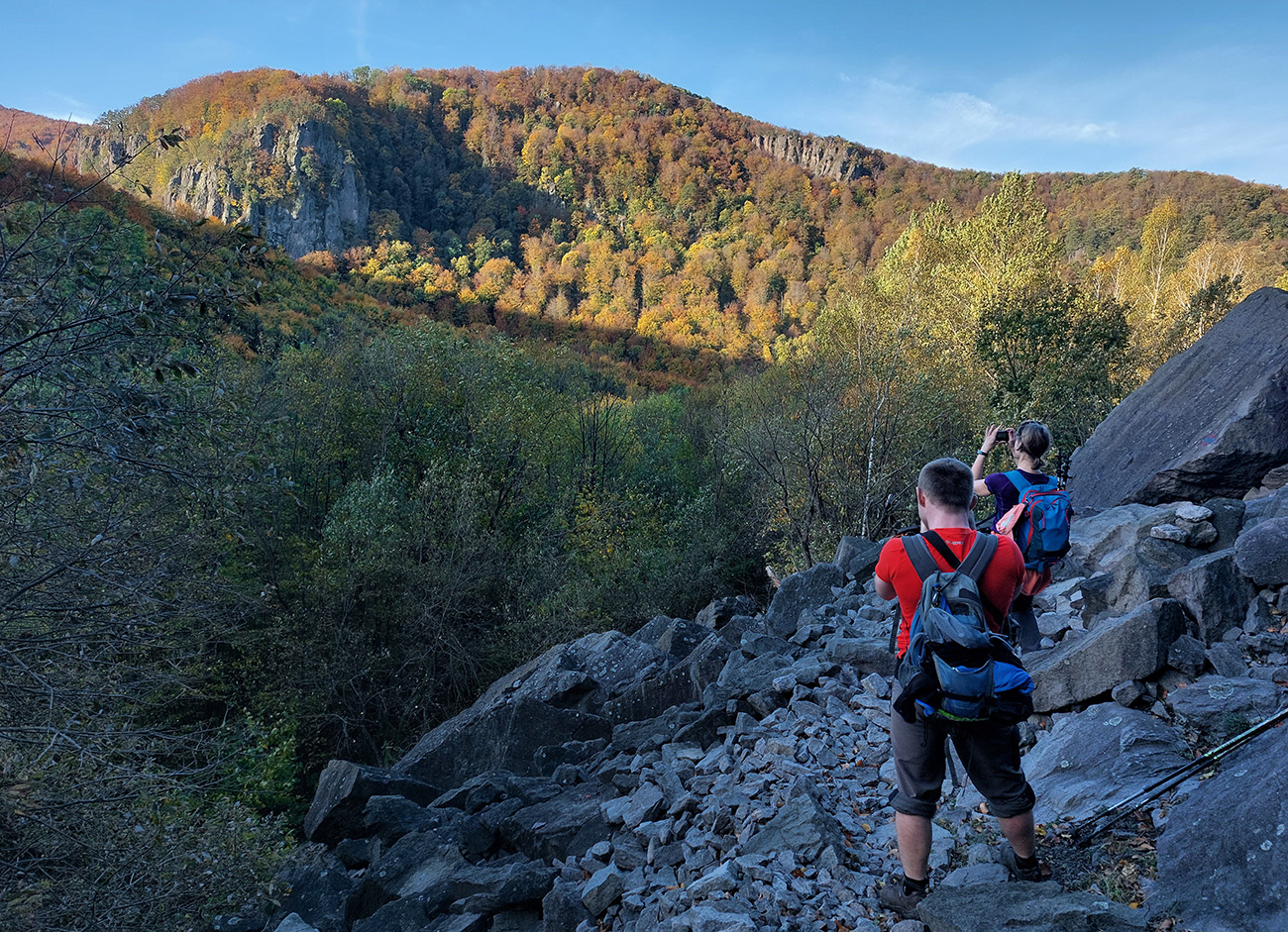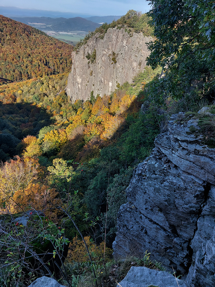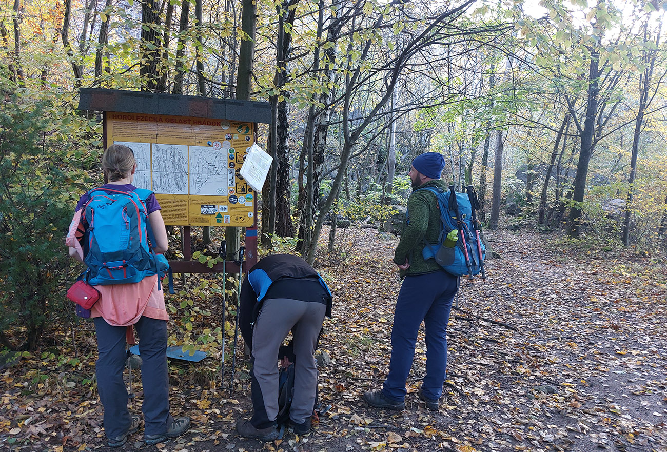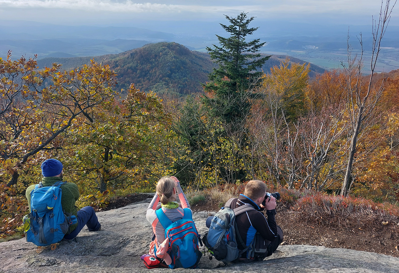Začali aj skončili sme na parkovisku Sekaniny v ústí Bystričianskej doliny a neznačeným, ale dobre prechodeným (lebo lezcami používaným) chodníkom sme sa vyštverali pod steny známej lezeckej lokality Hrádok. Popod skaly k rebríkom a po rebríkoch hore na temeno, užívačka farebných panorám, super úvod!