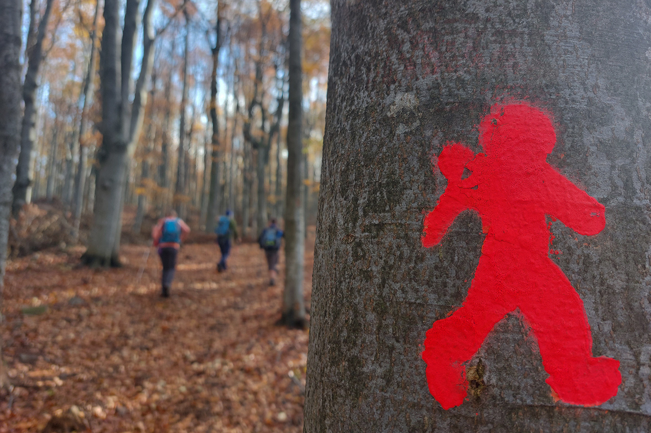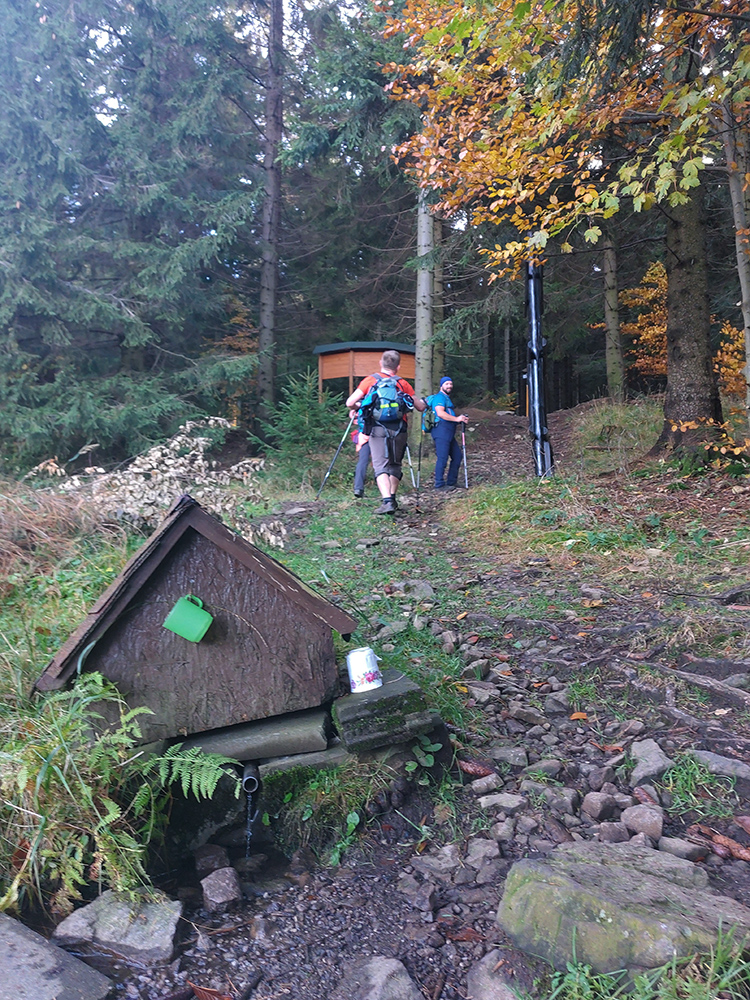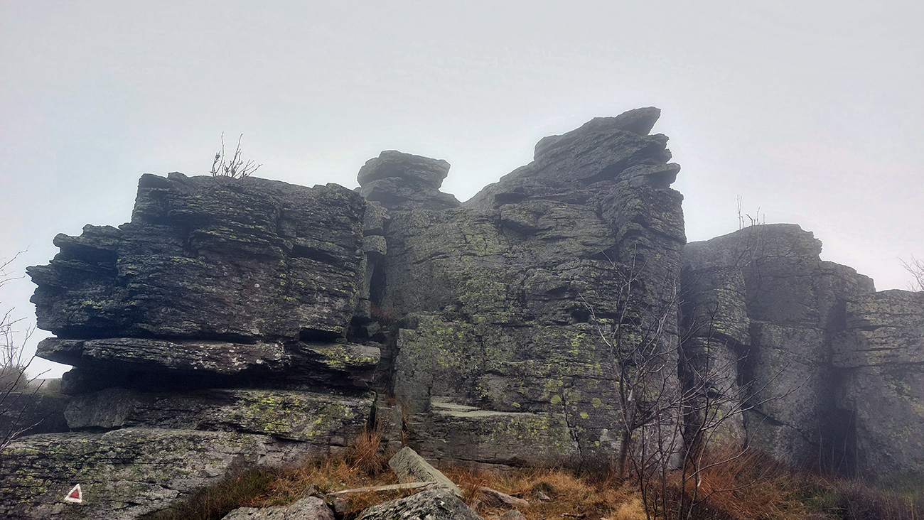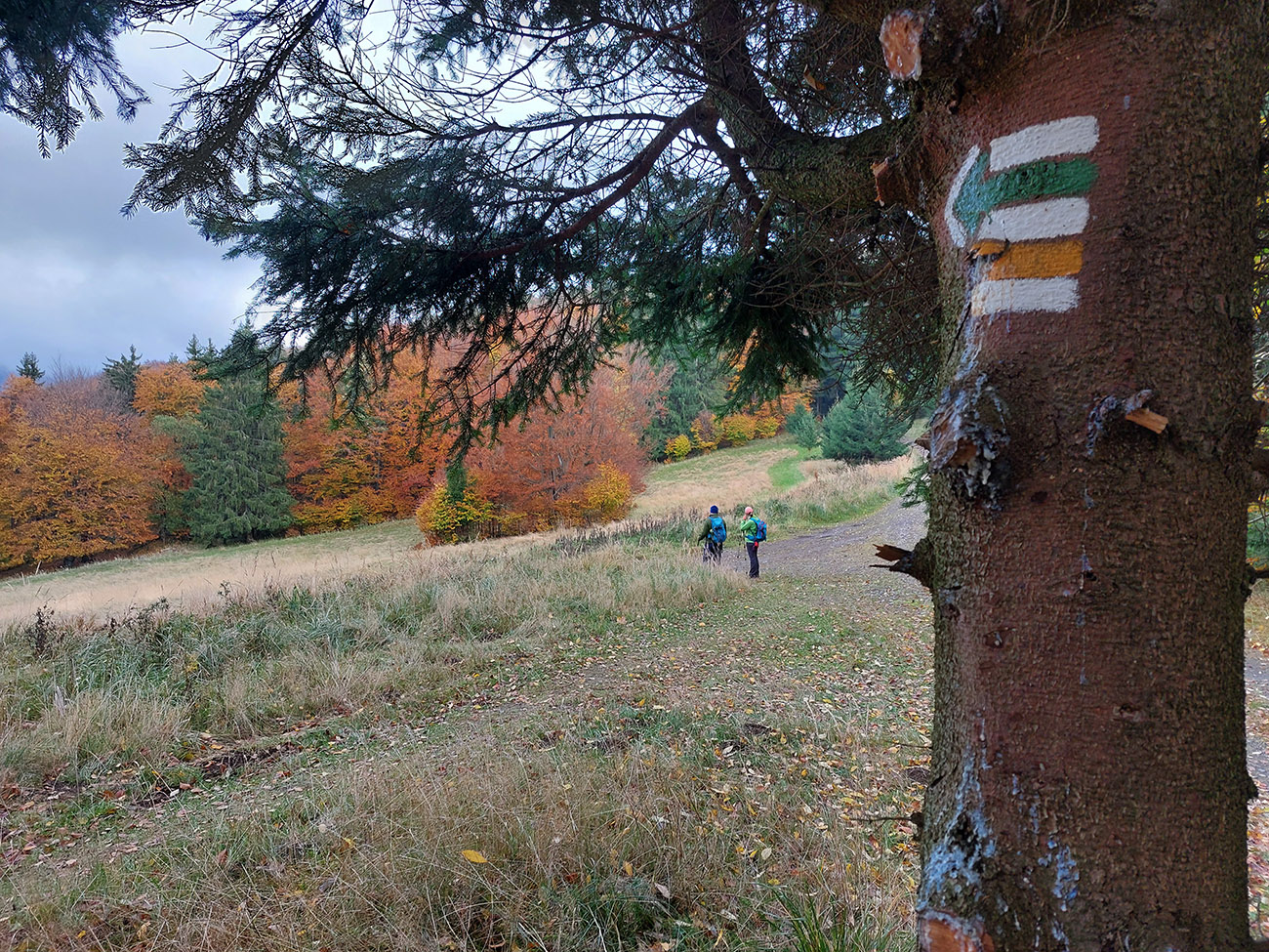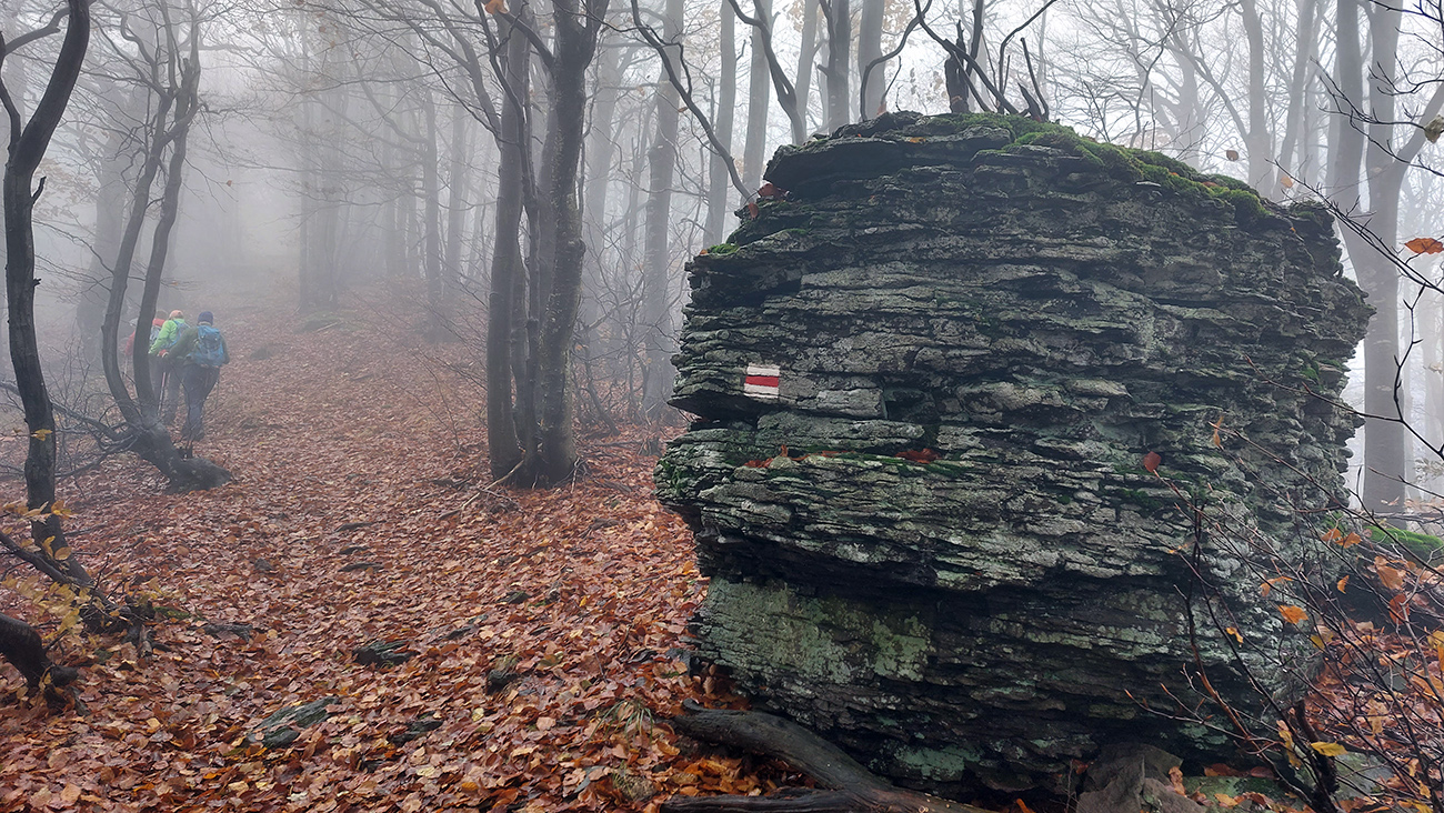 Potom dlhšie hore lesmi na Vtáčnik, to už farby bledli, lebo hrebeň držal hmlu a aj tam fičalo nepríjemne, sychravo, z juhu. Až miestami zo stromov pršalo. Ale cestou pár pekných miest, nejaké tie huby a šutre a studničky a lúky a tak... Farebno hlavne na stromoch, lebo zelené značky náučného chodníka, ale aj žltá a modrá turistická. Nad smerovníkom Siahy sme neodolali pozrieť červenými postavičkami značenú odbočku doprava, ktorá sa neskôr ku značke znovu pripája. Ale nič neobvyklé na nej, len jedno zaujímavé suťovisko (Skalné veže Horný kostolík sú trochu nižšie pod chodníkom.).