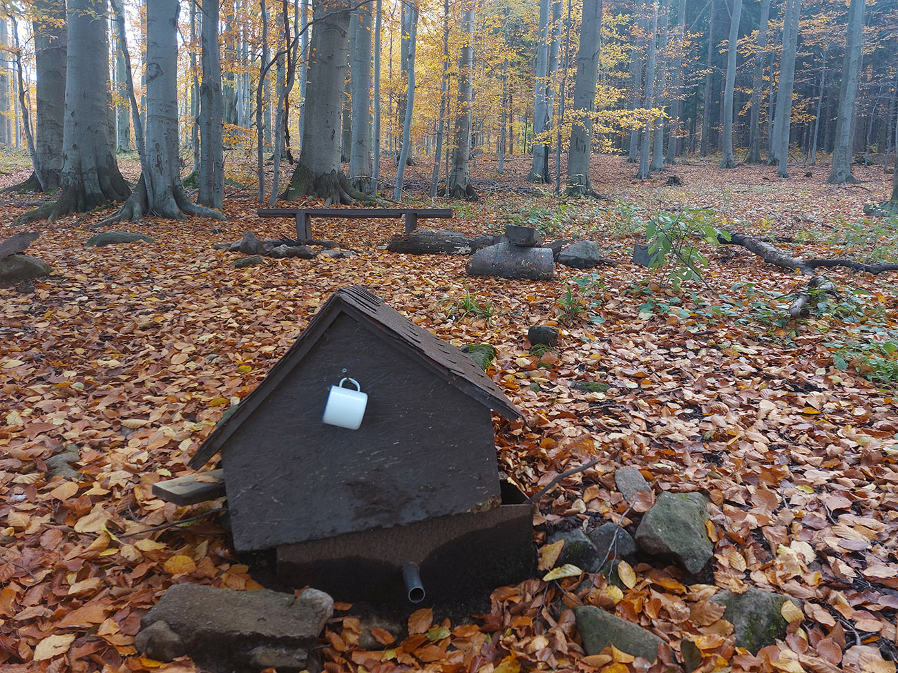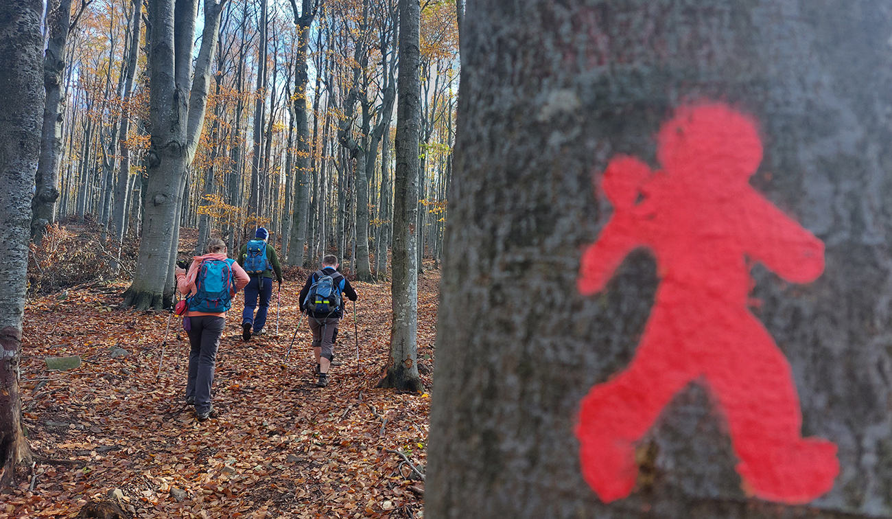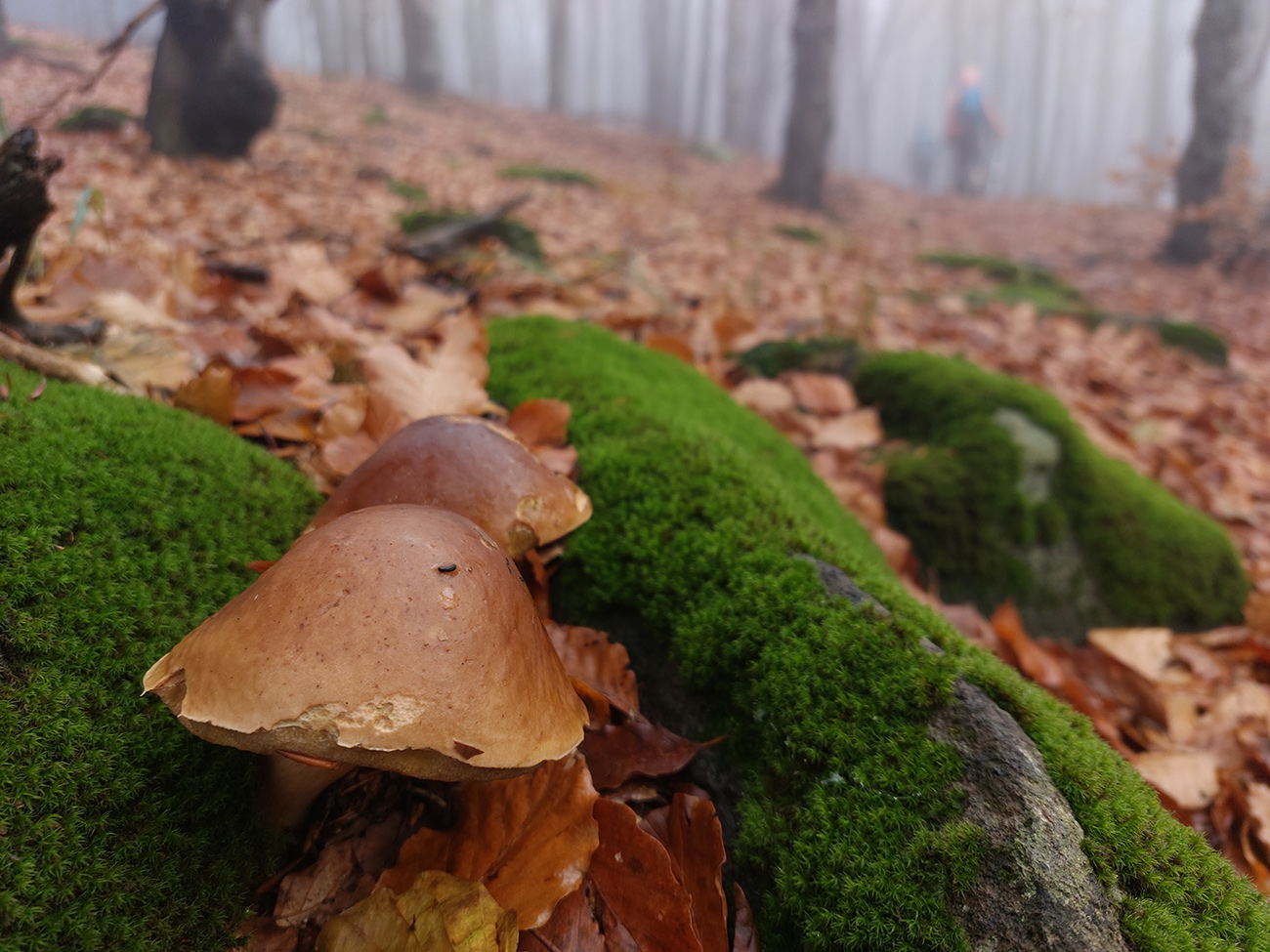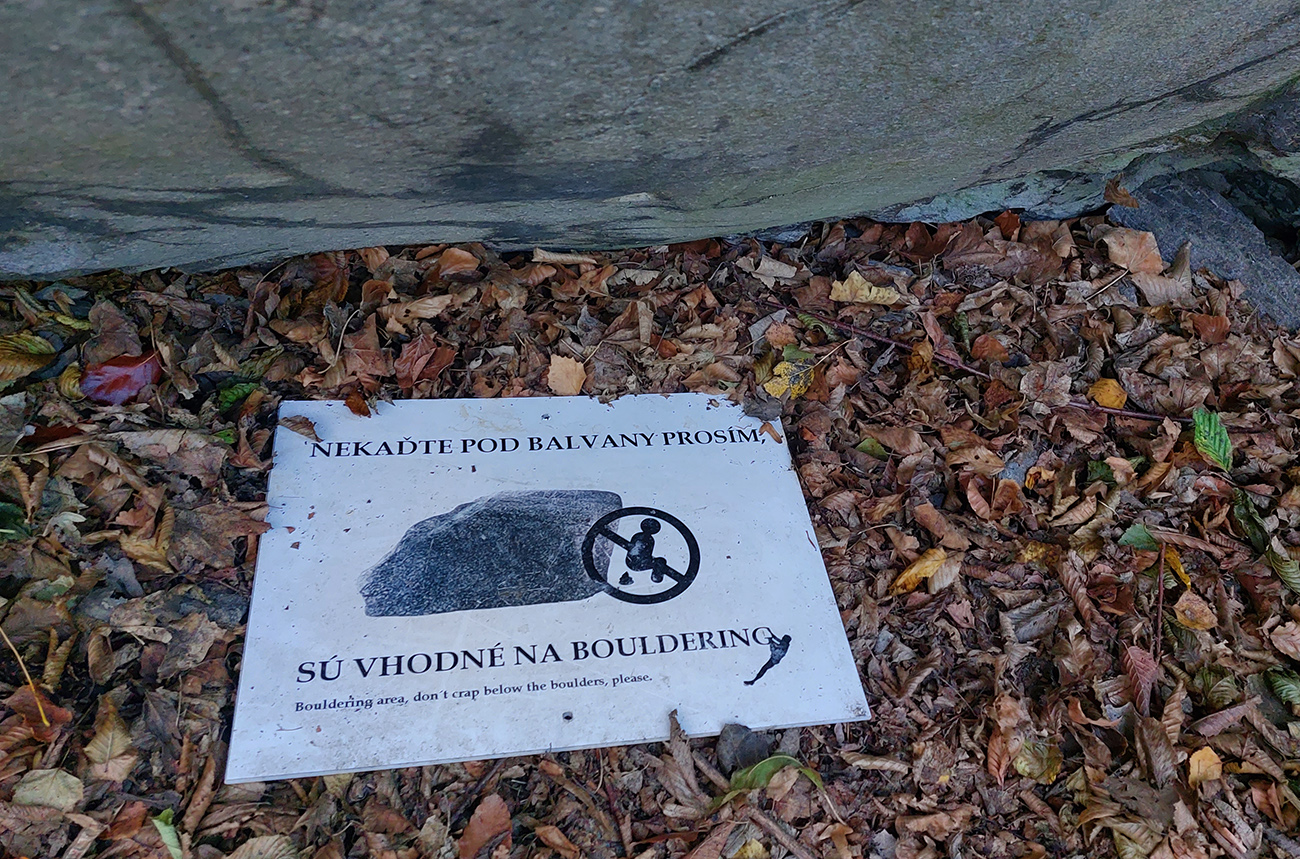 Potom dlhšie hore lesmi na Vtáčnik, to už farby bledli, lebo hrebeň držal hmlu a aj tam fičalo nepríjemne, sychravo, z juhu. Až miestami zo stromov pršalo. Ale cestou pár pekných miest, nejaké tie huby a šutre a studničky a lúky a tak... Farebno hlavne na stromoch, lebo zelené značky náučného chodníka, ale aj žltá a modrá turistická. Nad smerovníkom Siahy sme neodolali pozrieť červenými postavičkami značenú odbočku doprava, ktorá sa neskôr ku značke znovu pripája. Ale nič neobvyklé na nej, len jedno zaujímavé suťovisko (Skalné veže Horný kostolík sú trochu nižšie pod chodníkom.).