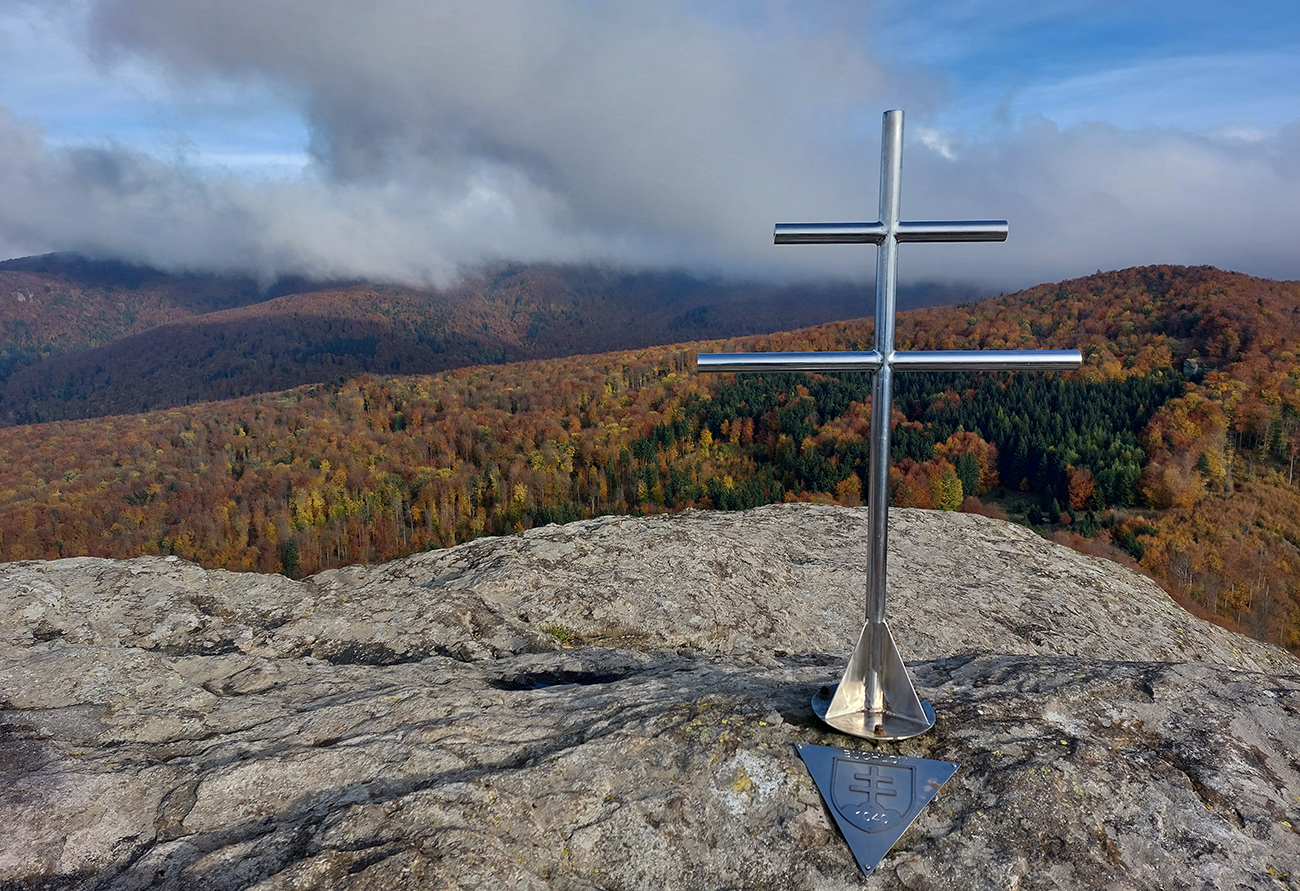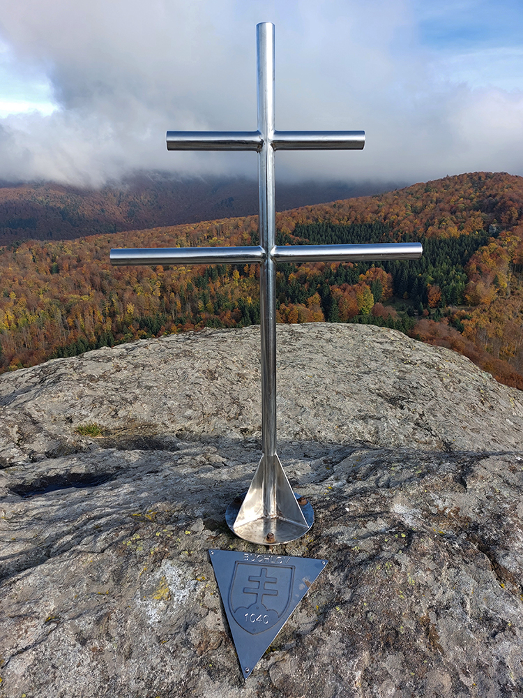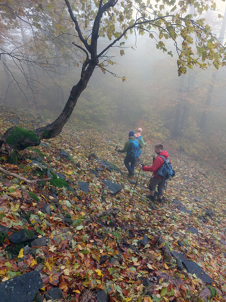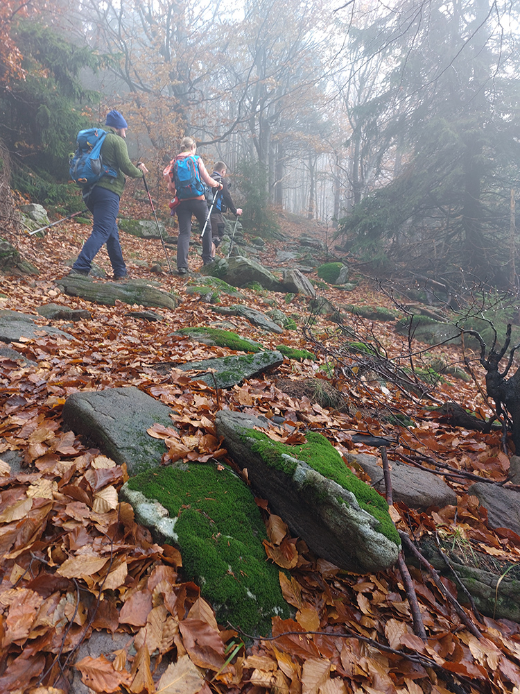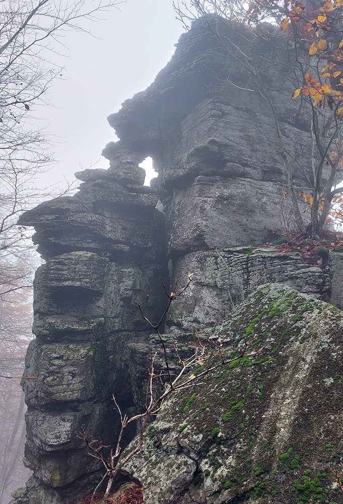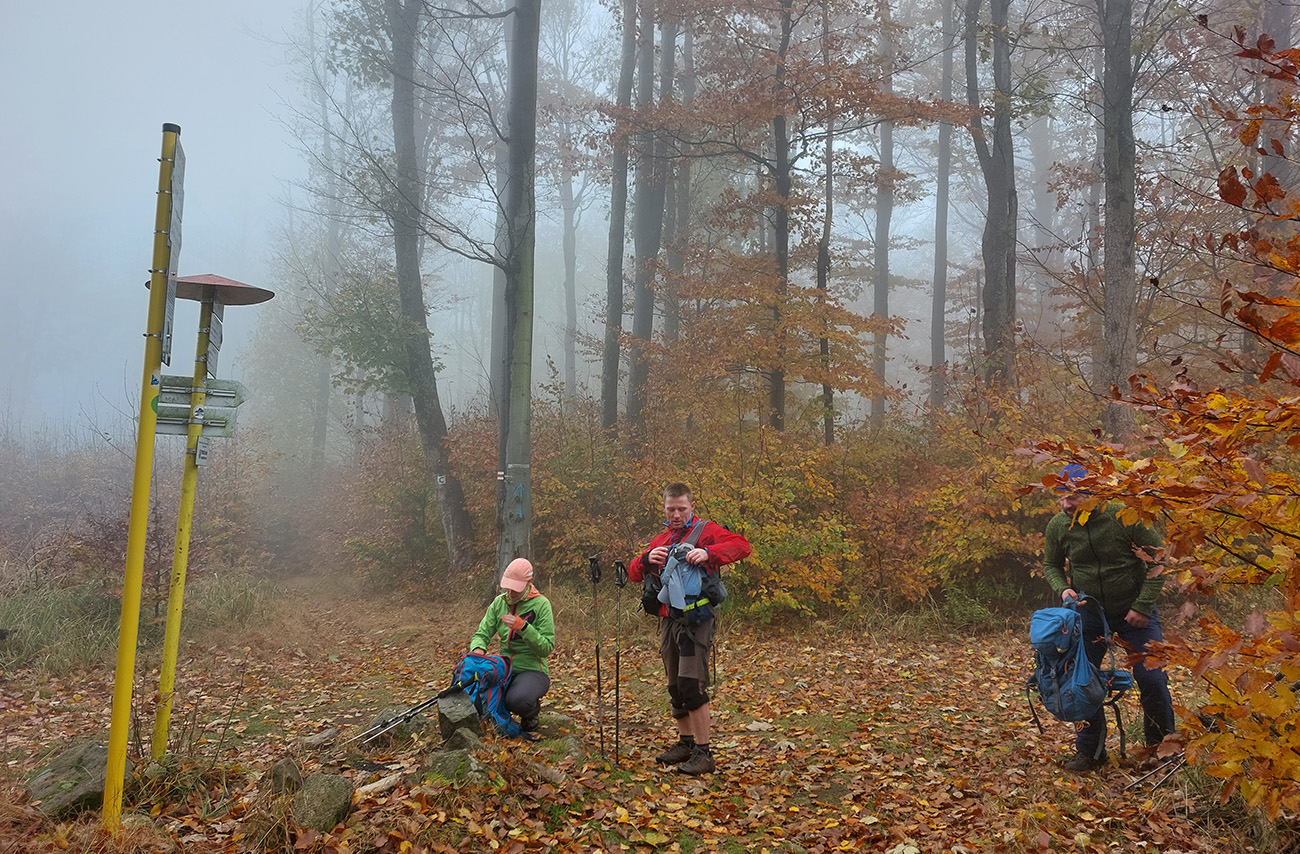 Pri kríži mlieko a fičák, dlho sme sa nezdržali a o chvíľu už sme šmejdili po hlavách skalných veží v masíve Kláštorskej skaly a hľadali sme známe skalné okienko v tvare kríža. Našli sme, odfotili a davaj ďalej po hrebeni. Príjemná cesta lesným tunelom, teraz navyše ozvláštnená a skrášlená farbami a hmlovými efektami.