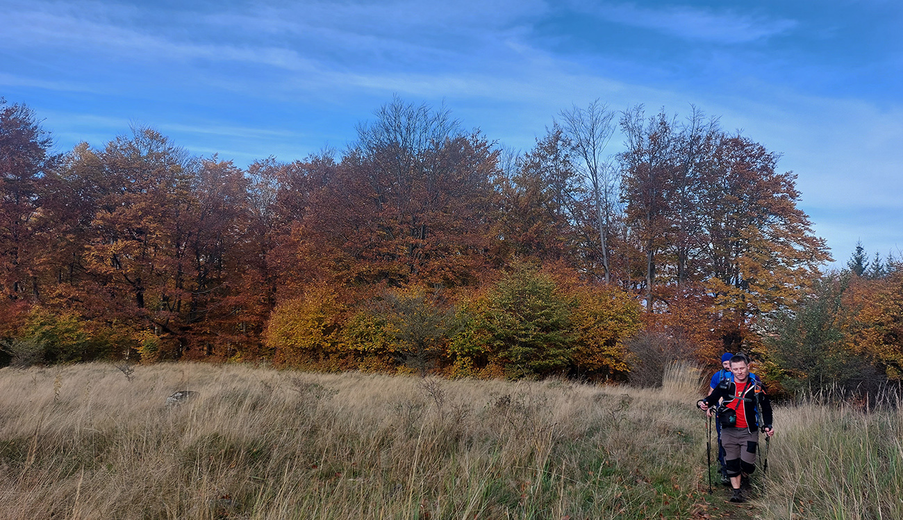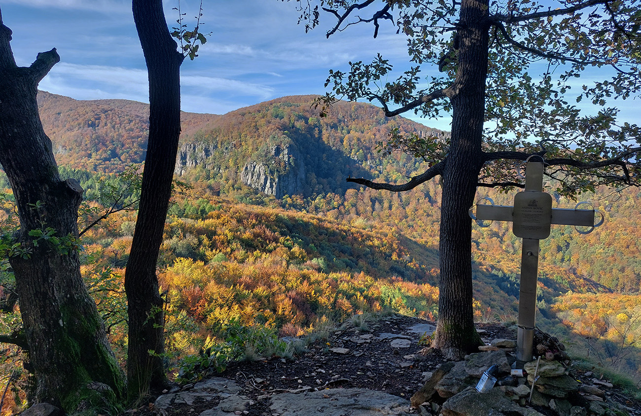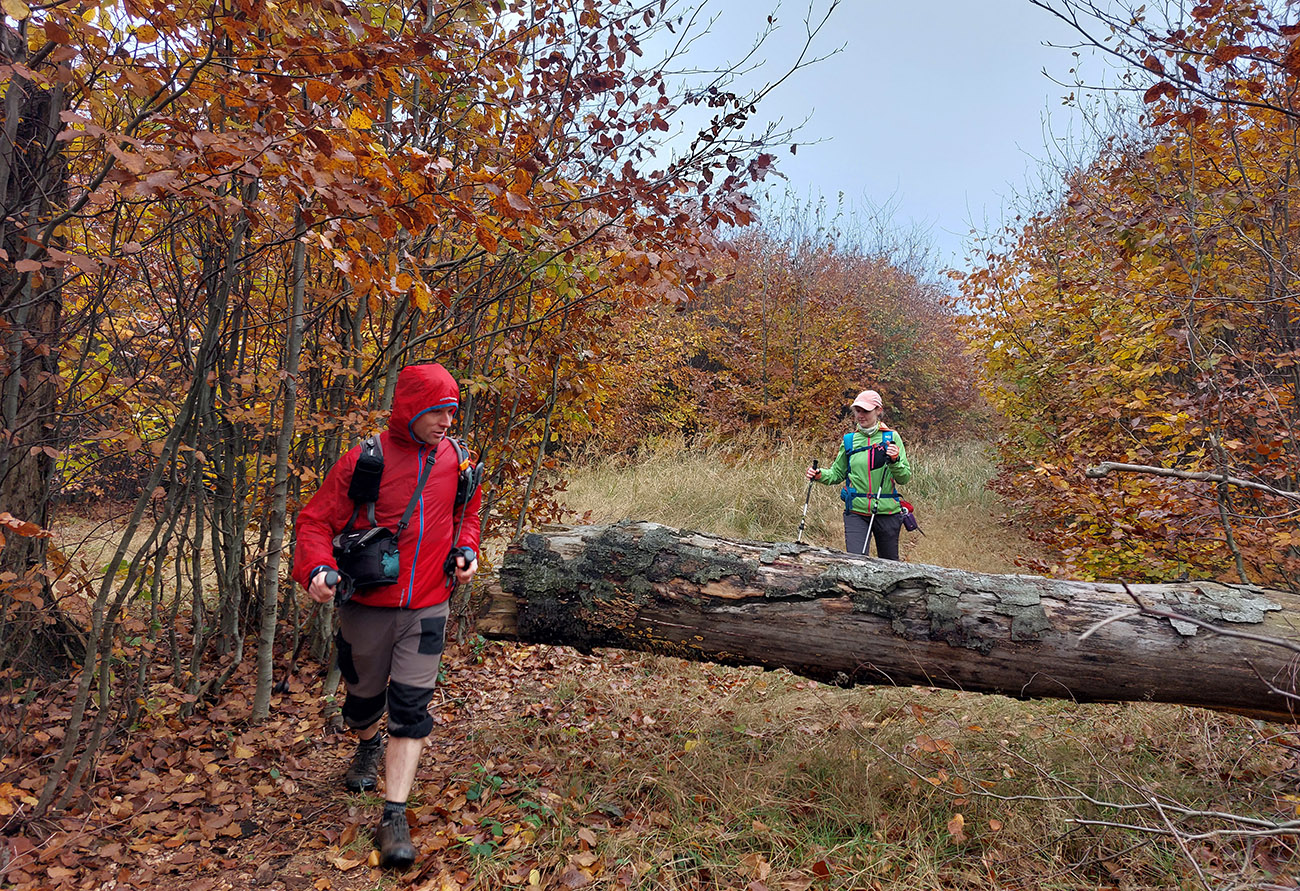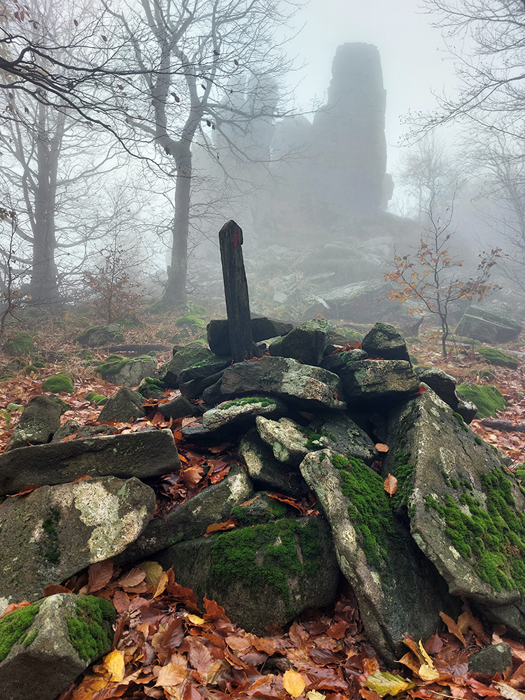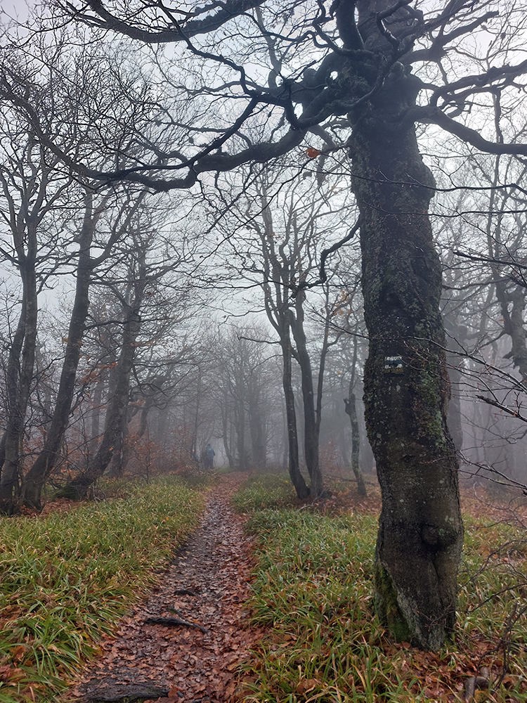 Pri kríži mlieko a fičák, dlho sme sa nezdržali a o chvíľu už sme šmejdili po hlavách skalných veží v masíve Kláštorskej skaly a hľadali sme známe skalné okienko v tvare kríža. Našli sme, odfotili a davaj ďalej po hrebeni. Príjemná cesta lesným tunelom, teraz navyše ozvláštnená a skrášlená farbami a hmlovými efektami.