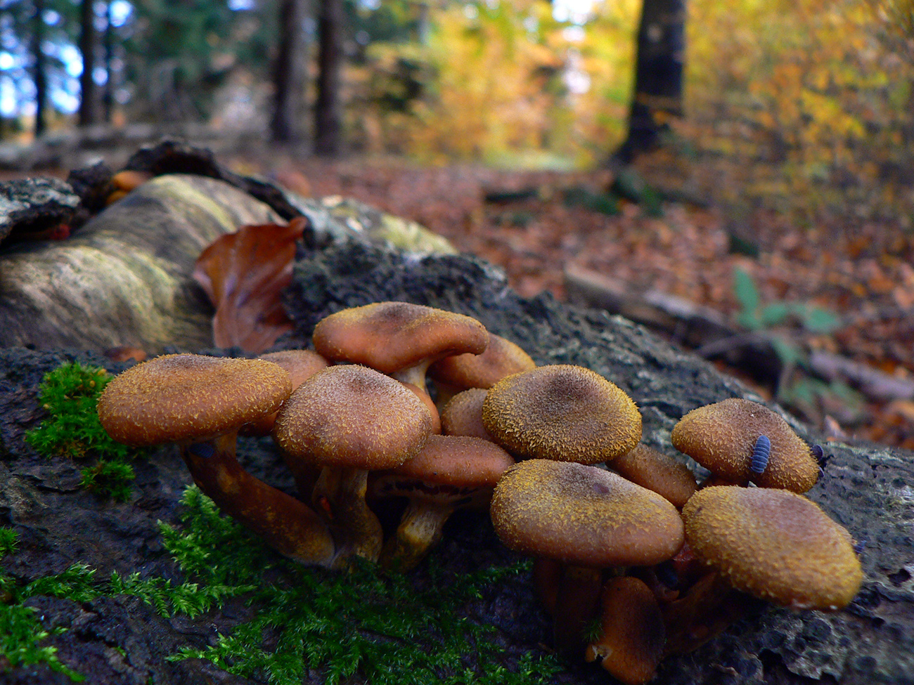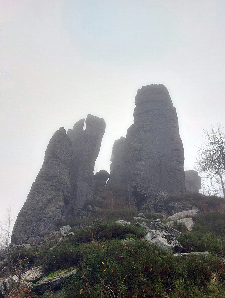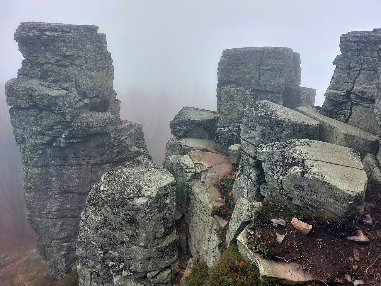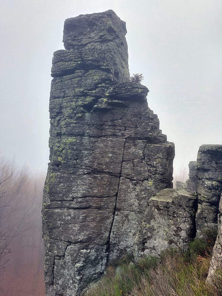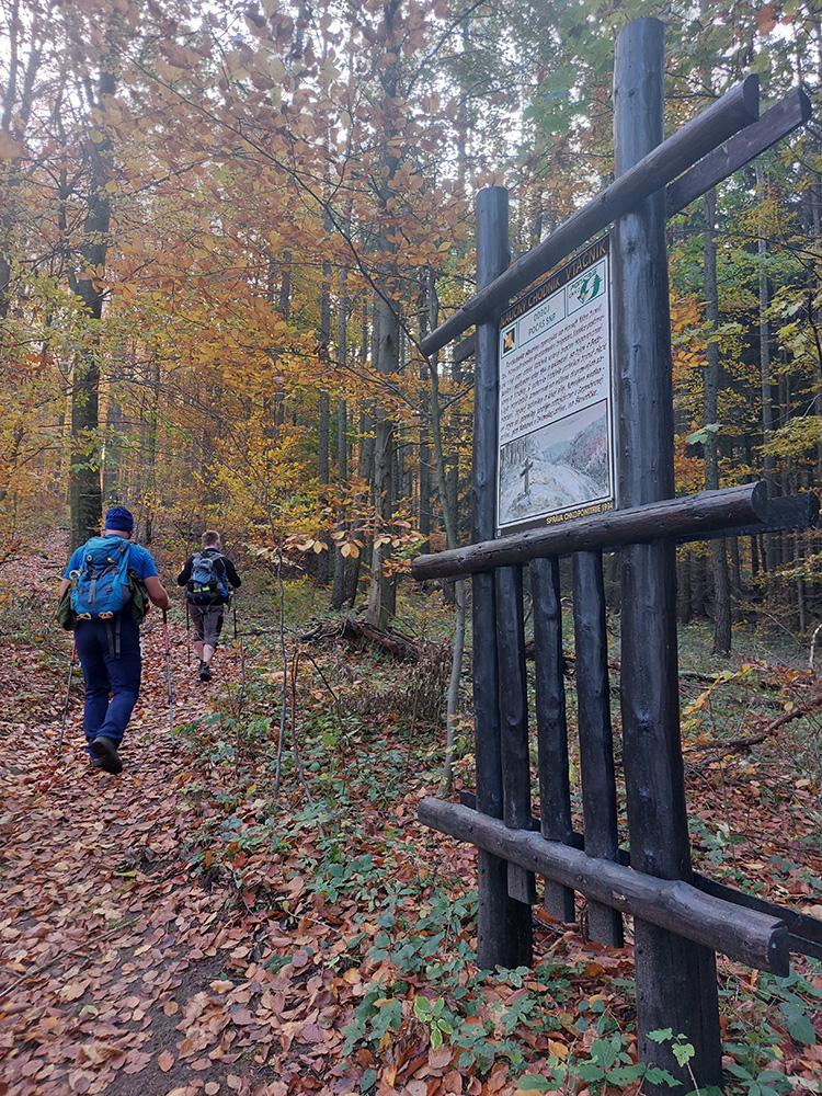 Pri kríži mlieko a fičák, dlho sme sa nezdržali a o chvíľu už sme šmejdili po hlavách skalných veží v masíve Kláštorskej skaly a hľadali sme známe skalné okienko v tvare kríža. Našli sme, odfotili a davaj ďalej po hrebeni. Príjemná cesta lesným tunelom, teraz navyše ozvláštnená a skrášlená farbami a hmlovými efektami.