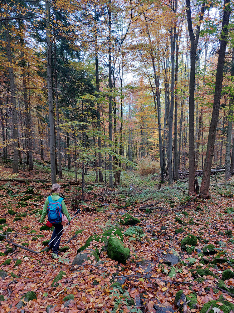 Potom už len návrat na Zadnú lúku, strmší zostup po hrboľatom lese s mnohými prameniskami a čvachtavým podkladom a záver po asfalte Bystričianskej doliny nazad na Sekaniny. Ale ani na dne doliny nuda nehrozí, lebo sa ide popod chránené lesy a bralá Veľkej skaly. Veľmi pekná prechádzka to bola! Ďakujem partii, že mi ukázala zase nové možnosti.
