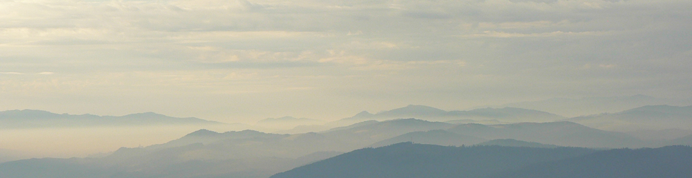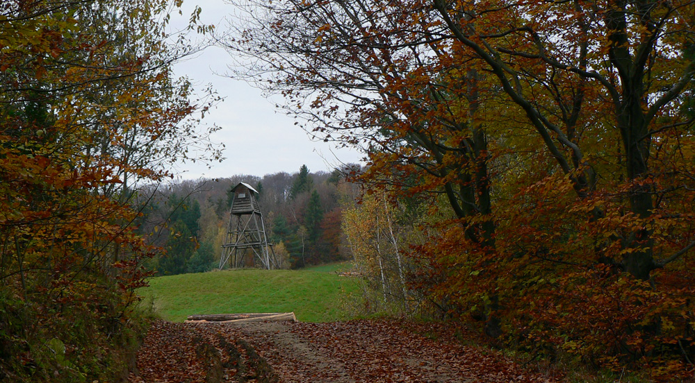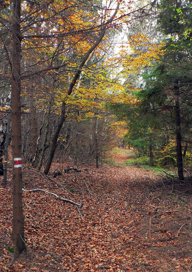 Preventívne klušem hneď na začiatku - na asfalte sa netreba dívať pod nohy, môžem obzerať krajinu a aj sa zohrejem a rozhýbem po piatich hodinách cestovania. Za Hradiskom namiesto asfaltu pohodová cesta lúkami, v okolí postupne pribúdajú stromy. Tak ešte posledné ohliadnutie dozadu, na panorámu zahmlenej kotliny s trčiacimi vrcholkami Stráží a ponáram sa do farieb lesa, pritlmených tieňom mrakov. Cestou zmiešaným porastom k sedlu Čergov však s nádejou sledujem rozširujúci sa modrý pásik na severnom obzore.