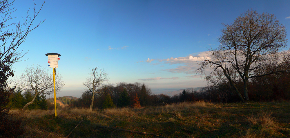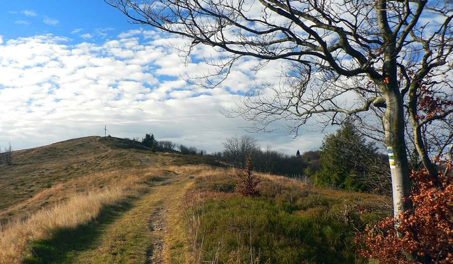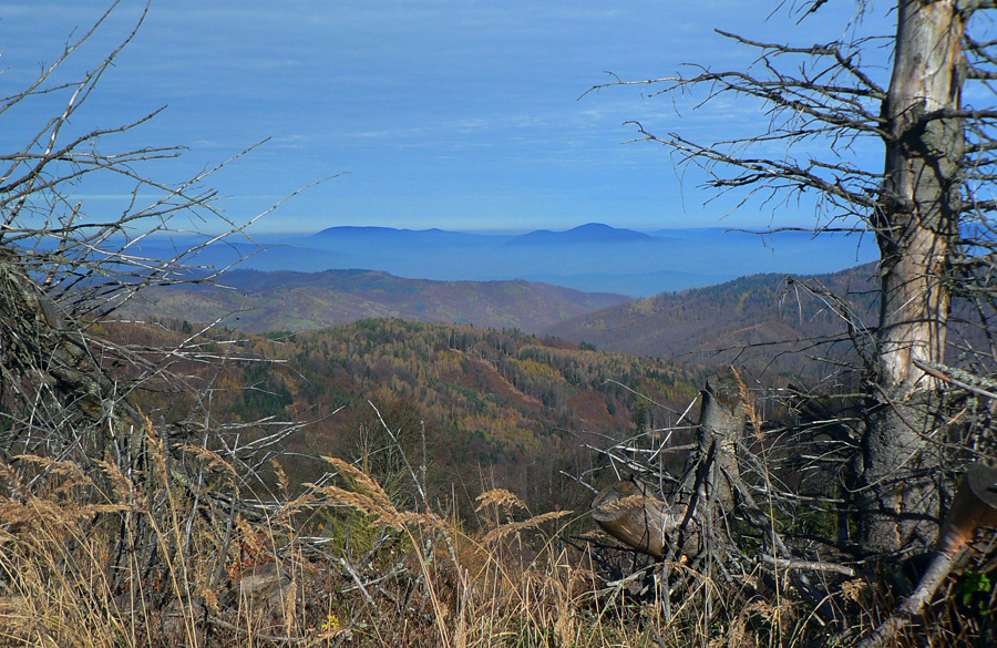 Okolo chát v sedle sa zdá, že to tu celkom žije v lete aj v zime. Trochu sa tu pomotám a do stúpania na vrchol Čergova odchádzam už so slnkom v chrbte. Hurá! Farby prešli do gýčových! Znova pribúdajú lúky, za vrcholom Čergova to začína naplno, hrebeň je najmä na južných svahoch odlesnený už storočia. Otvárajú sa prvé pohľady na Tatry. Za Chochuľkou idem chvíľu dokonca v ústrety Kráľovej holi, ako sa chodník točí na západ. Na druhú stranu sú výhľady zriedkavé, len cez občasné rúbaniská: v diaľke dominuje Busov. Ako stúpam na Veľkú Javorinu, po ľavej ruke míňam územie prvej súkromnej prírodnej rezervácie. Vlčia sa za tých pár rokov stala pojmom, držme palce, aby sa jej darilo aj ďalej. Lebo rúbaní okolo nej pribúda vraj posledné roky akosi priveľa. Ako na celom Slovensku, drevárska lobby nezaháľa :-(