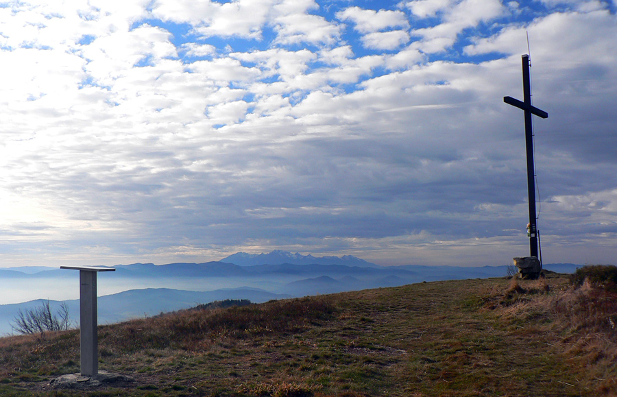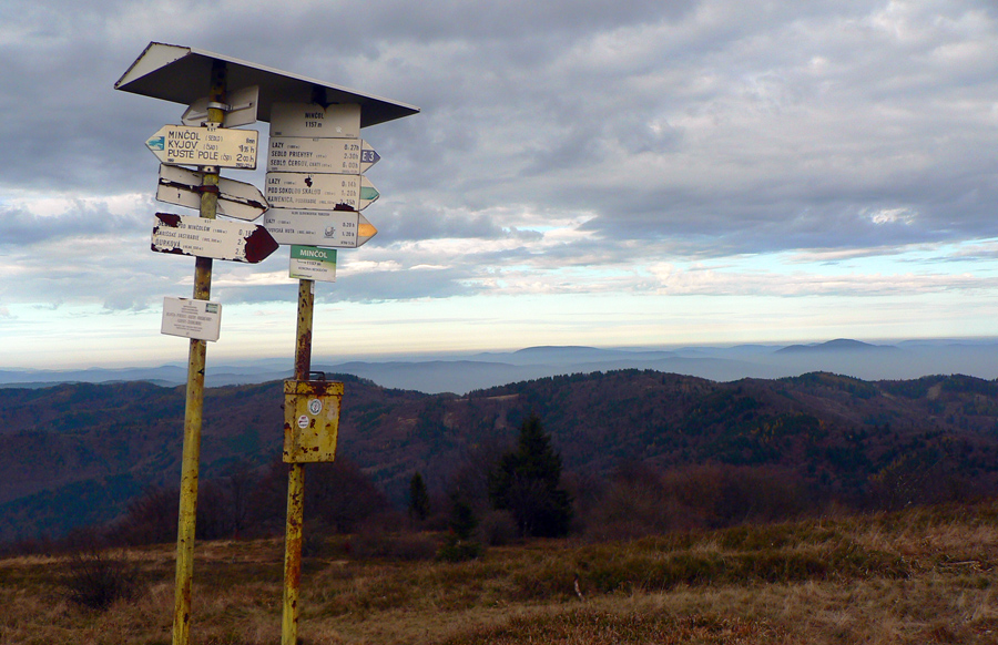 Presne na poludnie dobre padne odpočívadielko pod smerovníkom v sedle Uhlisko. Môžem si dovoliť pauzu, už mám náskok a na Minčol je to už iba kúsok. Stále rovnako peknou krajinou horských lúk a farebných lesov, mierne stúpajúc. Na Lazoch nieto chalúp, len kaplnka v čučoriedkach. V prieseku lesa už vidieť kríž na predvrchole Minčola, pri ňom je aj smerová ružica a výhľady sú zas kruhové. Len sa opäť zaťahuje, škoda. Inak na kríži je smerovka k studničke a útulni pod kopcom, dobrý tip!