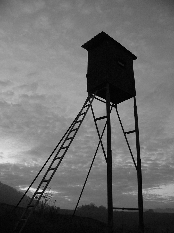 Na Minčole: ohlodaný betónový pylón, na obzore Tatry, Pieniny aj zvyšok mojej dnešnej cesty cez Malý Minčol. Tá už podľa mapy má viesť prevažne lesom a trvať tak tri hodinky. Tak aj je. Len pár lúk na začiatku a potom až nad Obručným sa vynáram z lesa. To už sa stmieva, slnko zapadlo kým som sa motal po lese, tak na dokumentáciu končiaceho dňa využívam vysoký posed. Dedina je maličká, len pár domácich sa divne díva, kto sa im to tu za šera motá. Autobus ma našťastie berie, to je základ. Vydarený deň môže skončiť dvestokilometrovou cestou domov :-)