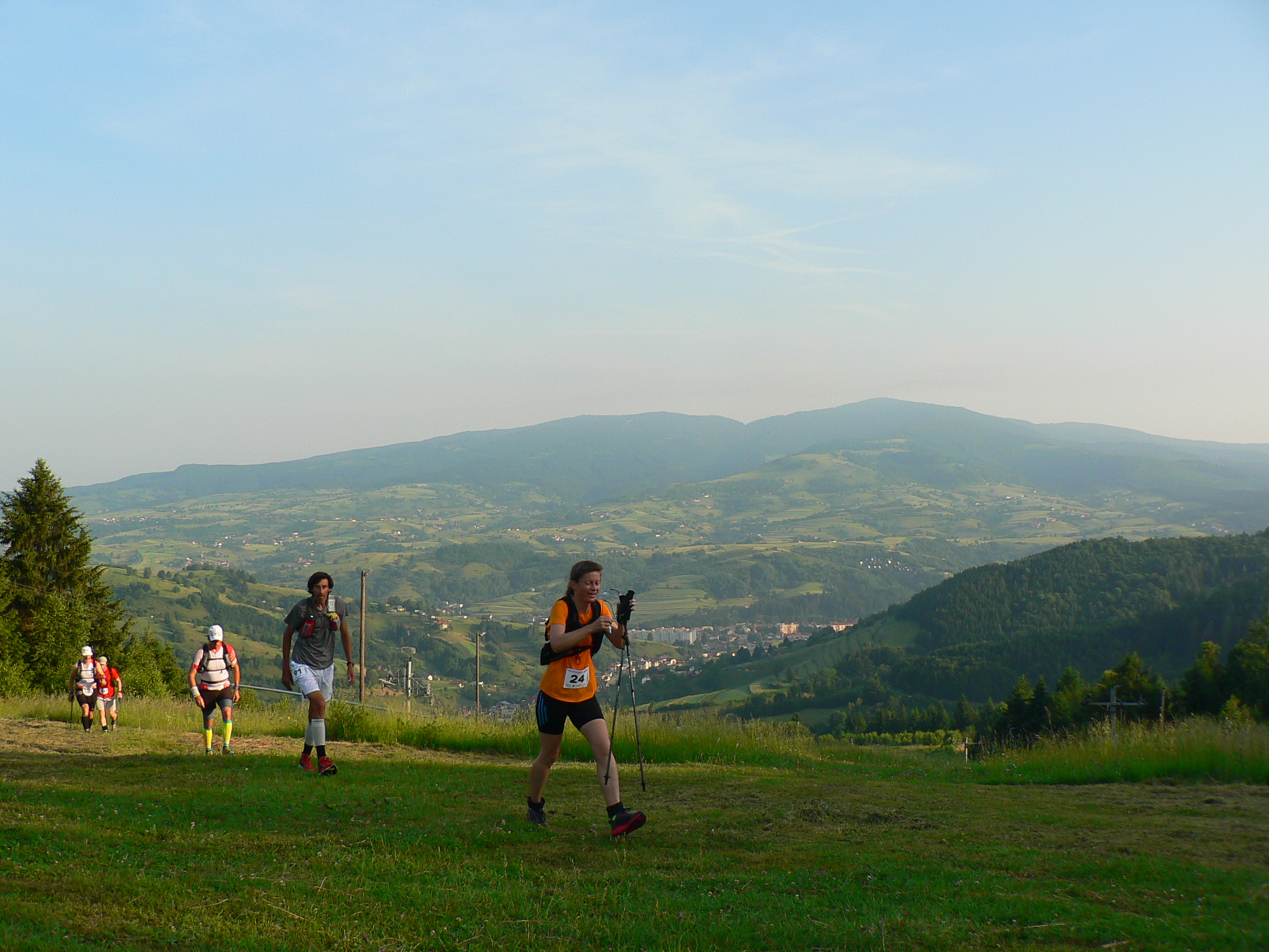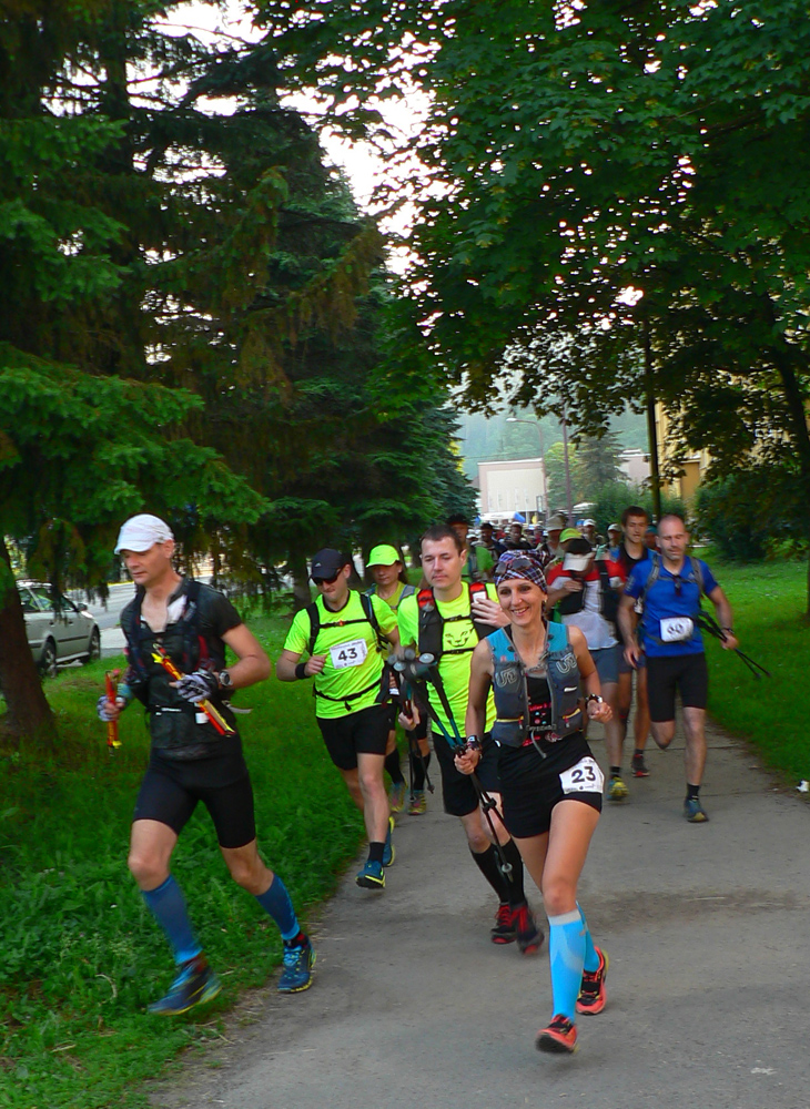 Už skoré ráno je nielen teplé, ale aj dusné. Z námestia s bronzovým fujaristom nás do toho pekla presne o šiestej posiela fujarista skutočný a ja zisťujem, že stíham nadbiehať kvôli fotkám, lebo čelo nebeží ako divé, šetrí sa. Ale len po spodok zjazdovky. Vertikálny kilometer popod vlek: trávu okrem rosy zvlažujú aj prvé litre potu a dav sa pekne naťahuje. Dusno je fest, v pozadí zaparená Poľana.