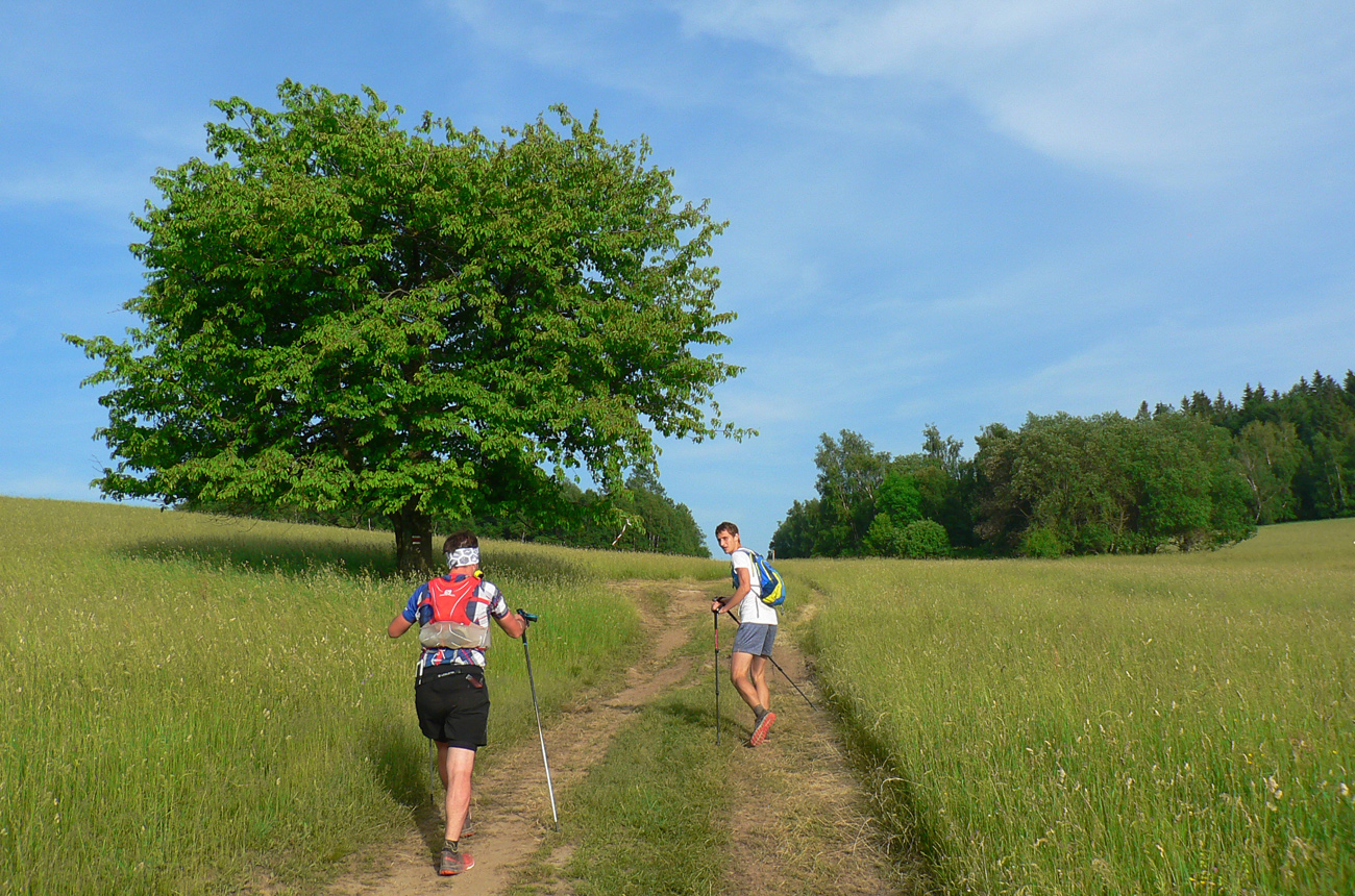 Hore to začína: pláne otvorenej lúčnej krajiny s ďalekými výhľadmi, bez tieňa. Hlavne že meteorológovia na dnes odporučili obmedziť pohyb na slnku len na nevyhnutný čas :-) Oskar do nás búši plnou silou. V lese to nie je o nič lepšie, lebo tam sa zas vzduch nehýbe. A tak sa to strieda až do cieľa, len lúk je oveľa viac ako lesa. V tomto počasí dokonalá vychutnávačka. Zato tie lúky sú nádherne farebné, práve naplno rozkvitnuté. Alergici to isto oceňujú.