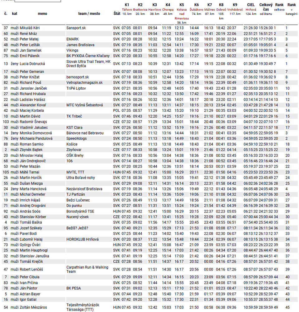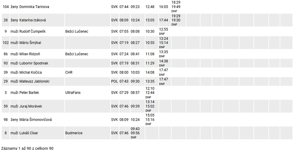 Nakoniec s obrovským prehľadom a náskokom vyhral Miki Kéri. Druhý René Mráz sa vraj musel v sedle Chorepa poliečiť zo pol hodinku povaľovaním v tieni, ale návrat po zranení je to parádny. Tretí došiel Peter Matej. Lucia Dobrucká išla od štartu s chlapmi a nechala ich pred sebou len šesť. Monika Domovcová a Michaela Pandulová prišli spolu o dobré 3,5 hodiny neskôr. Zato Julo Kaľavský to musel kvôli kombinácii viacerých zlých náhod zabaliť v Kokave, Mateja Oravca vyplo prehriatie definitívne v Málinci. Moniku Halúskovú doviezli do cieľa zabalenú v deke... A odpadlíkov bolo oveľa viac, takmer polovica! Veď výsledky ukradnuté z Ultra Hikingu sú dole v galérii. Potom som si v nedeľu prečítal v novinách, ako lekári v sobotu ošetrili rekordný počet kolapsov z tepla a ako neodporúčajú medzi 11. a 15. hodinou dlhší pobyt na priamom slnku, hehehe...