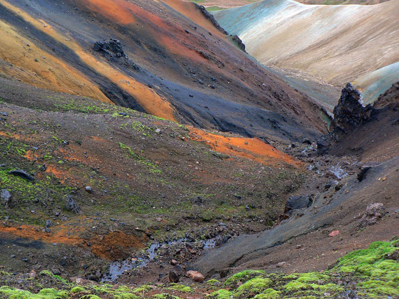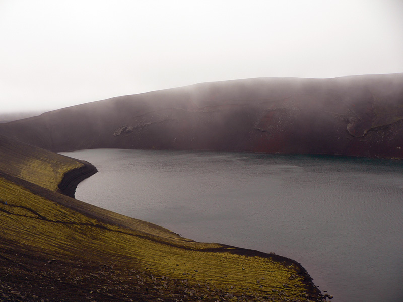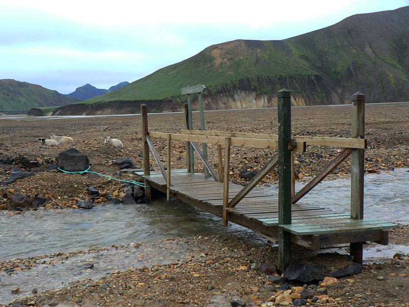 Takže dnes to už ozaj končí :-( Ale bus má pre nás prísť až o deviatej, škoda nevyužiť poslednú príležitosť na prechádzku Dúhovými horami, aj keď mraky visia „proklatě nízko“. Ešte za šera preskakujem potoky východne od kempu a už sa aj štverám na Rejkjakollur, jednu z mnohých dominánt nad Landmannalaugarom. Jeho vrchol je našťastie pod úrovňou oblakov. Výstup nie je namáhavý ani dlhý, o to viac si vychutnávam atmosféru rodiaceho sa dňa. Ani vietor veľmi nedobiedza, len občas donáša drobné kvapky zhora a ovčie hlasy zdola. S pribúdajúcim svetlom krajina pod sivou clonou mrakov láka stále intenzívnejšími farbami a núti odkladať zostup. Ale je čas na návrat, balenie a odchod do šedej reality. Takže cestou k chate už len pozdravím tri ovečky, strážiace mostík cez potok, a ponáram sa do prebúdzajúceho sa ruchu turistickej „základne“.