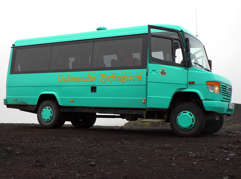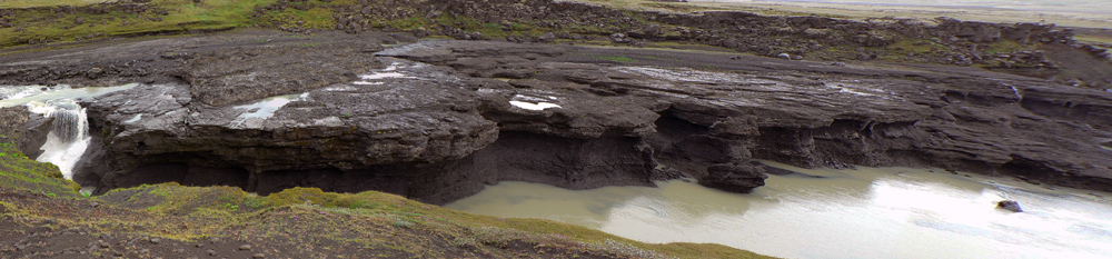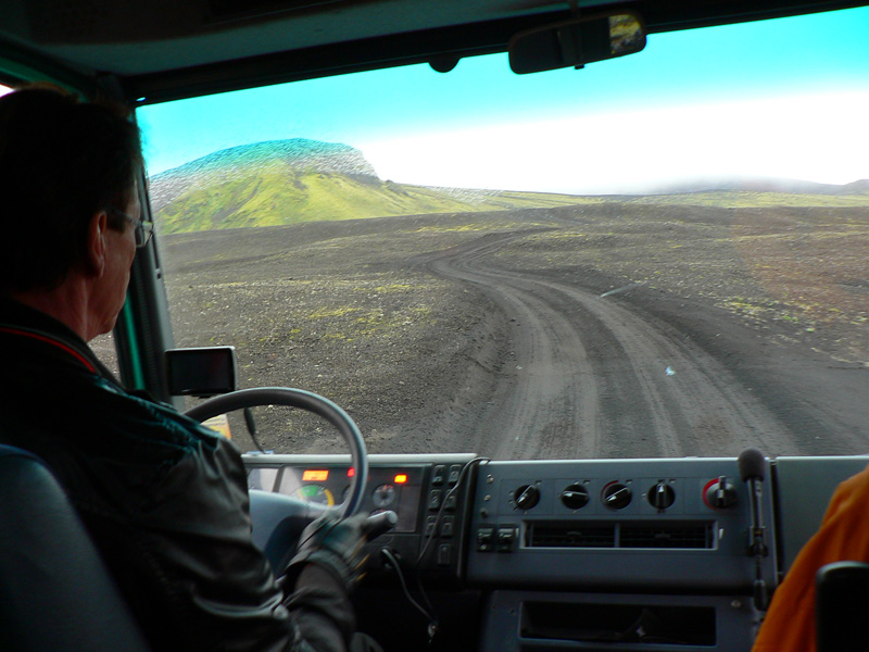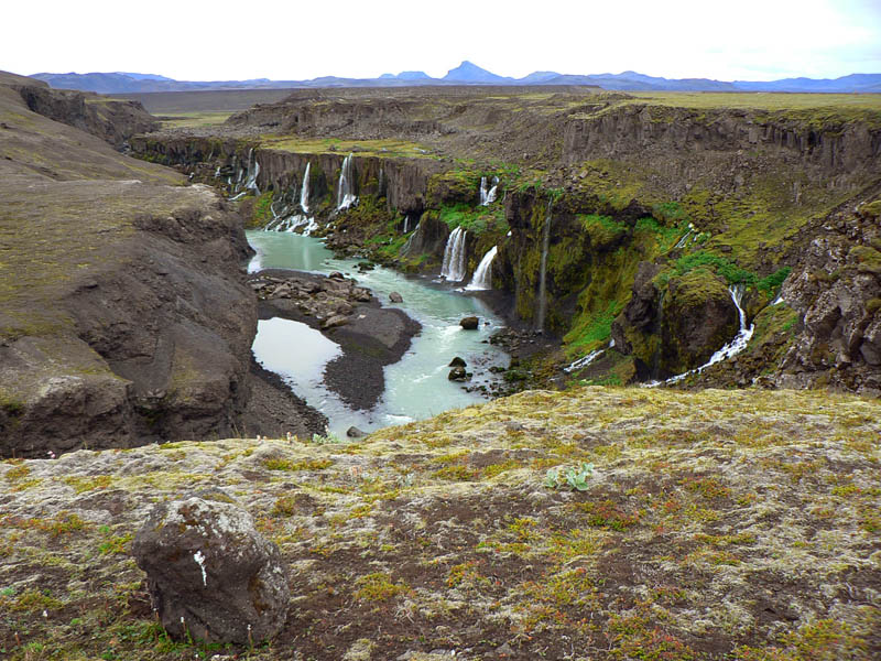 Onedlho nás už islandský šofér s kľudom Angličana vezie cez brod a po nekonečných hrboľatých kilometroch vegarslóði - čiernej cesty, len prehrnutej radlicou v čiernom popole. Smer sever, aby sme sa napojili na asfaltku do Rejkjavíku. Dosť dlho sledujeme elektrické vedenie - zaujímavé že jeho stĺpy sú z dreva - možno lepšie odolávajú miestnej klíme ako kovové. Cestou samozrejme ešte zopár zastávok na rozptýlenie: vodou zaliaty kráter Ljötipollur s tehlovočervenými strmými svahmi, vodopády na rieke Tungnaá, vytekajúce doslova spod zeme, takmer suchý vodopád Hrauneyjafoss, ktorému všetku silu berie elektráreň, a čerešnička na torte - vodopád Hjálparfoss v historicky aj prírodne zaujímavom údolí Þjórsárdalur. Mohutný, dvojitý, padá do romantického oválneho jazierka, obklopeného zeleňou a stenami z geometricky sa rozpadajúceho čadiča.