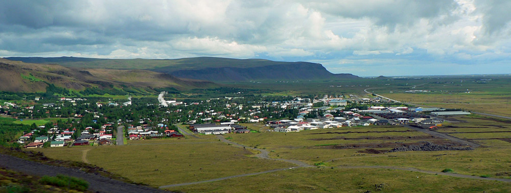 V krajine, ubiehajúcej za oknami, pribudlo zelene, ale aj mrakov. A Hekla, okolo ktorej sa už dlhšie presúvame, ani za nič sa nechce ukázať. Aj ostatné kopce ustúpili dozadu, sme v širokej a úrodnej nížine najdlhšej islandskej rieky Þjórsá. Cesta ako pravítko, k tomu vietor – tu by bola cyklistika riadnym utrpením. A ako naschvál, o chvíľu predbiehame dvojicu na nabalených bajkoch - a na brašniach vzadu slovenské vlajky! Tak šťastnú cestu krajania! My sa rútime na západ do Hveragerði, mesta skleníkov. Ale nie kvôli nim – ideme sa ešte okúpať na miestnu plaváreň pod holým nebom. Hodina a pol blbnutia v bazénoch rôznej teploty bol dobrý nápad, ale všetci sa už tešíme na Reykjavík. Cestou ešte míňame ďalší zo symbolov Islandu – geotermálnu elektráreň, ktorú však kvôli oblakom pary takmer nevidieť.
