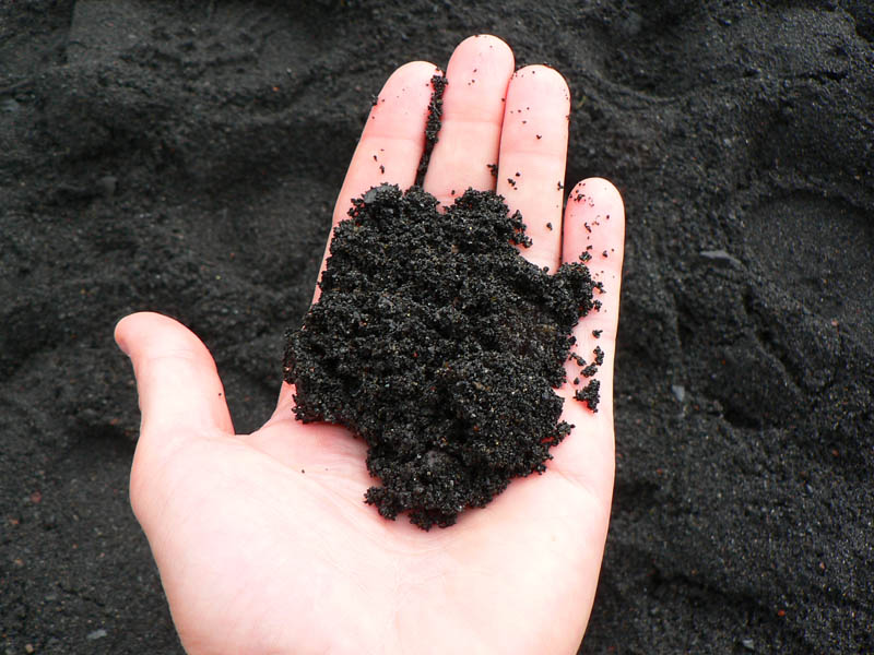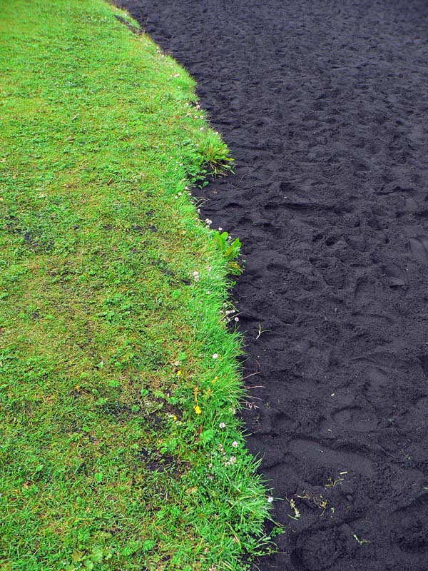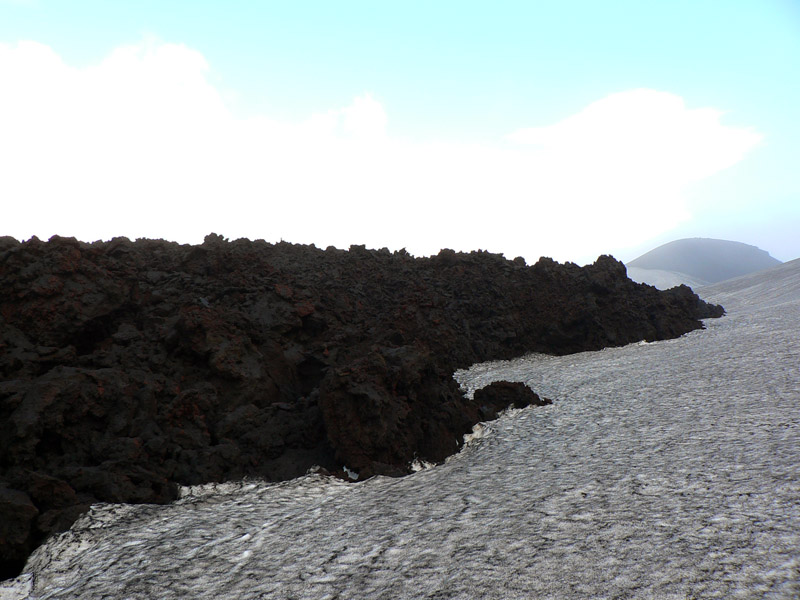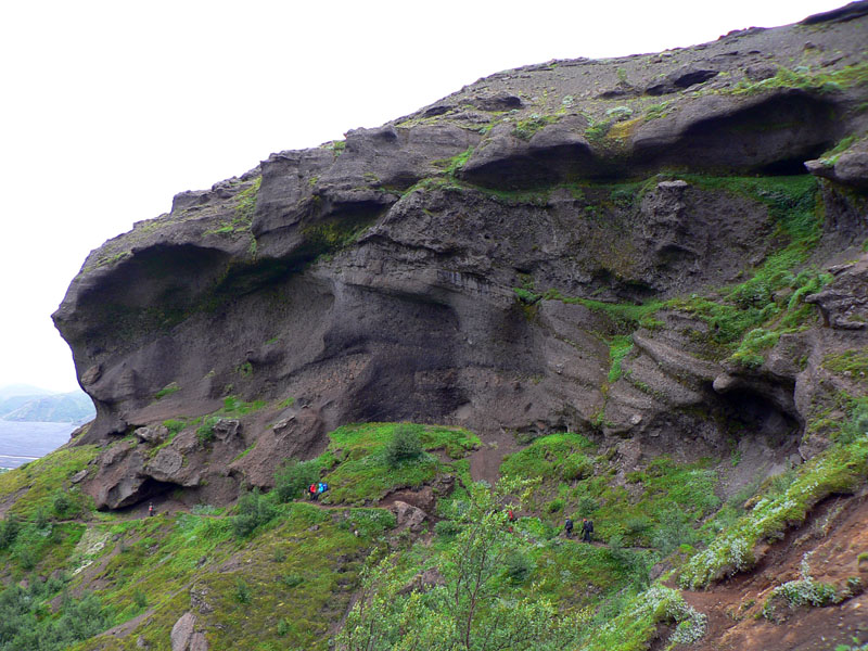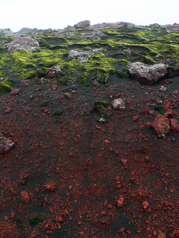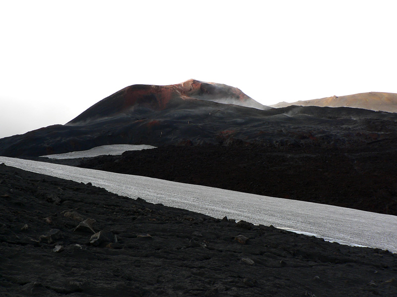 Ďalší kus cesty pripomína mesačnú krajinu, až na veľké snehové polia, na ktorých sa dá miestami pošmýkať. Ale len na strmých svahoch, povrch snehu je čierny od popola, ktorý dosť brzdí. A špiní, tu nie je dobré spadnúť na zadok :-) Mraky zas trochu ustupujú, takže miestami sa z nich vystrkuje ľadová kopula Eyjafjallajökullu na západe. Míňame odbočku k chate Fimmvörðuskáli, ktorá je tu vraj už dlho – takže vlani mala asi dosť šťastia, sopka zúrila len pár stoviek metrov od nej. Aj my sa už blížime k vlaňajšiemu „miestu činu“. Prípravou na stretnutie s poslednými stopami vulkanizmu je hromada čerstvej lávy, stuhnutej do fantastických tvarov a kontrastujúcej s okolitými guľatými kopčekmi. Farba je ale rovnaká - čierna. Krajina sa tu od vlani vraj úplne zmenila, aj chodník bolo treba pretrasovať, ale napodiv kvietky všakovaké už sa derú na svetlo všade, kam oko dovidí! Kto vie či tu predtým bolo aj to veľké jazero, okolo ktorého ideme?