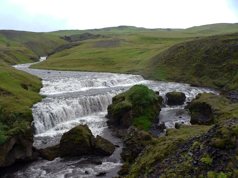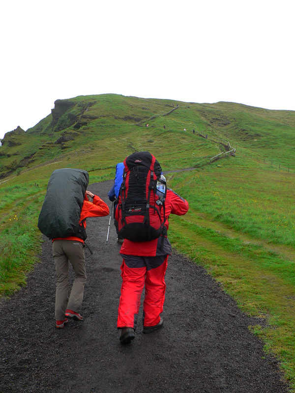 Všetky potraviny si nesieme v batohoch, lebo dokúpiť sa dajú až na konci. Takže poriadne zaťažení (aby s nami víchor nepohadzoval :-) prebíjame sa najprv pár stoviek metrov cez vlhké pasienky k obrovskému vodopádu Skógafoss. Včera večer sme ho unavení už príliš nevnímali, až teraz po priblížení si úplne uvedomujeme jeho majestátnosť. Po jeho východnom okraji vedú hore schody (vraj 183), nad nimi pokračuje mierne stúpajúca planina až do výšky nejakých 1100m. Pohľady nazad ukazujú úzku pobrežnú rovinu s meandrujúcou riekou Skógá, uloženou v čiernom piesku. Ten je vraj čerstvý, z vlaňajška.