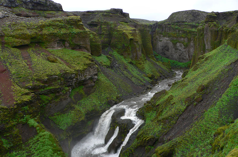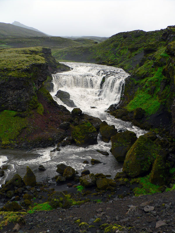 Mraky už prestalo baviť ustupovať pred nami, pri mostíku na hornom toku rieky je ako v práčovni a vraj nás čaká najmenej príjemná časť túry – viac ako hodinové, monotónne a plynulo strmé stúpanie po ceste do priesmyku Fimmvörðuháls (Priesmyk piatich mohýl). Tých „skalných mužíkov“ je po ceste oveľa viac, ale napriek nulovému výhľadu a jednotvárnej ceste aj tu je krásy dosť, len sa treba dívať viac pod nohy: mach na čiernom podklade je až krikľavo zelený, skaly hýria všemožnými farbami a tvarmi, medzi nimi vankúše kvetov. Je to krása napriek monotónnosti cesty, aj preto lebo je to iné ako u nás.