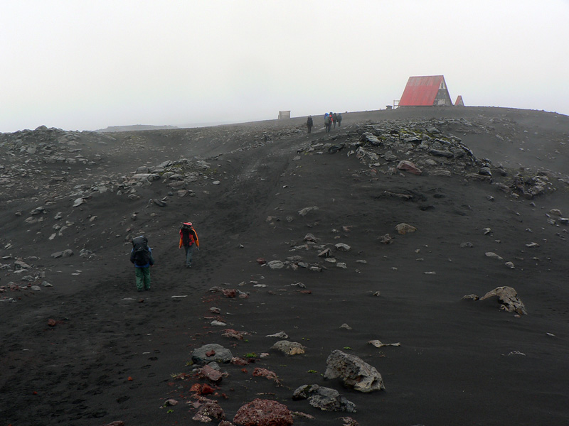 Z hmly sa konečne vynárajú špicaté siluety – väčšia patrí útulni Balduinsskáli, menšia záchodu :-) Aj meteorológovia tu majú malú automatickú stanicu. Nevyzerá to tu príliš udržiavané, ale vonku visí solárny panel, vo vnútri je núdzová vysielačka, malá kuchynka, dosť miesta aj pre väčšiu skupinu a v podkroví pár matracov. Dávame krátku prestávku na olovrant, odtiaľto to už bude pohoda, väčšinou z kopca.