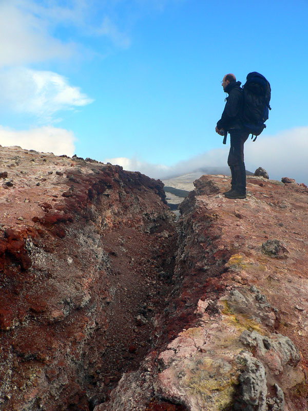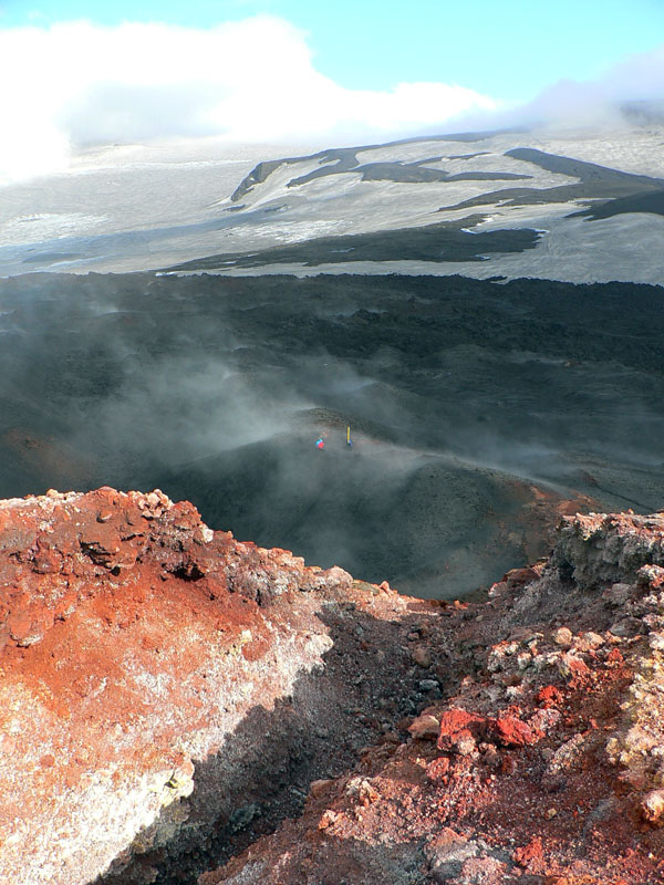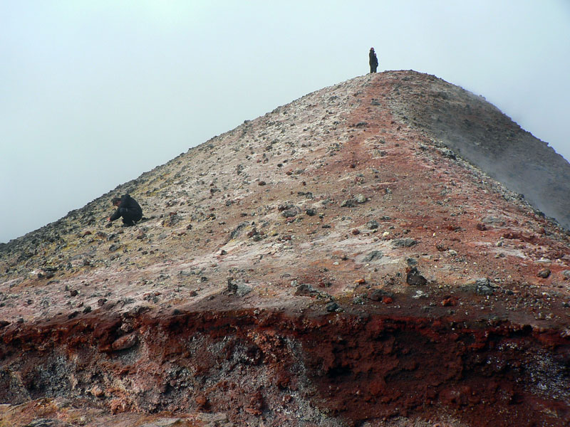 Začína to tu ale riadne smrdieť sírou. Mraky sa dvihli a miestami presvitá modrá, ale zo zeme sa na mnohých miestach parí. Alebo dymí? Asi aj aj. A niektoré miesta sú poriadne horúce, človek neudrží ruku na zemi položenú viac ako pár sekúnd. Obchádzame dúhovo zafarbený kopec s riadnou trhlinou na vrchole, z nej to smrdí najviac – ale je odtiaľ parádny výhľad a zostup nazad na chodník po horúcej struske je zaujímavá skúsenosť :-) To stojí za mierne priotrávenie. Pod kopcom je pre zmenu kráter, vyfarbený pekne do červena. Do toho už ale radšej nelezie nikto :-)