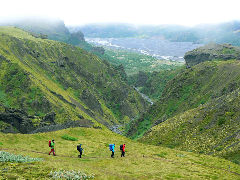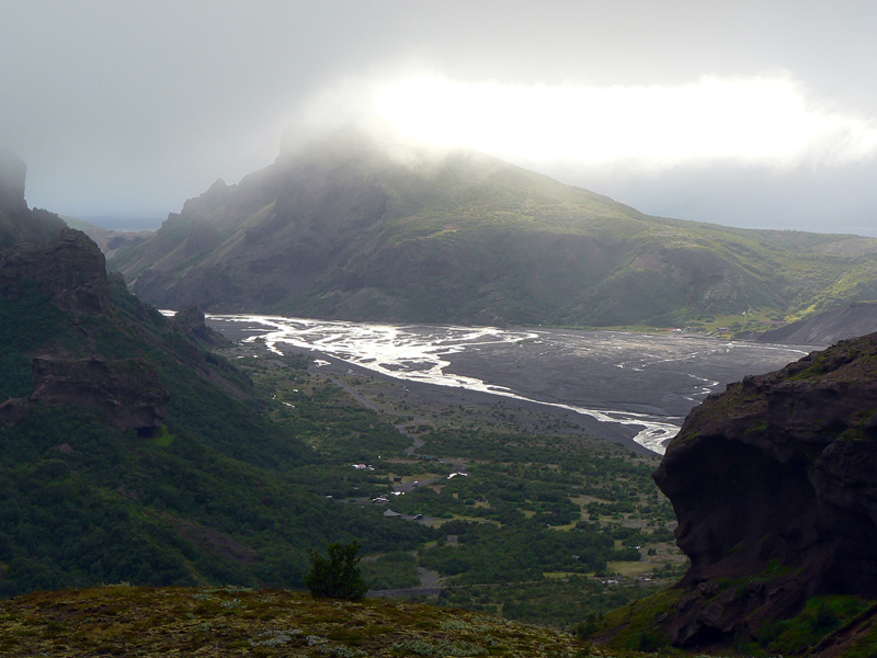 Po pochode hore-dolu pomedzi čerstvé krátery a syčiace pukliny začíname prudko klesať na plató Morinsheiði. Na pár miestach je to aj s reťazami, ale nič ťažké. Ide skôr o šmykľavý prach pod nohami. Mraky klesajú tiež, takže zase hodnú chvíľu šliapeme ako „v mlieku“. Zato keď sa po poslednom strmšom zošupe z mrakov vynárame, stojí to za to. Vľavo pod nami leží jedna z dramaticky rezaných dolín Goðalandu, celá v zeleno-čiernom. Pred nami sa otvára výhľad na náš dnešný cieľ – Þórsmörk, zalesnené svahy rozložené po bokoch širokej nivy rieky Krossá. Chata Básar, ku ktorej smerujeme, trčí z porastu brezového lesa. Naproti cez rieku slnko osvetľuje vyhliadkovú horu Valahnúkur, popod ktorú vedie naša zajtrajšia trasa. Neskutočný pohľad!